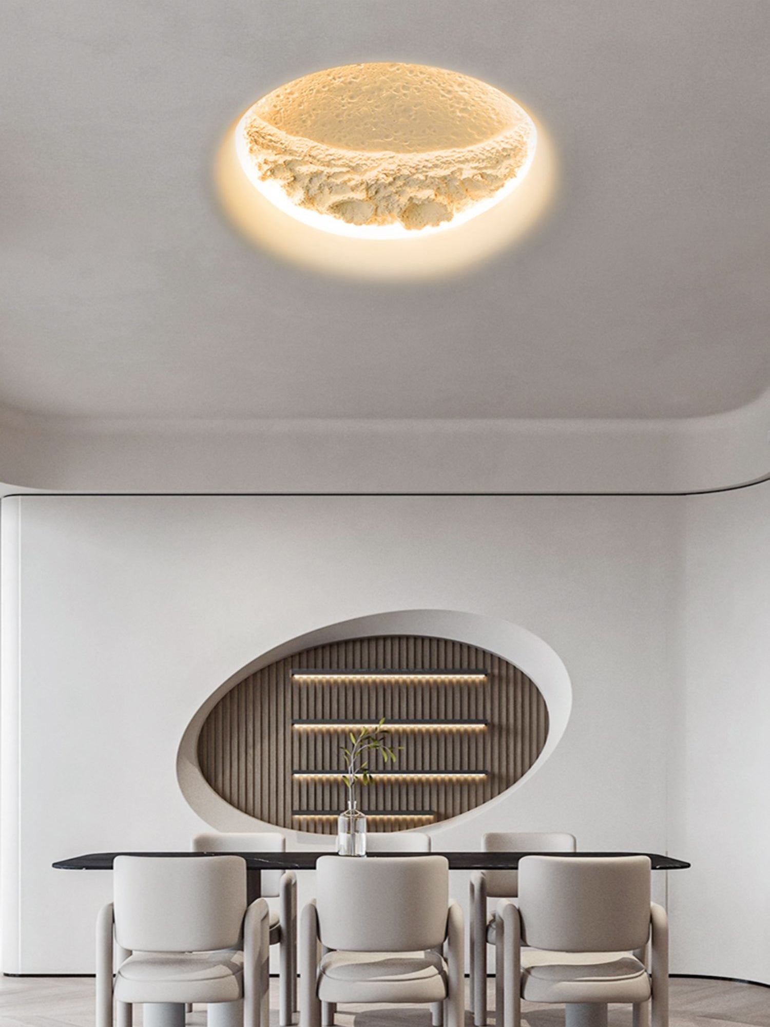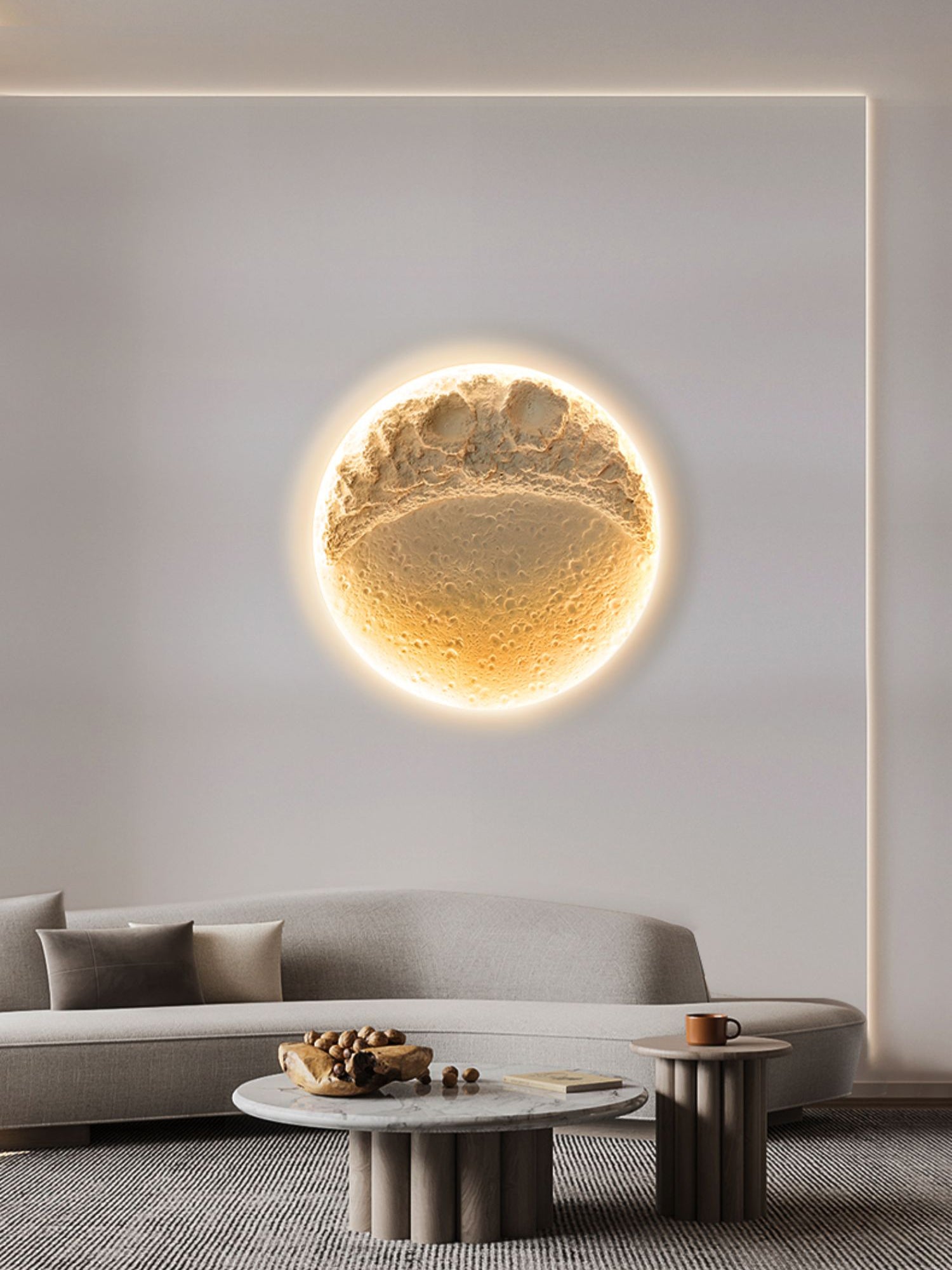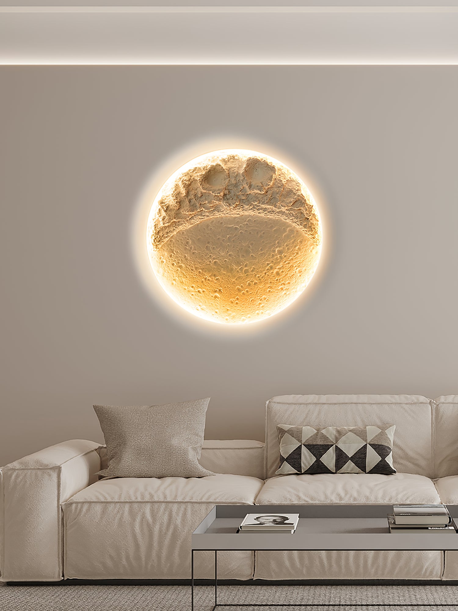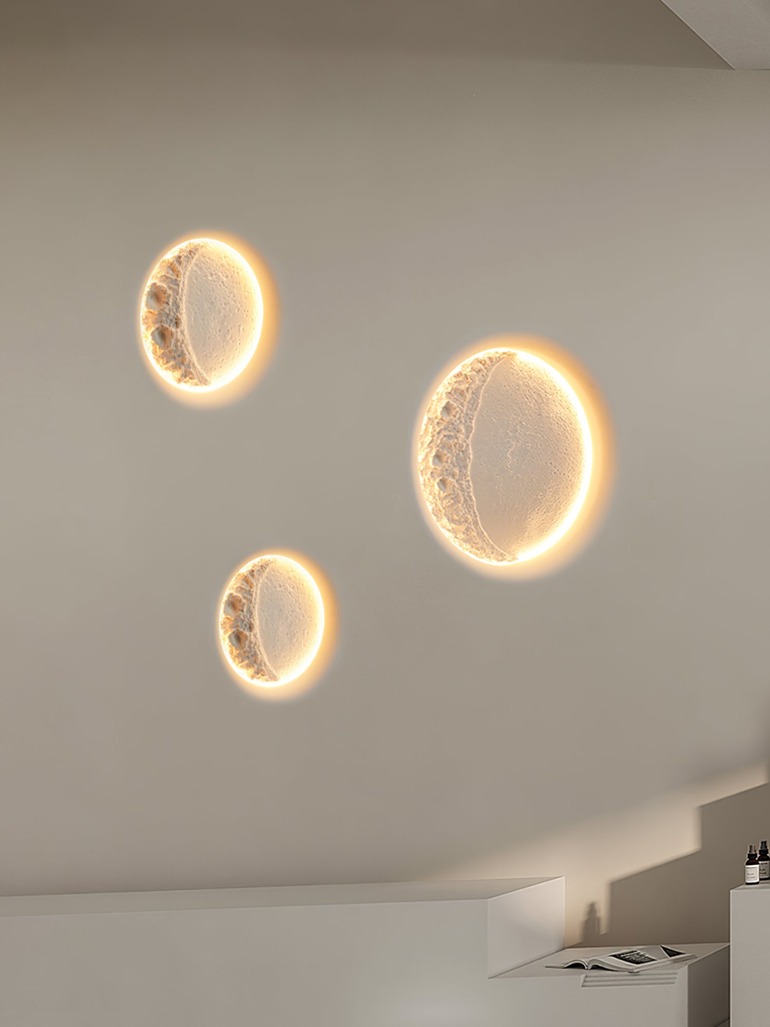 Tämä seinävalaisin on valmistettu kipsimateriaalista. Sen valaisinrungon muotoilu on täynnä taiteellista tunnelmaa, ja se jäljittelee voimakkaasti kuun pinnan kraatterimallia, mikä tekee seinävalaisimesta realistisemman ja kolmiulotteisemman.