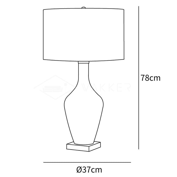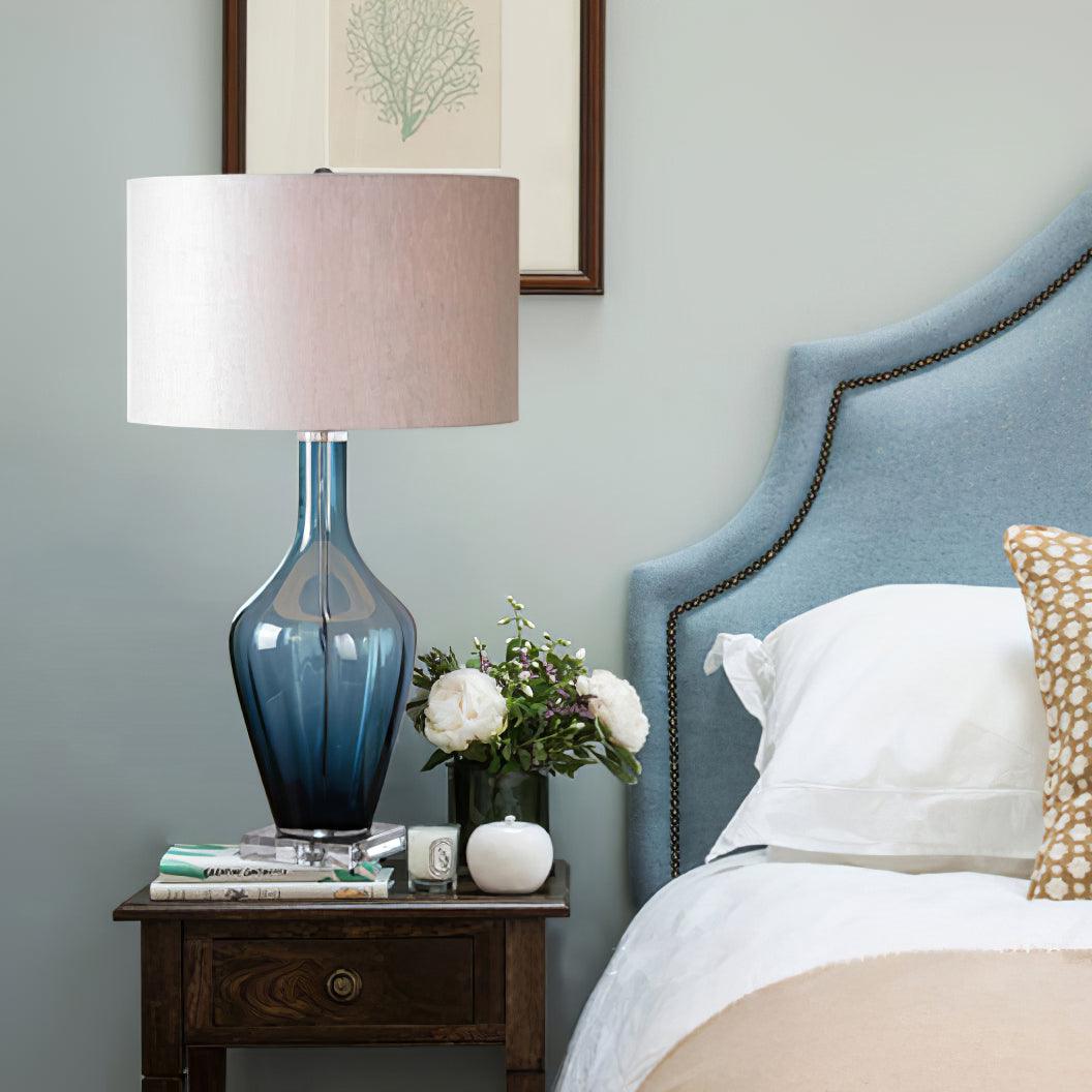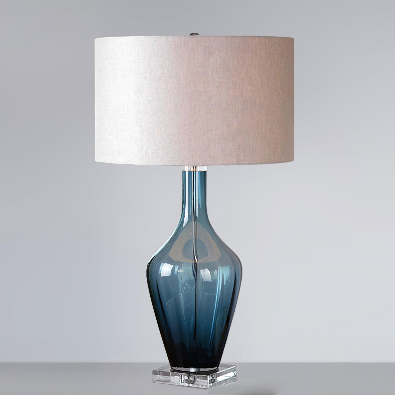 Läpinäkyvä, tumma taivaansininen lasi, jossa on kristalliyksityiskohtia. Pyöreä kovakantinen rumpuvarjostin on beige pellavakangas luonnollisilla yksityiskohdilla.