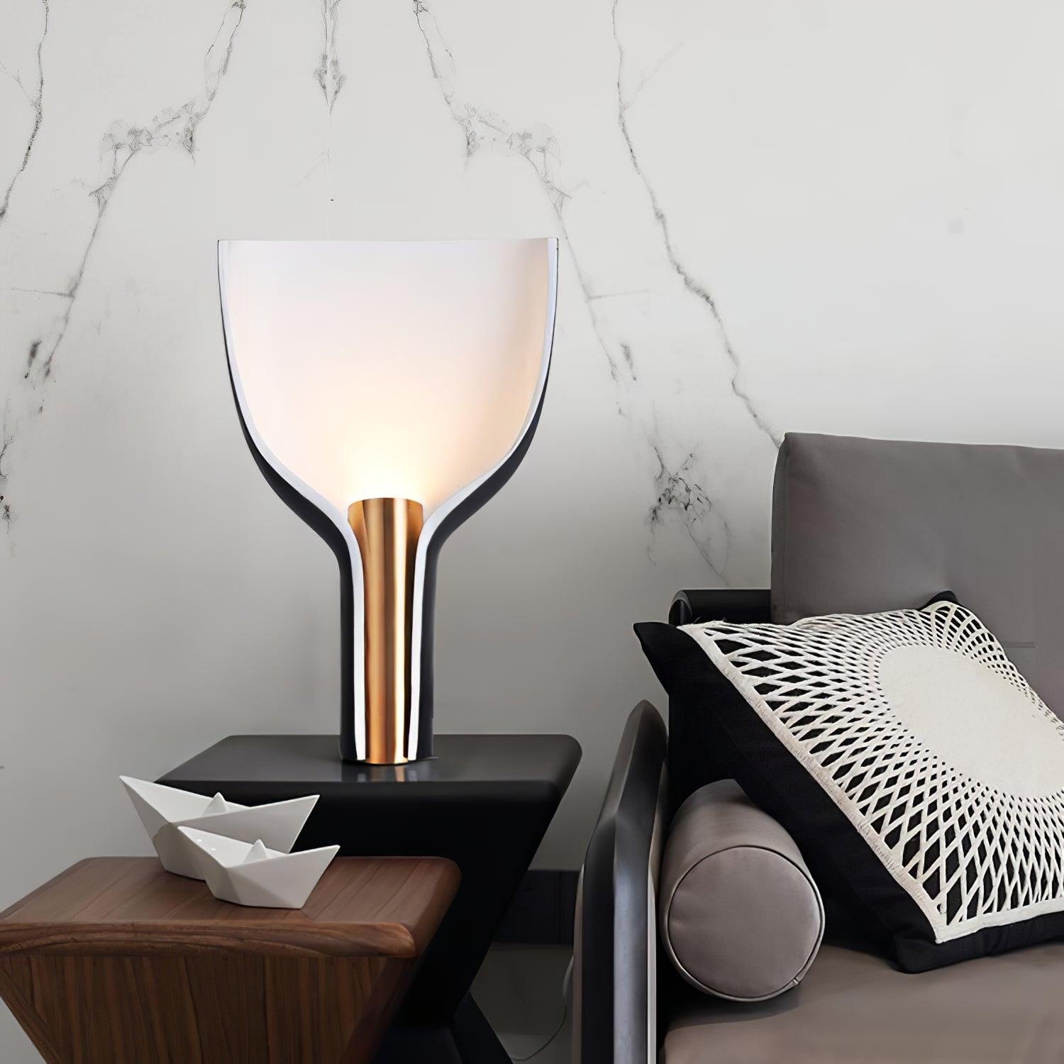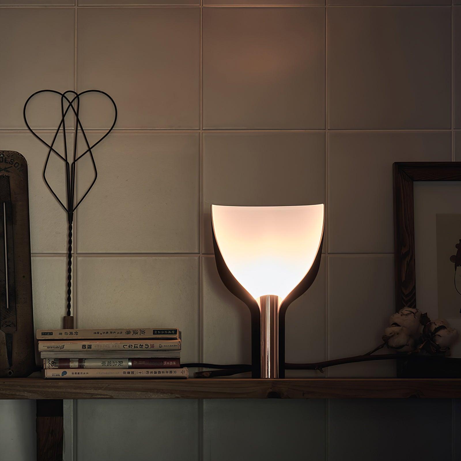 Puolisuppilon pöytävalaisin yhdistää kaksi erillistä nestemuotoa yhdeksi esineeksi. Kylmärannalla törmäävän simpukankuoren kaltaisena pyöristetty etuosa peittää valaistuksen diffuusorin, jolloin pehmeä valaistus voi turvota sisältäpäin. Kun valo on sytytetty, teksturoitujen kerrosten väliin syntyy syvyyden tunne. Valon ja pimeyden yhtenäisyys.