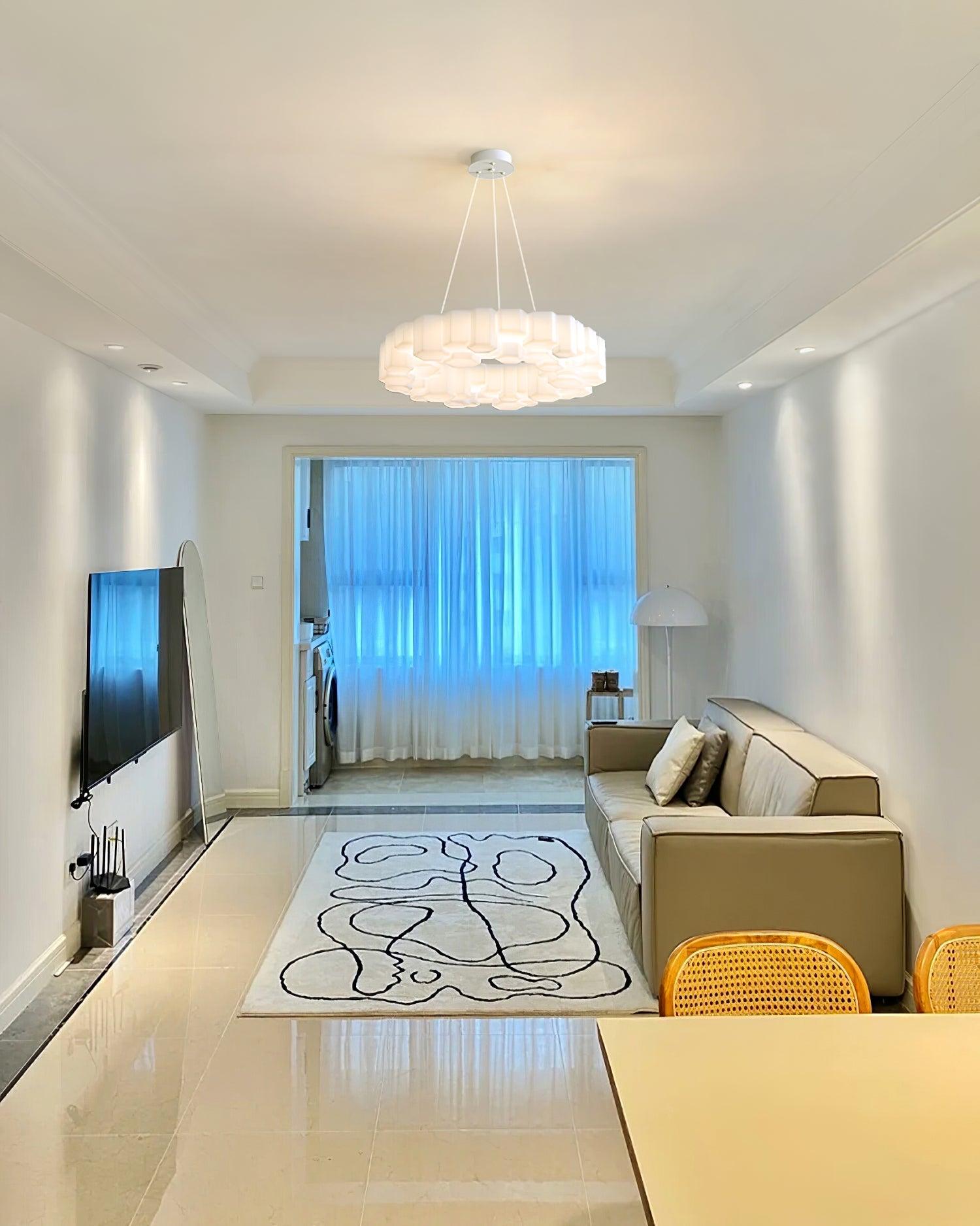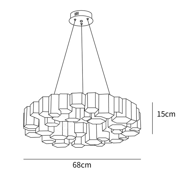 he lamput on valmistettu moduuleista kiiltävästä valkoisesta polykarbonaatista, lasimaisesta ja kestävästä materiaalista, jota käytetään. Sen muotoilu muistuttaa kuusikulmaista hunajakennojen kuviointia. Riippuvalaisimet antavat lämpimän ja miellyttävän valon.