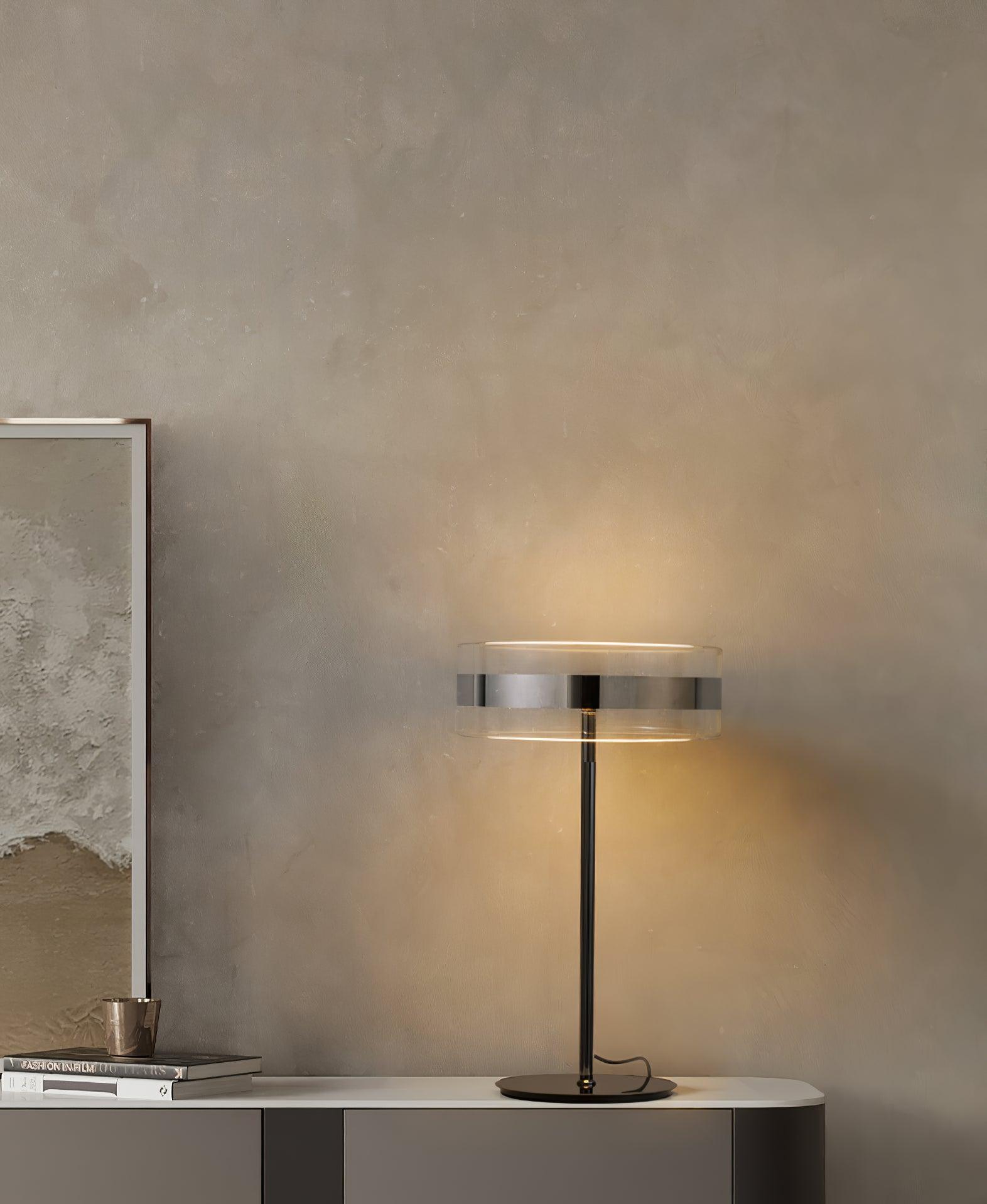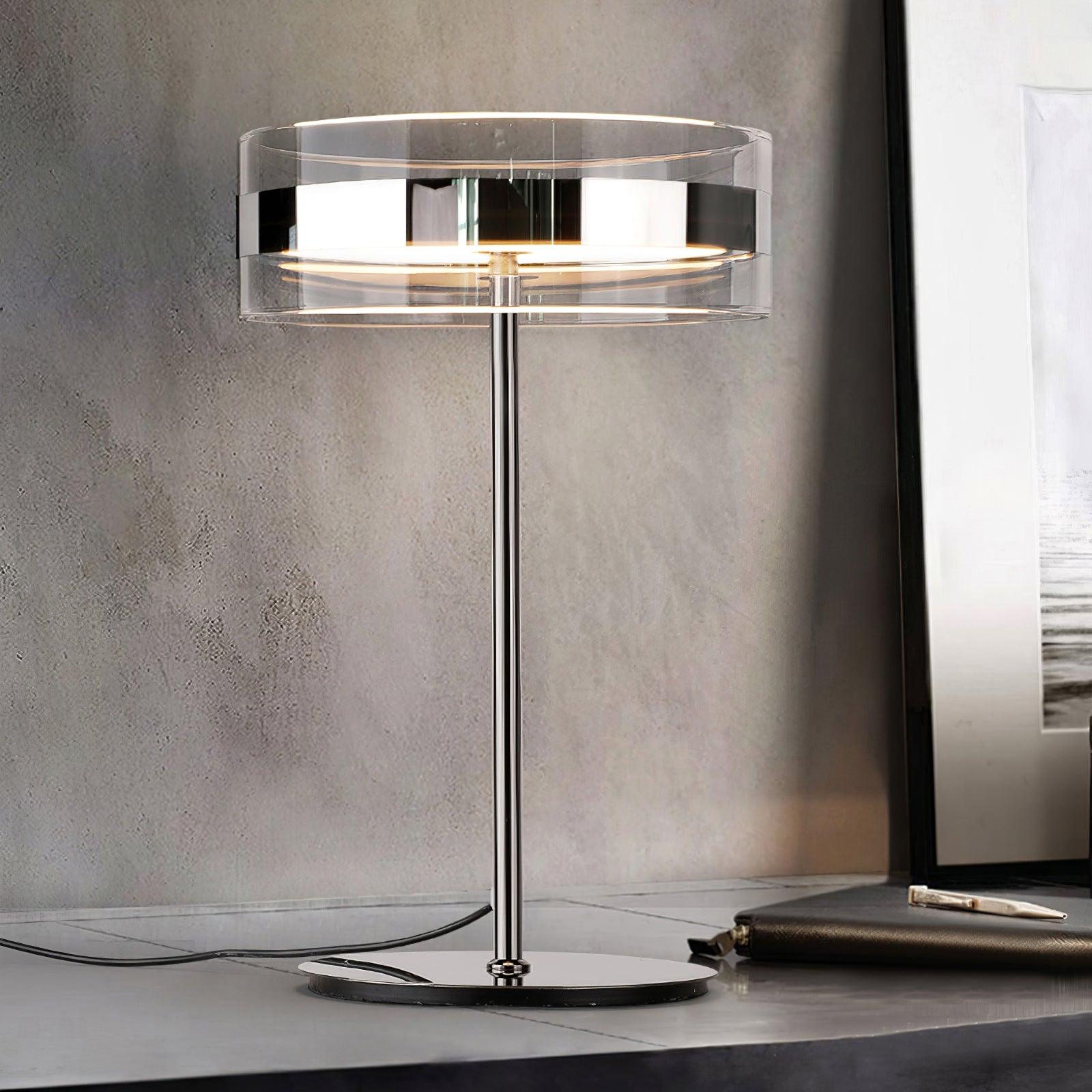 Florina-valikoiman myymälässämme oleva LED-pöytävalaisin, jossa on pyöreä pylväs, jonka varrella on sylinterimäinen lasivarjostin, johon mahtuu joukko akryyliä. tutkia korkean teknologian dematerialisoinnin ajatonta eleganssia yhdistettynä vapauteen ilmaista omaa luovuuttasi.