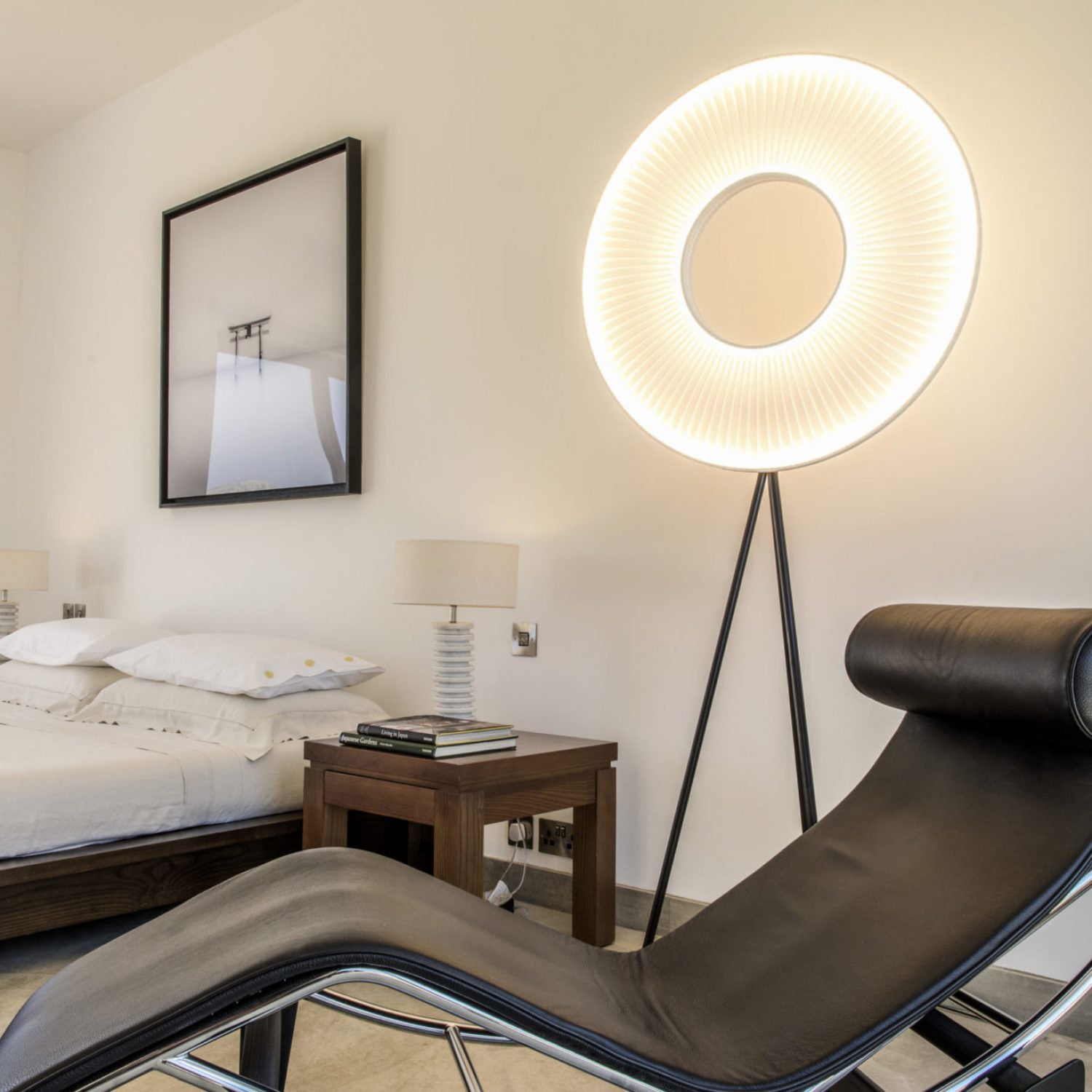 Arisha-lattiavalaisin, monirengas moderni, metalli/pii, valkoinen/musta, sängyn vieressä