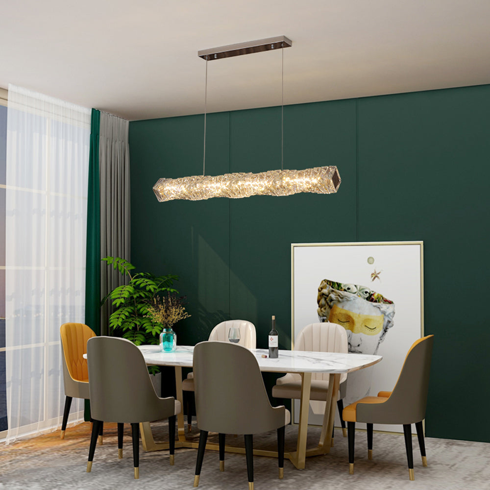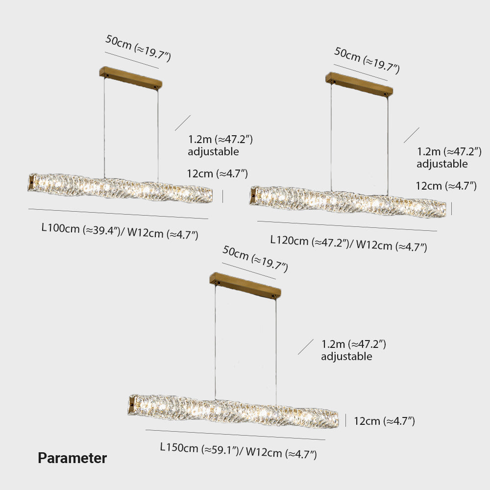 - Riippuvalaisimemme erottuva pitkä suorakaiteen muotoinen muoto vetää sinut avantgarde-suunnittelun maailmaan. Se erottuu perinteisistä valaisimista tyylikkään ja nykyaikaisen profiilinsa ansiosta. Pyörivä kristallinvärinen keskiosa antaa kappaleen yleiseen hienostuneisuudelle oikeita kosketuksia. Tuo keskustelua ja ihailua kotiisi valaisemalla se käytännöllisellä ja taiteellisella teoksella.