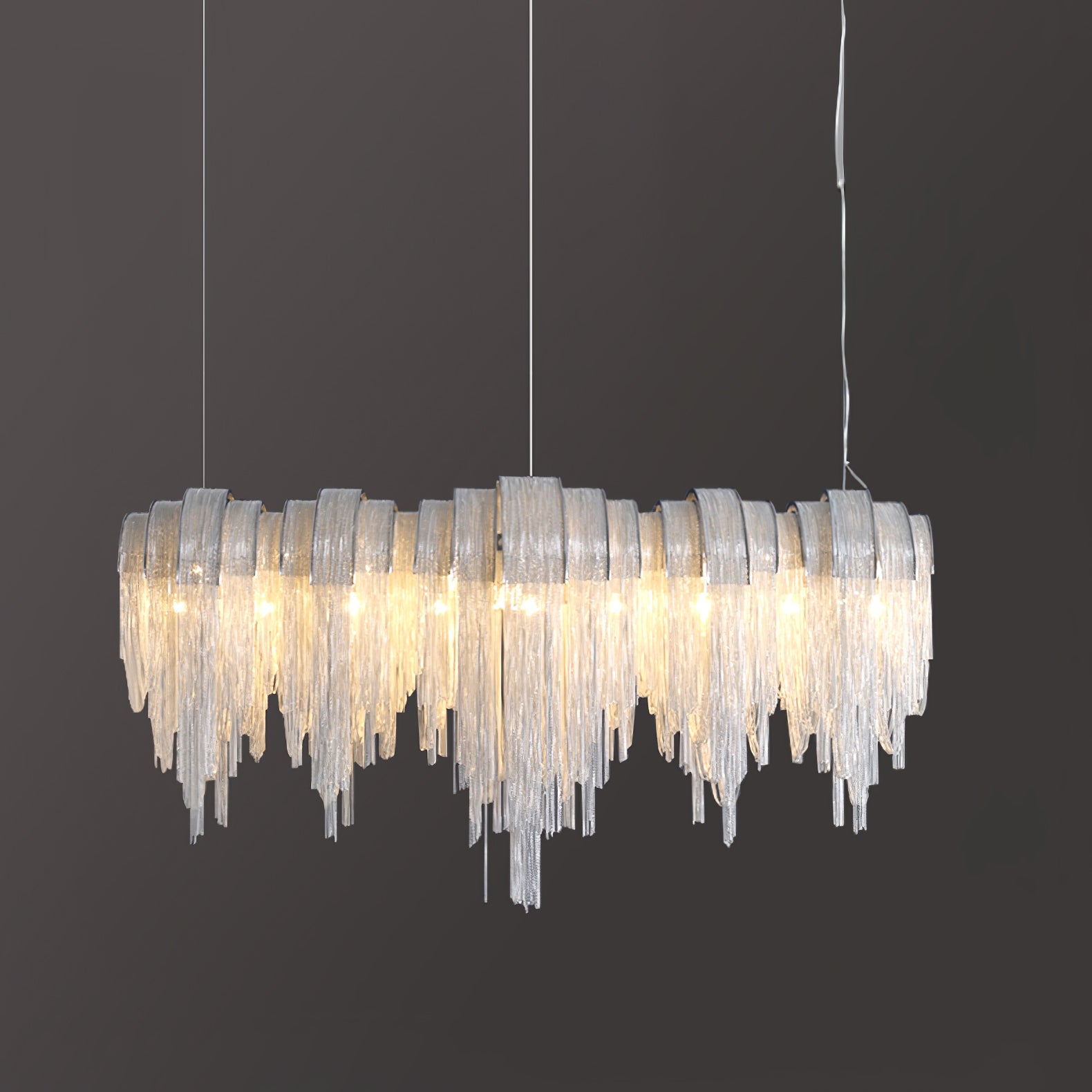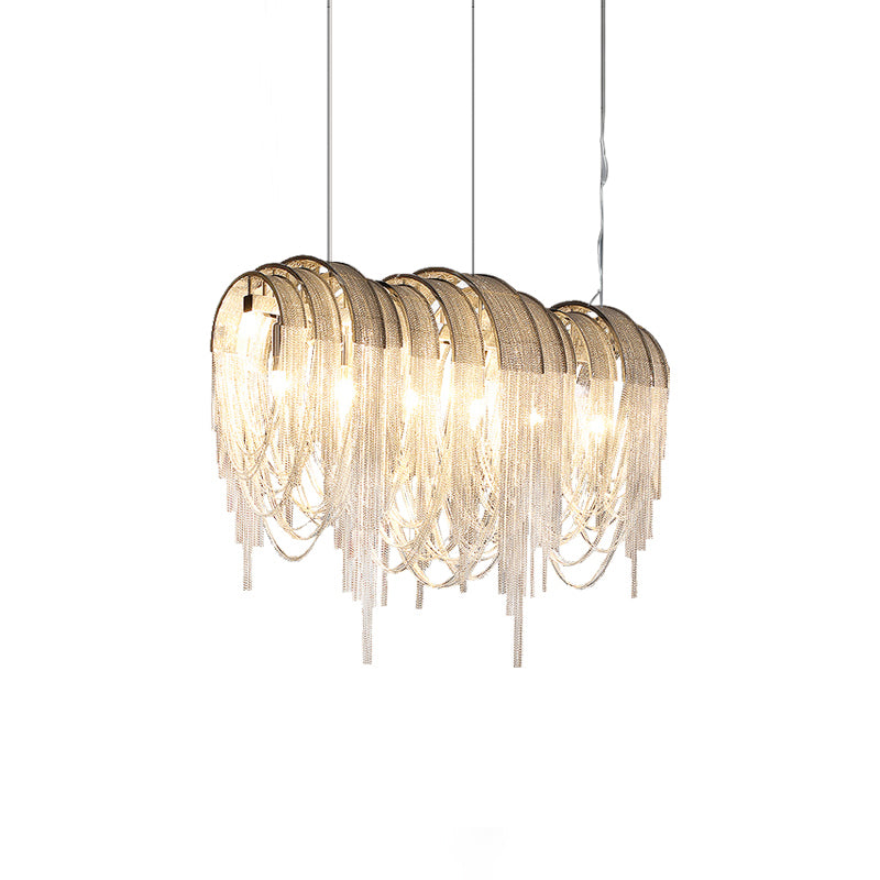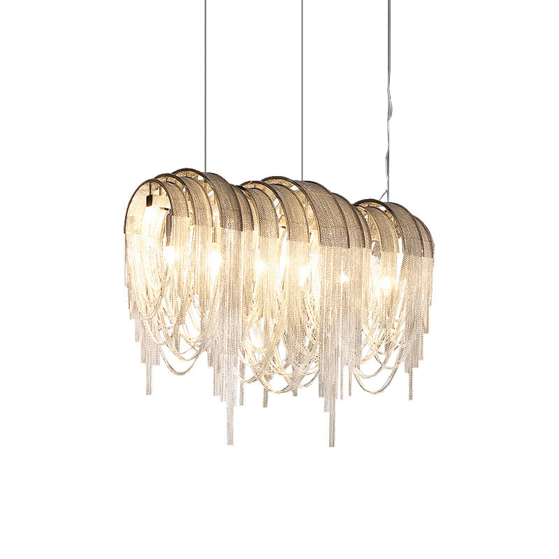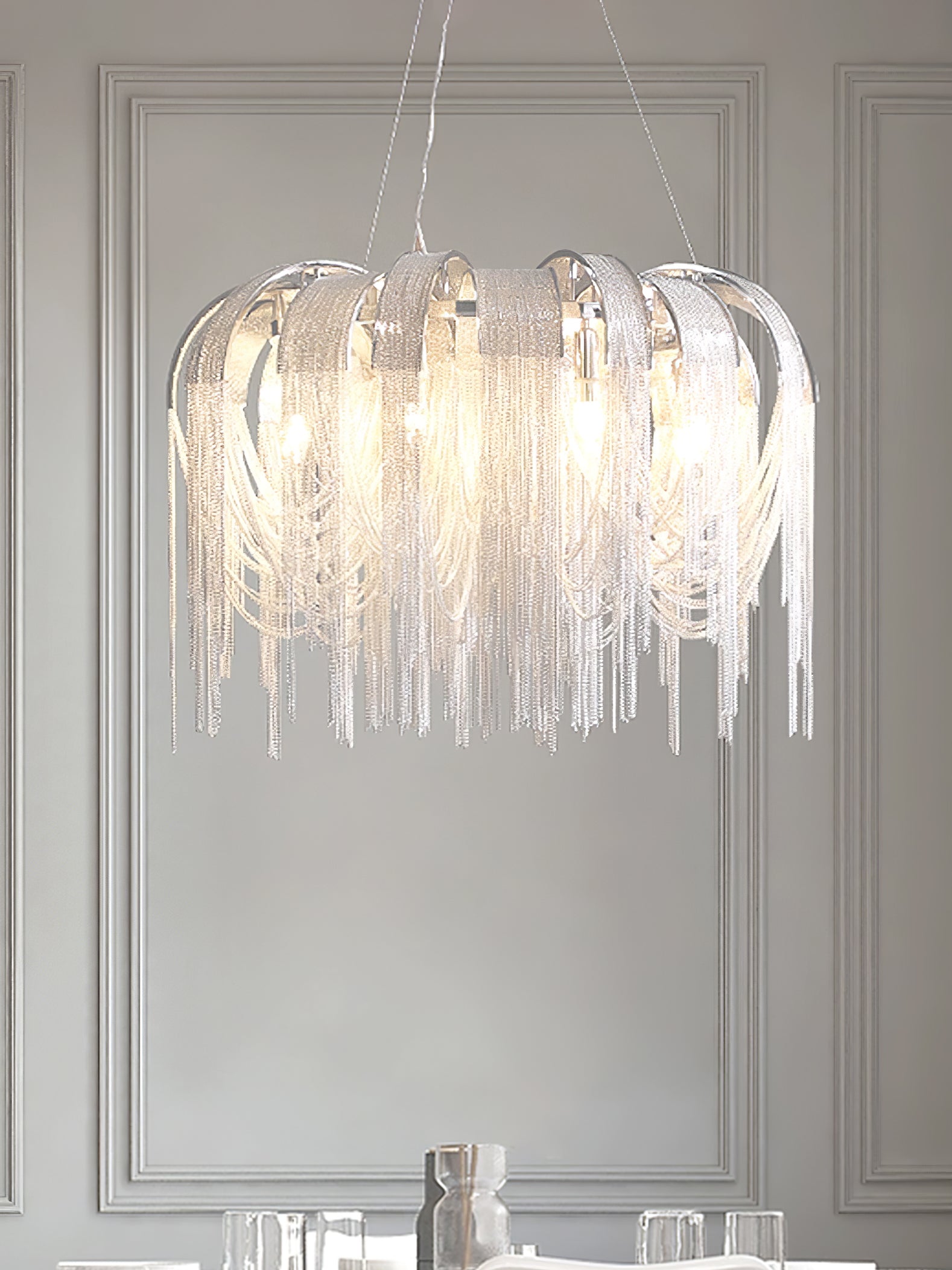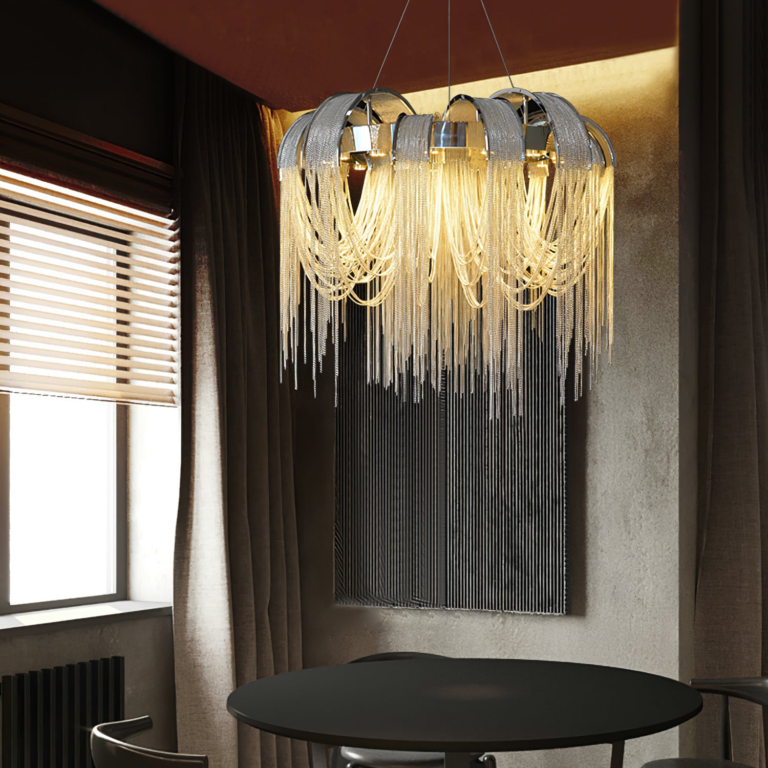 Length Chains Chandelier -kiiltävä massa kiillotettua peräkkäistä juoksevuutta korostaa ylellisyyttä ja yhdistää yrityksen esteettisen kiinnostuksen tyylikkäästi päällystettyihin metalliketjuvalaisimiin energiatehokkaalla LED-tekniikalla. Pitkänomaiset nikkelipinnoitetut ketjut leviävät ylellisesti LED-valot sisältävän onton keskikehyksen ympärille ja luovat lakkaamattoman nykyaikaisen kimalteen uudelle tasolle ylellisyyttä varten.