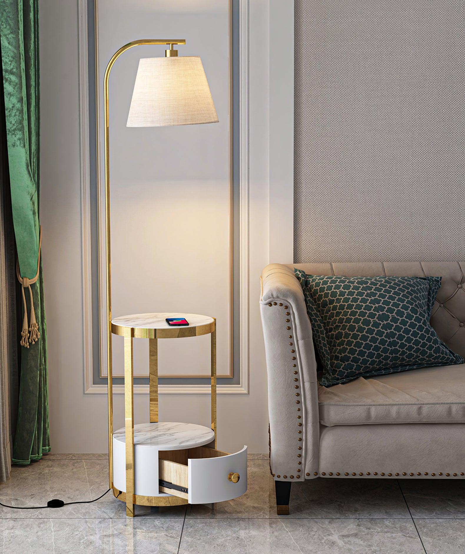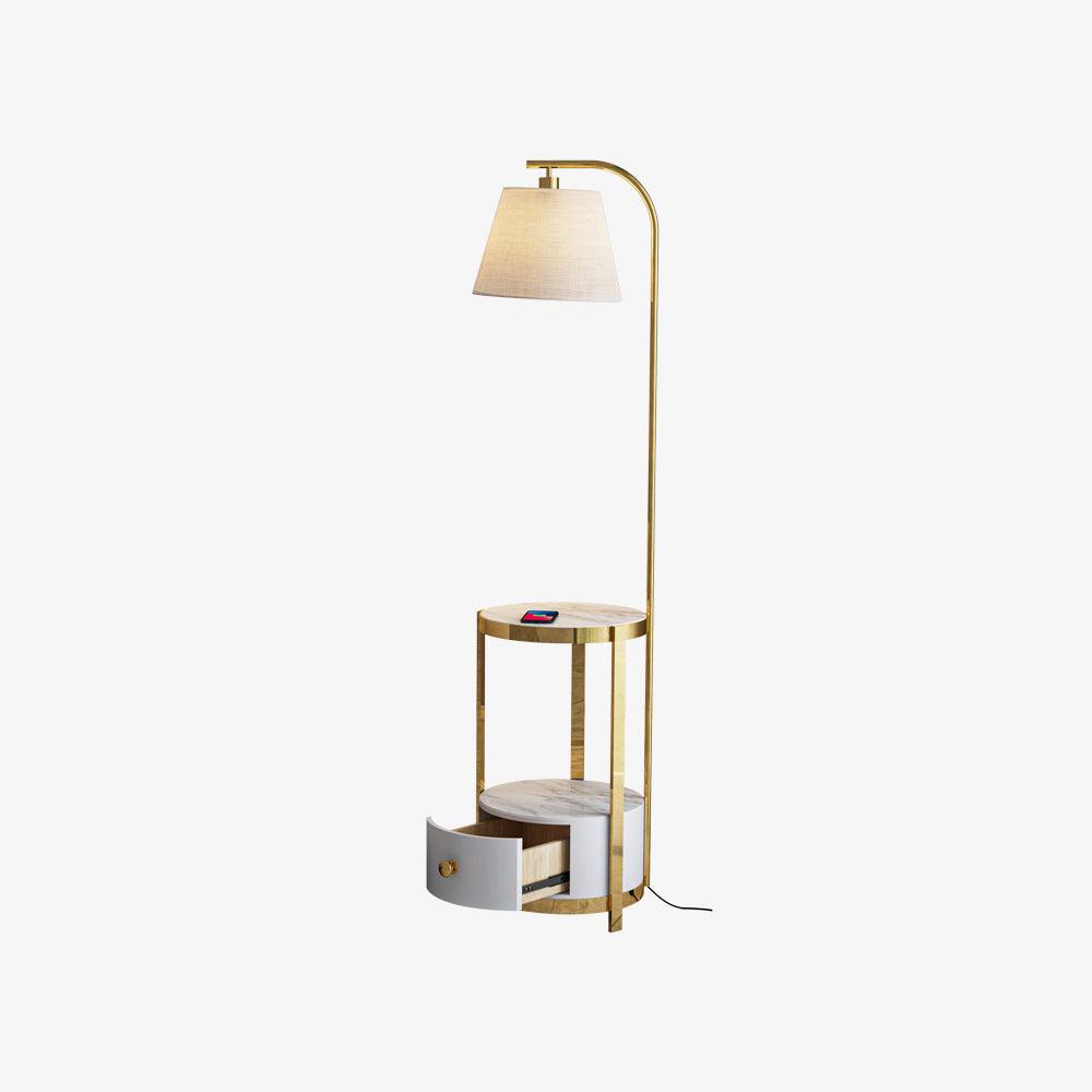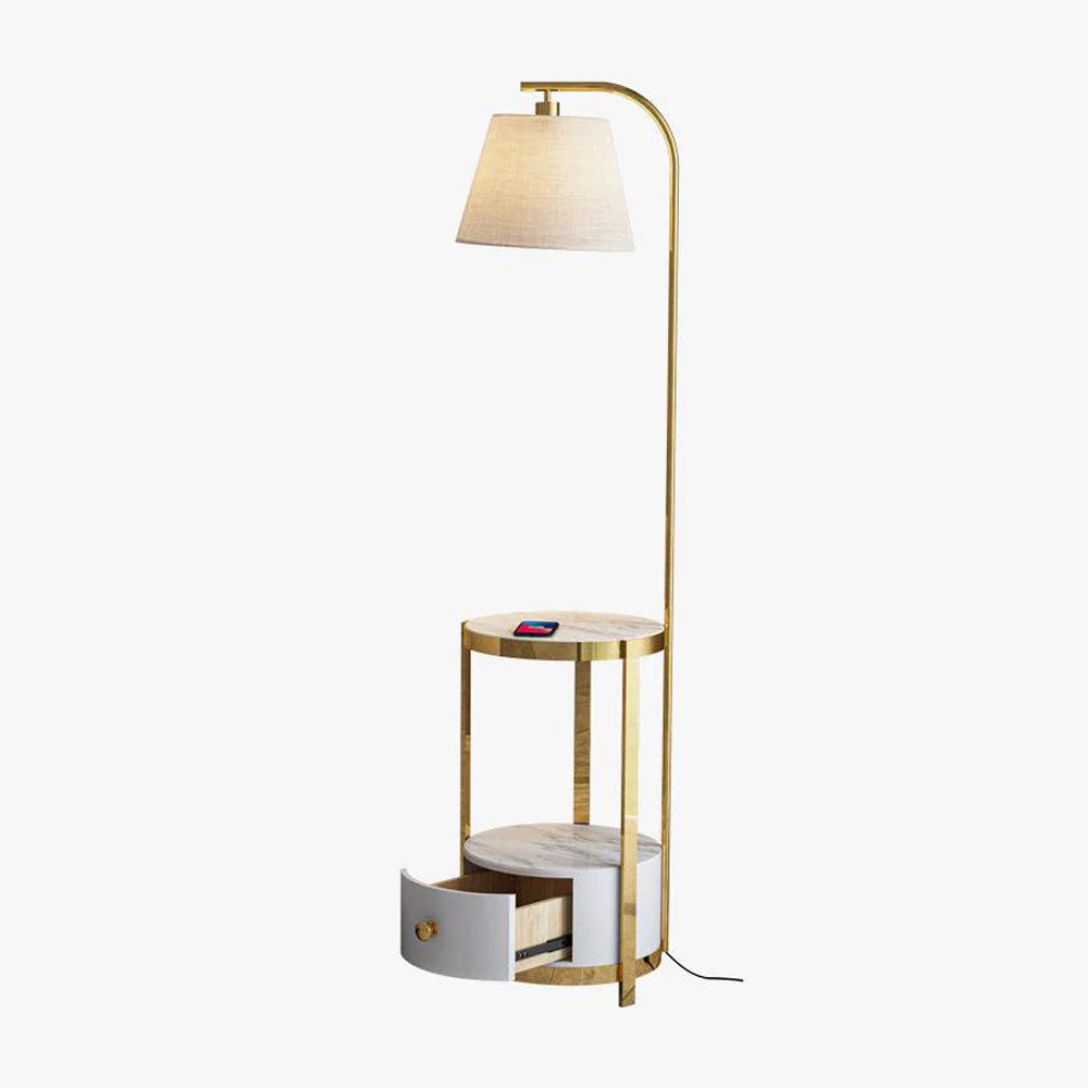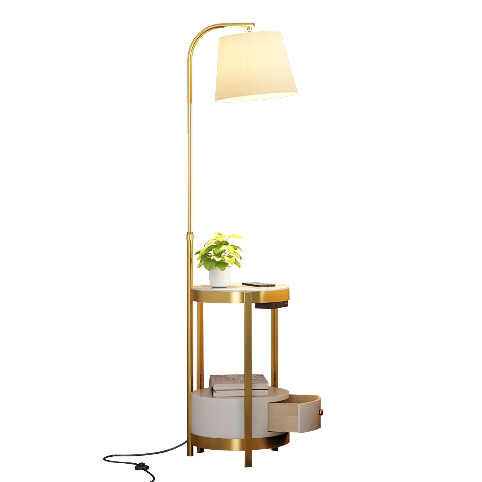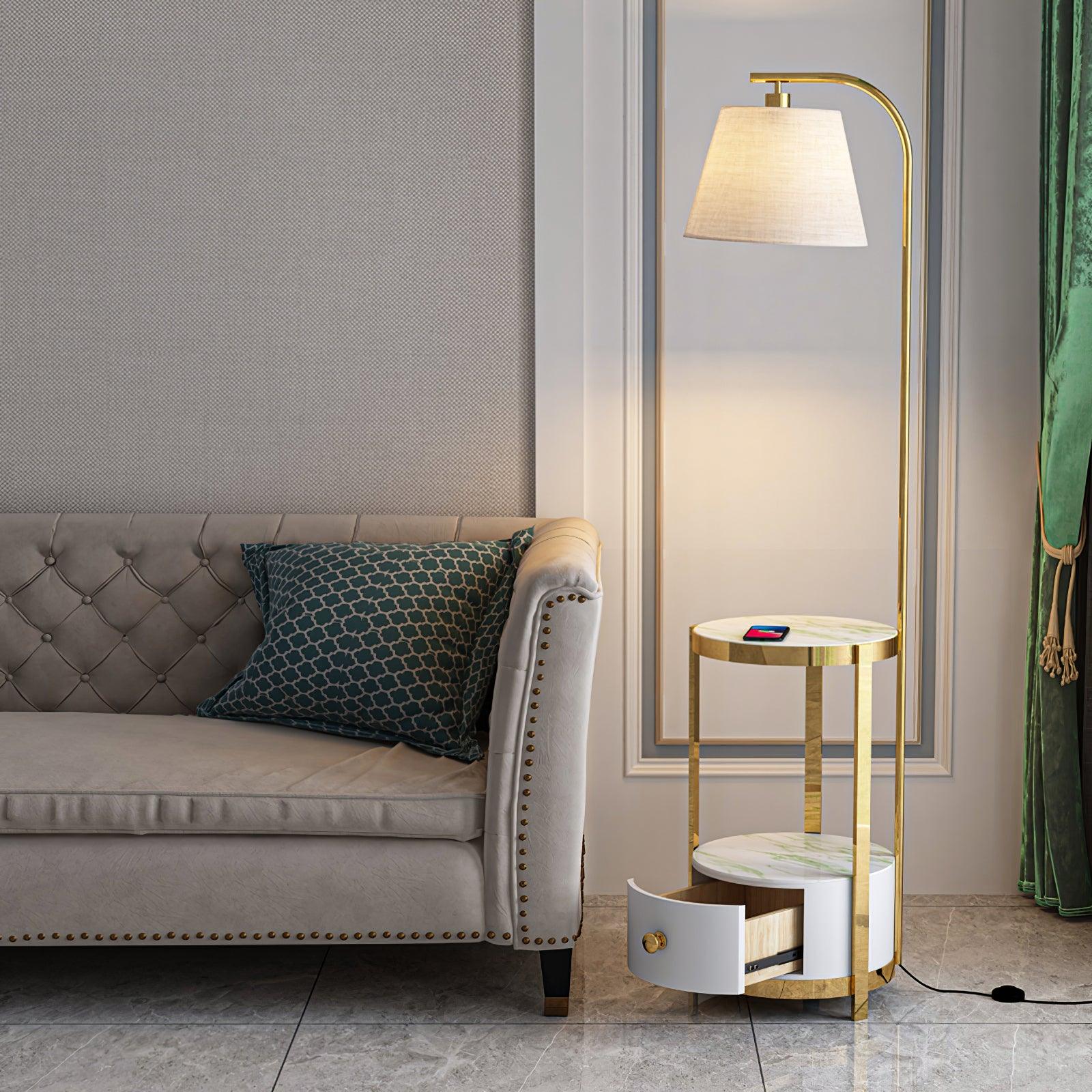 Valaise tilaasi ja lisää toiminnallinen pinta Lilah-lattiavalaisimien päätypöydällä säilytyshyllyllä. Tässä pöydän ja lampun yhdistelmässä on kullanvärinen metallijalusta, beigenvärinen rumpuvarjostin ja tekomarmorinen pöytätaso, joka on moderni lisä makuuhuoneeseen tai olohuoneeseen. Pöydän alla oleva säilytyshylly tarjoaa runsaasti tilaa puhelimesi, kaukosäätimet, kirjat ja muut pienet esineet.