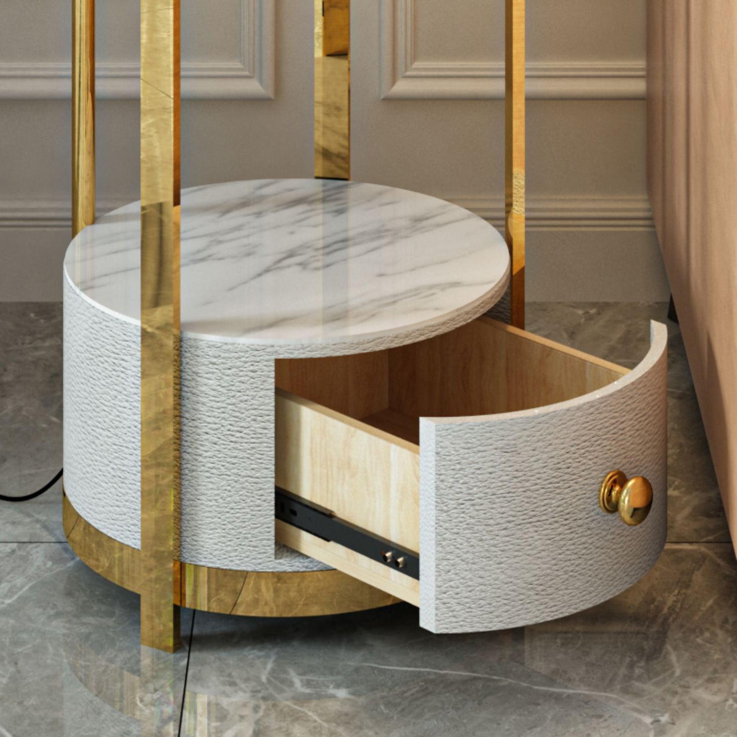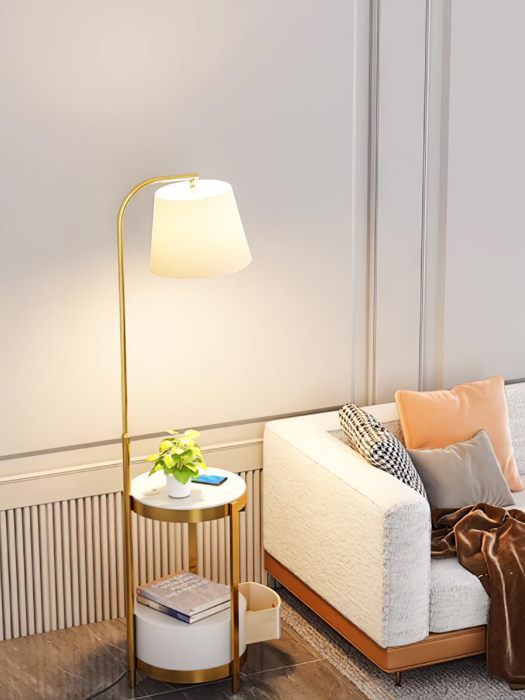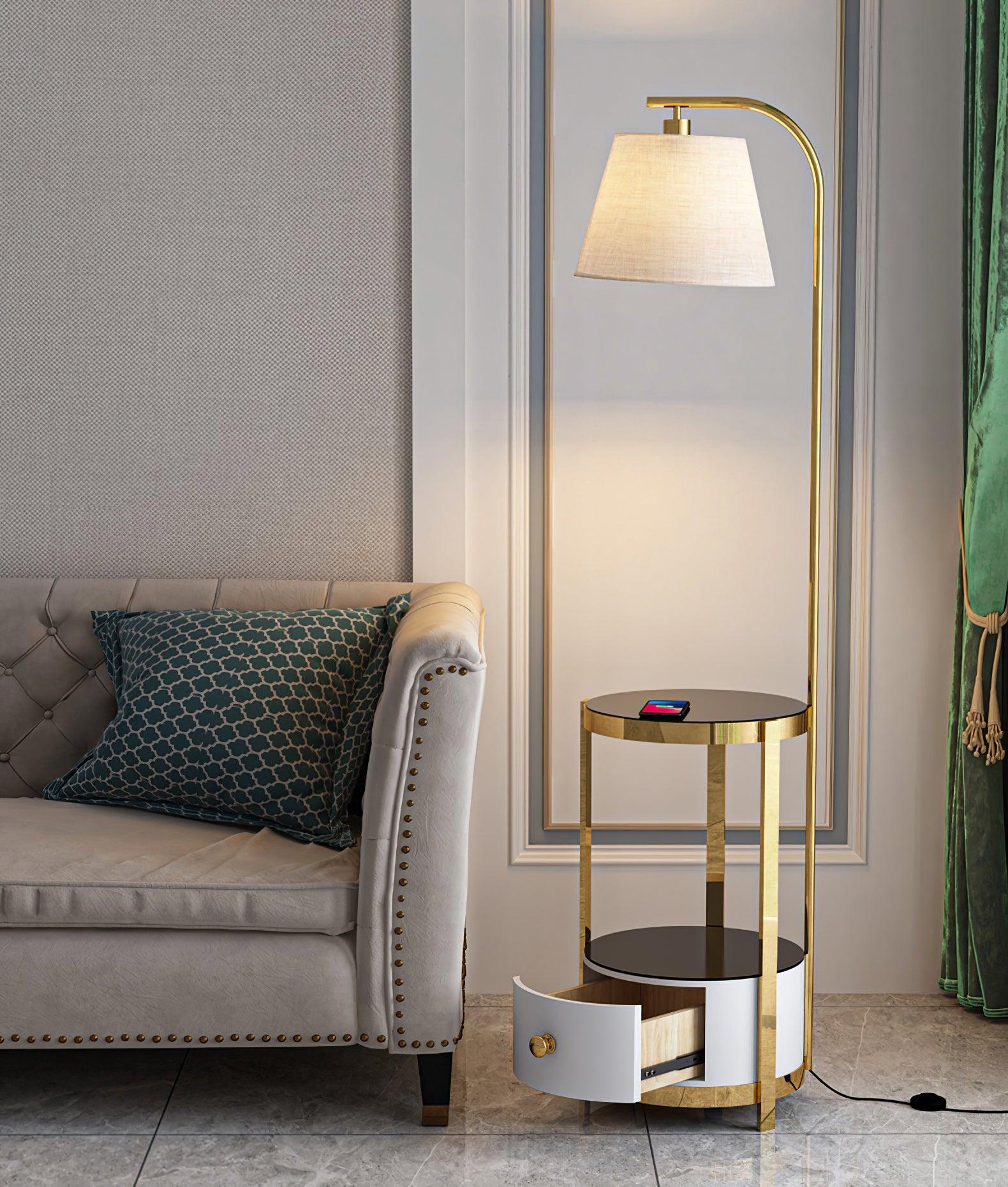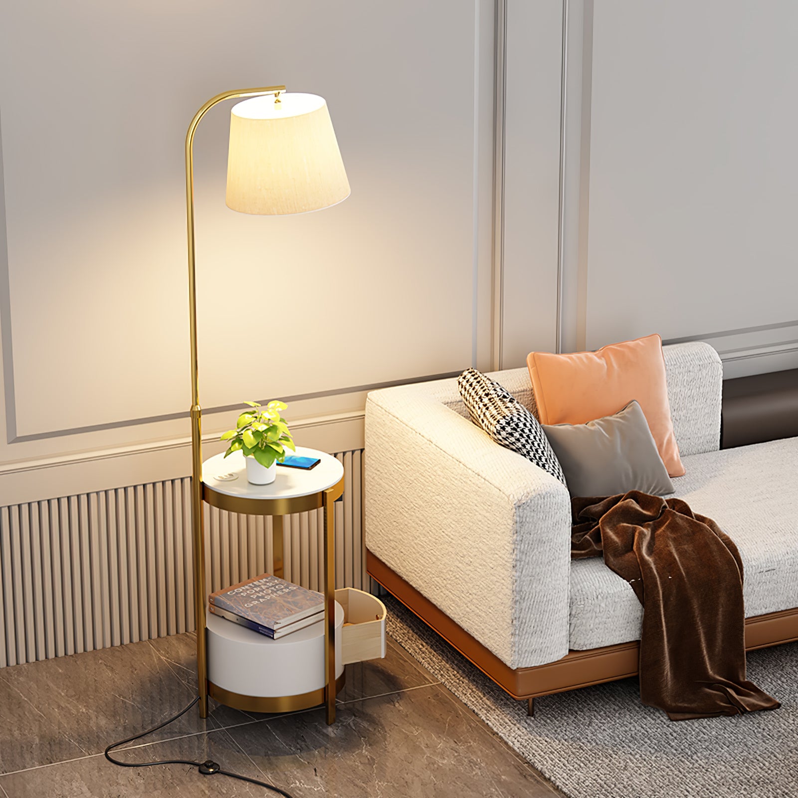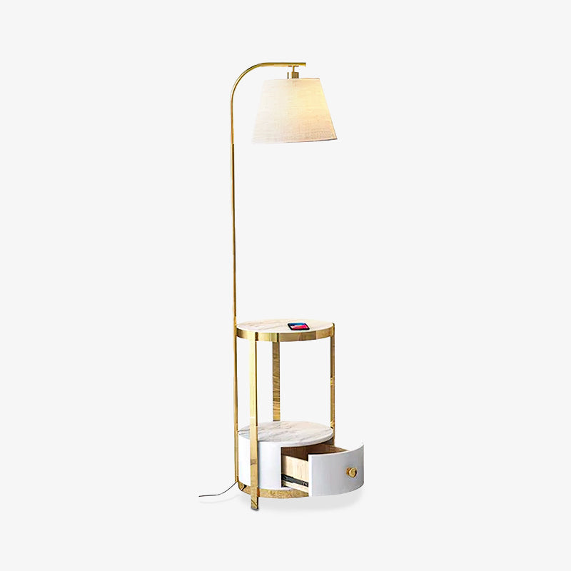Valaise tilaasi ja lisää toiminnallinen pinta Lilah-lattiavalaisimien päätypöydällä säilytyshyllyllä. Tässä pöydän ja lampun yhdistelmässä on kullanvärinen metallijalusta, beigenvärinen rumpuvarjostin ja tekomarmorinen pöytätaso, joka on moderni lisä makuuhuoneeseen tai olohuoneeseen. Pöydän alla oleva säilytyshylly tarjoaa runsaasti tilaa puhelimesi, kaukosäätimet, kirjat ja muut pienet esineet.