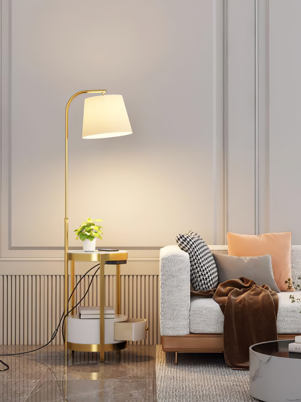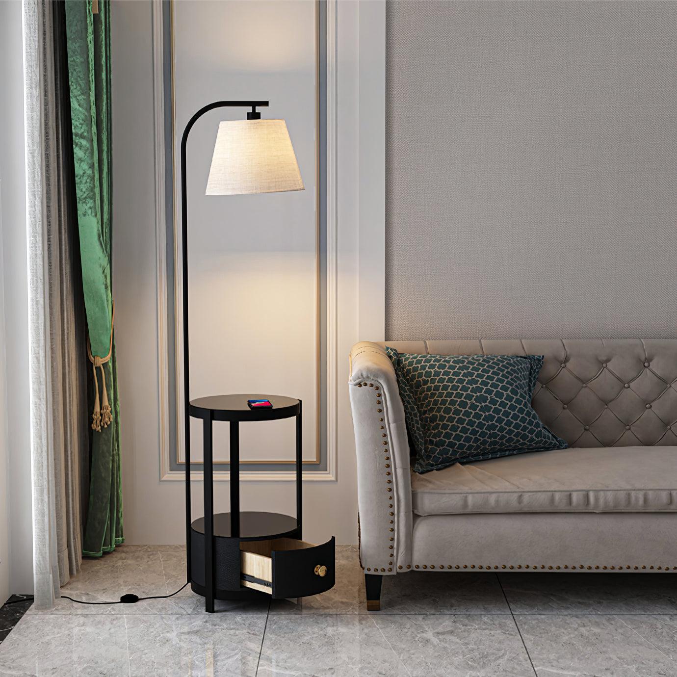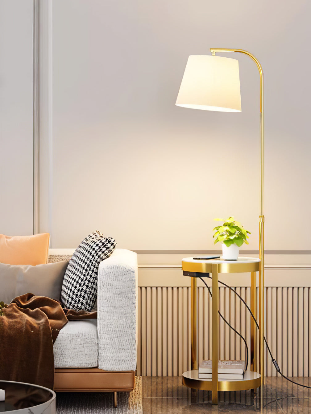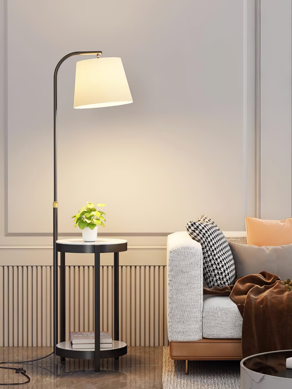 Valaise tilaasi ja lisää toiminnallinen pinta Lilah-lattiavalaisimien päätypöydällä säilytyshyllyllä. Tässä pöydän ja lampun yhdistelmässä on kullanvärinen metallijalusta, beigenvärinen rumpuvarjostin ja tekomarmorinen pöytätaso, joka on moderni lisä makuuhuoneeseen tai olohuoneeseen. Pöydän alla oleva säilytyshylly tarjoaa runsaasti tilaa puhelimesi, kaukosäätimet, kirjat ja muut pienet esineet.