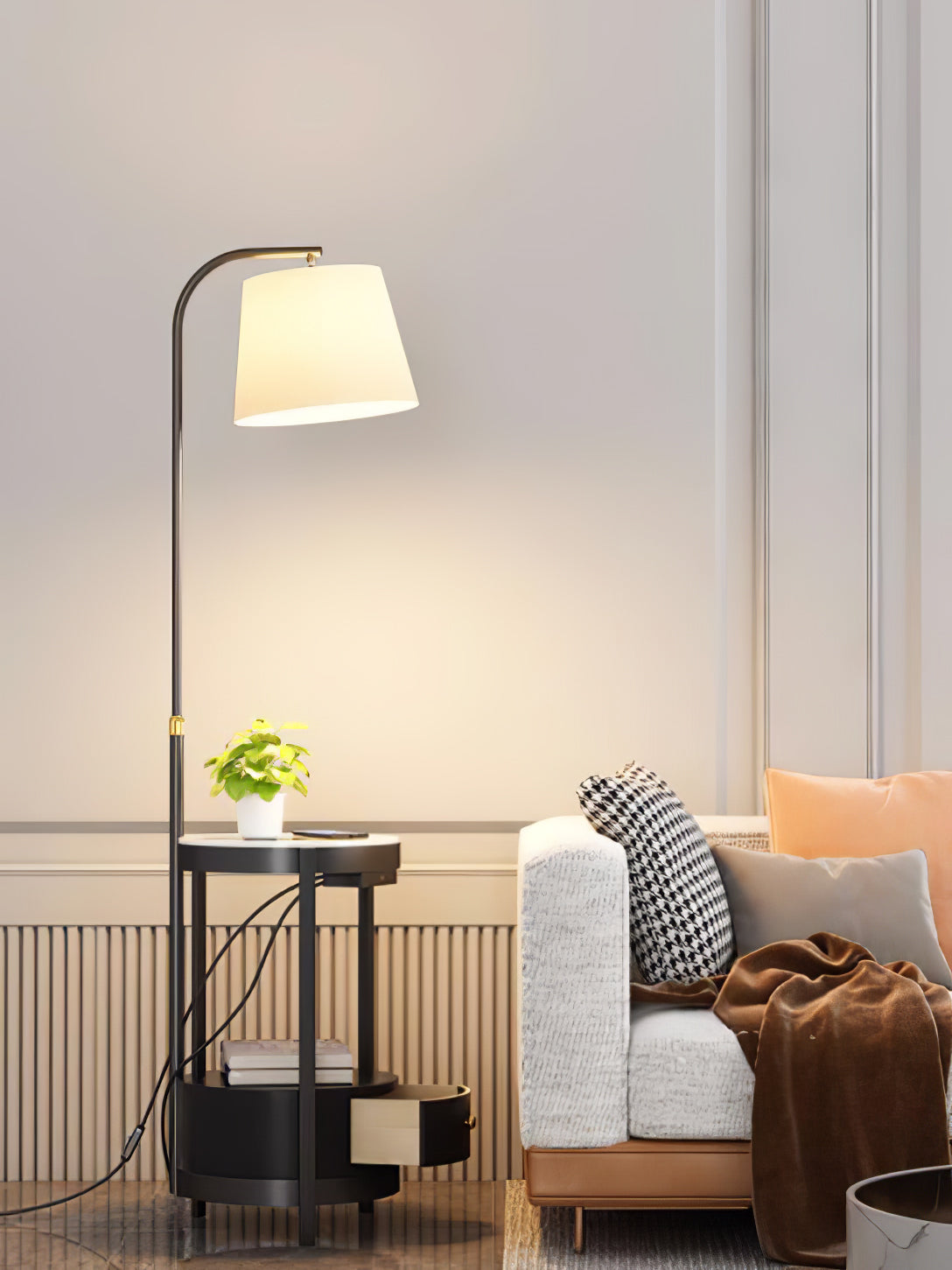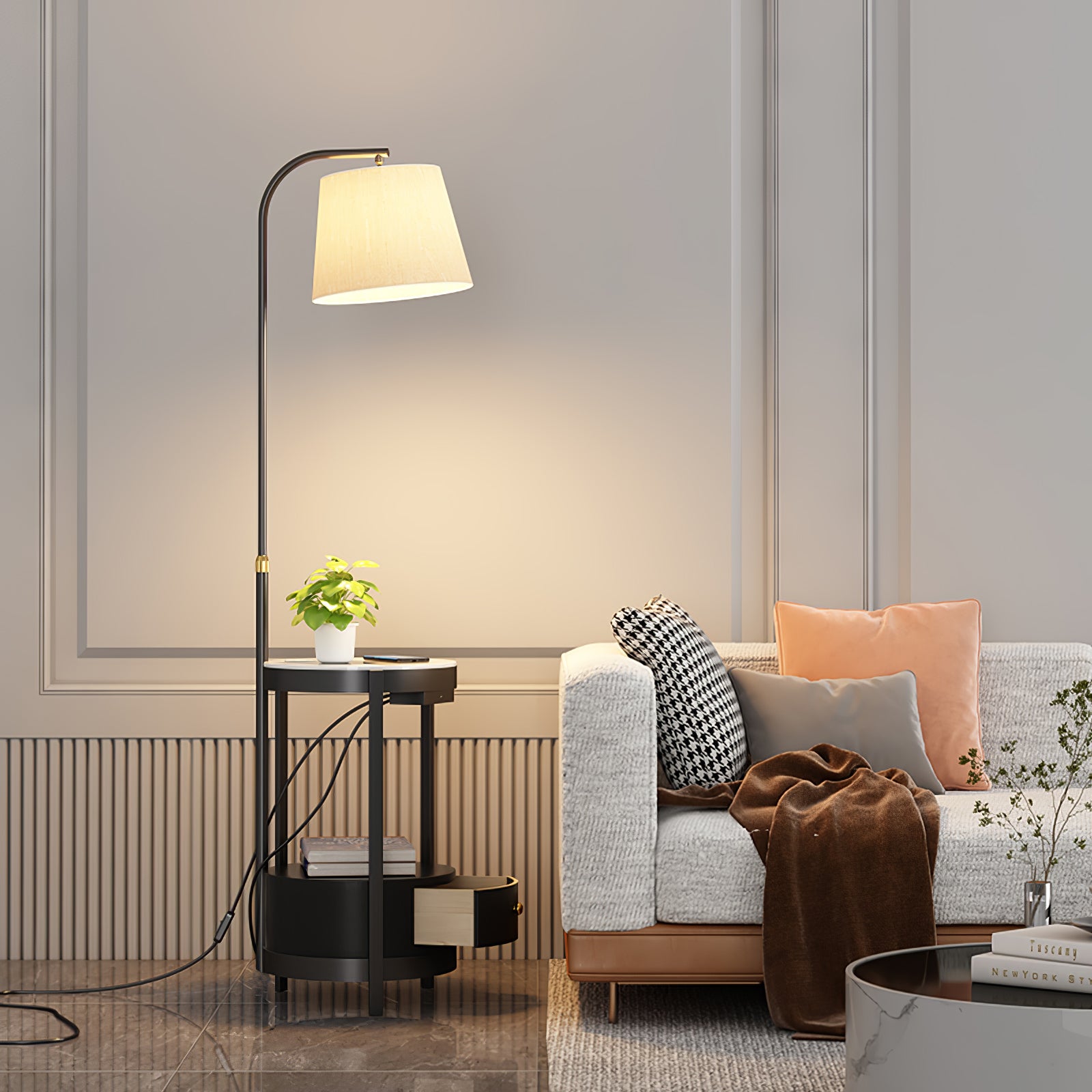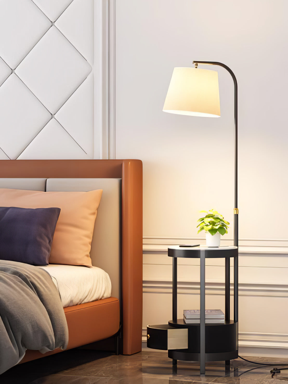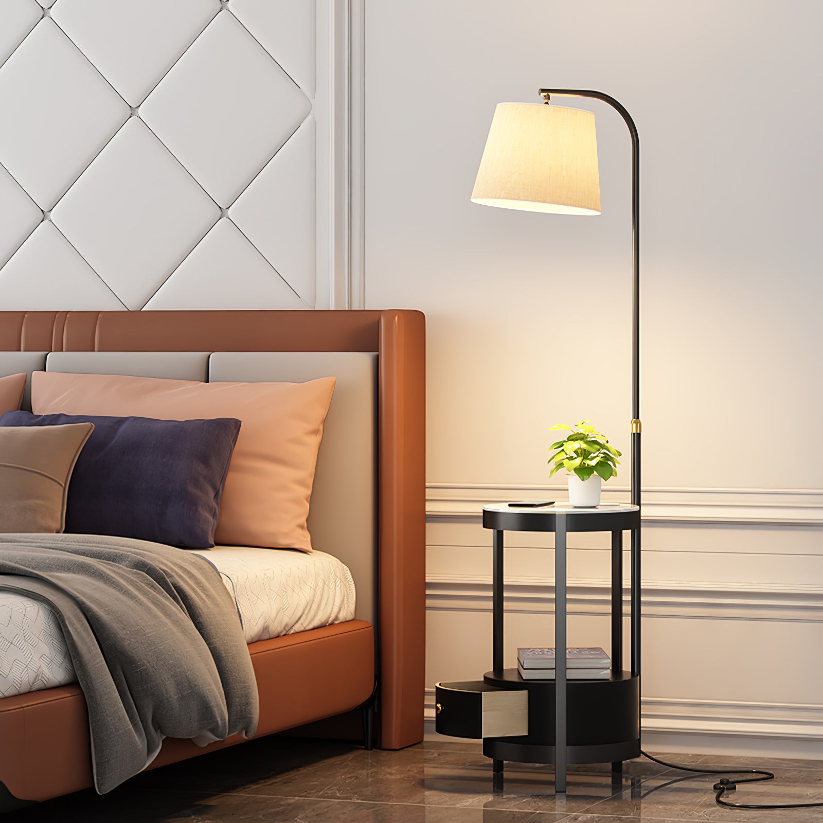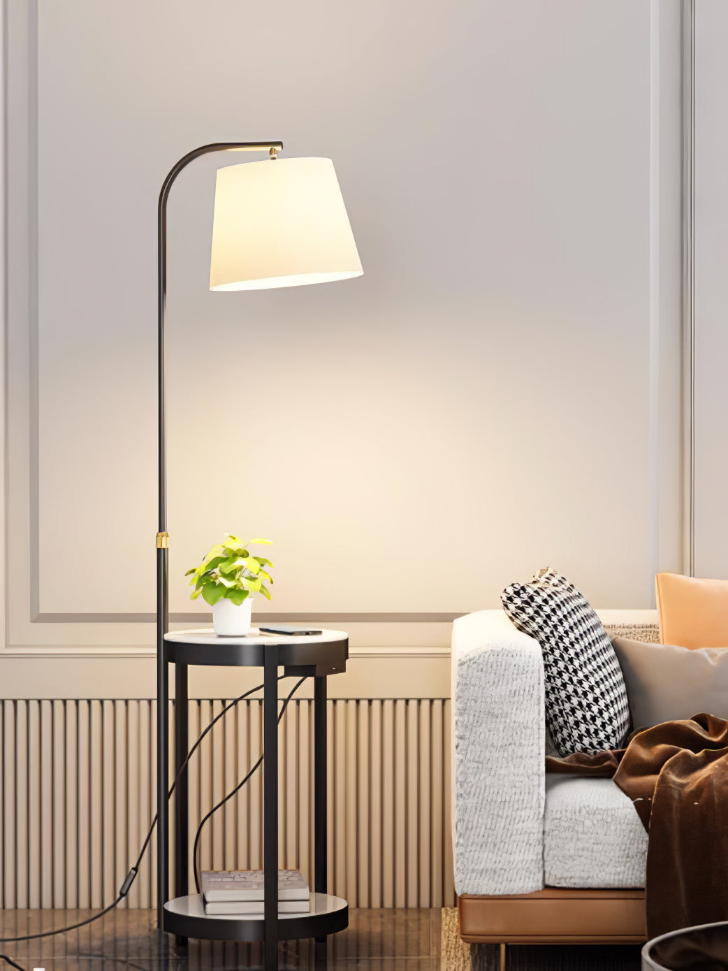 Valaise tilaasi ja lisää toiminnallinen pinta Lilah-lattiavalaisimien päätypöydällä säilytyshyllyllä. Tässä pöydän ja lampun yhdistelmässä on kullanvärinen metallijalusta, beigenvärinen rumpuvarjostin ja tekomarmorinen pöytätaso, joka on moderni lisä makuuhuoneeseen tai olohuoneeseen. Pöydän alla oleva säilytyshylly tarjoaa runsaasti tilaa puhelimesi, kaukosäätimet, kirjat ja muut pienet esineet.