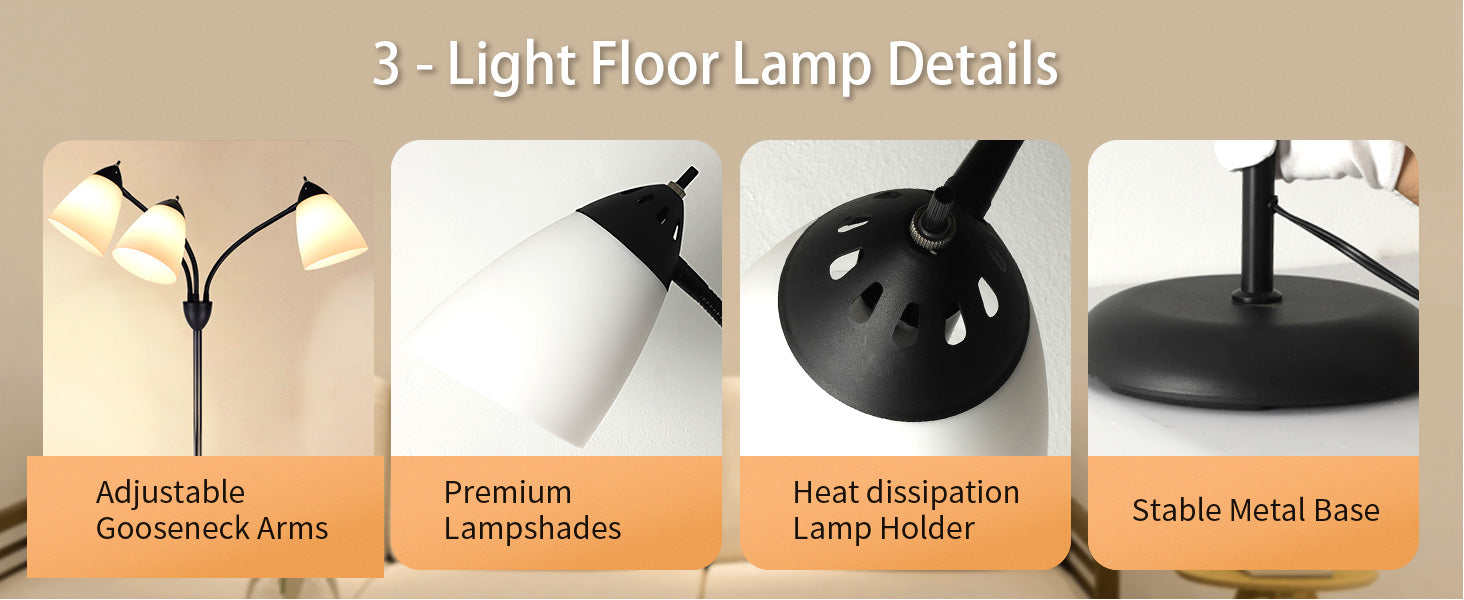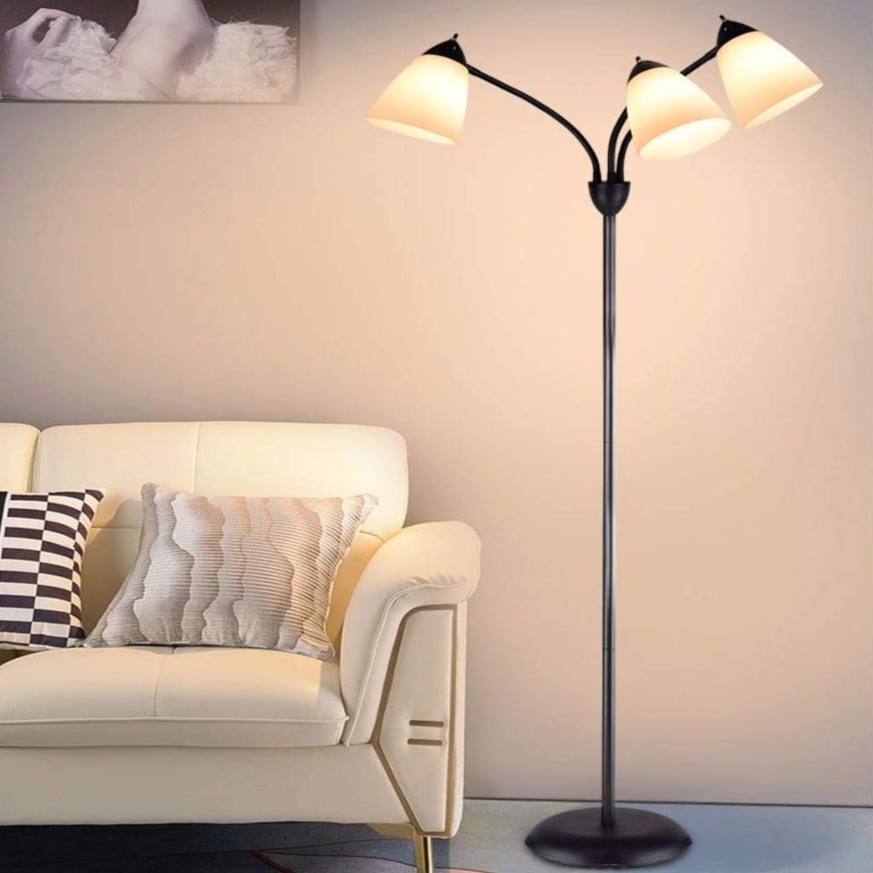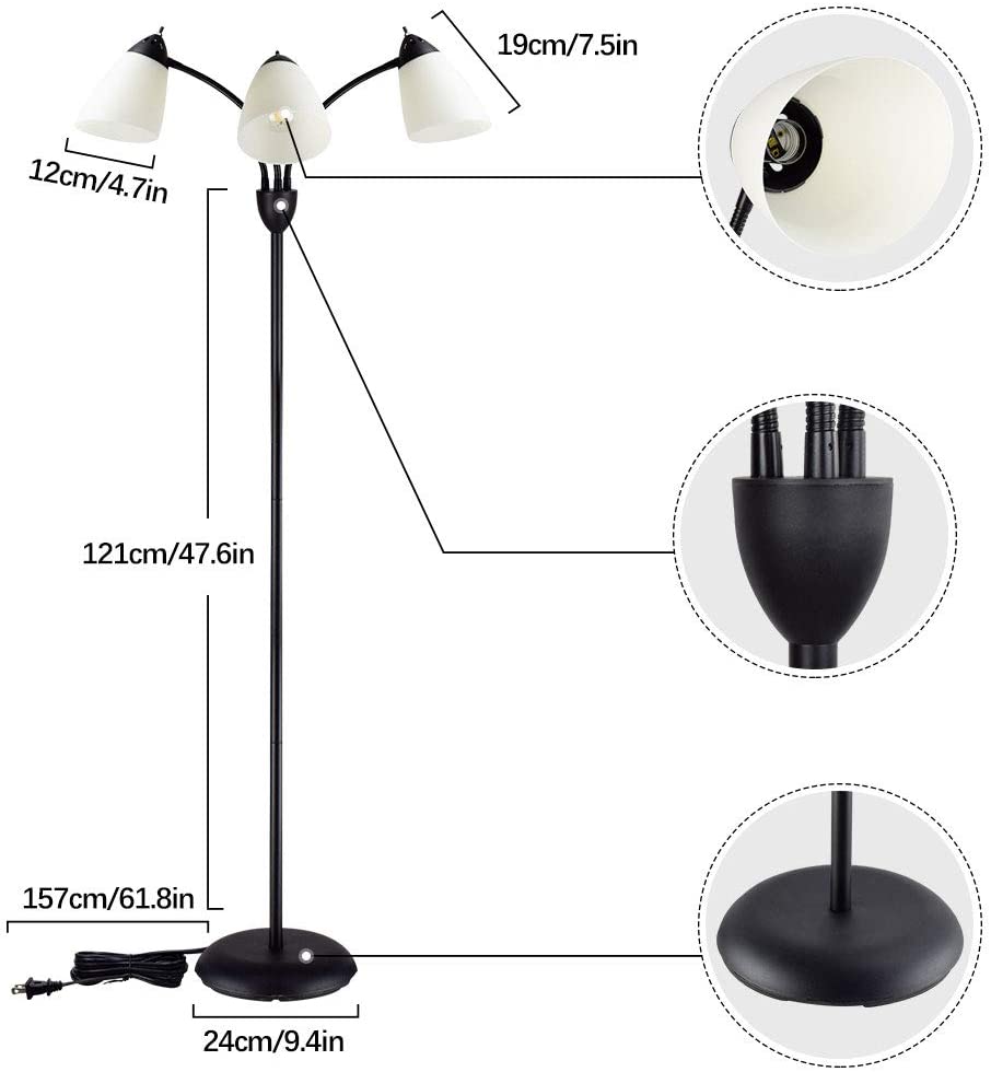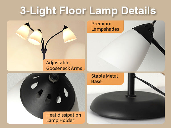 Depuleyn moderni lukulattiavalaisin, 3-valo säädettävällä joustavalla hanhenkaula-puussa seisovalla lampulla olohuoneeseen, makuuhuoneeseen, työhuoneeseen, toimistoon - mustametallivalkoiset varjostim