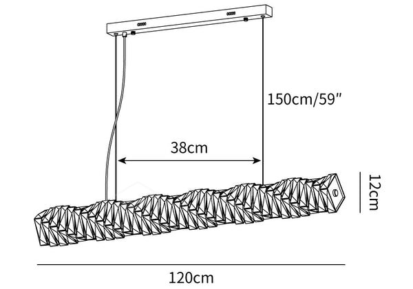 Koko: P 150 cm x K 12 cm / P 59" x K 4,7" Tiedot Materiaali: kristalli, ruostumaton teräs Valonlähde: Integroitu LED (LED-valot on rakennettu valaisimeen, eikä niitä voi vaihtaa). Kelvin-alue: lämmin valo (3000K), neutraali valo (4000K), viileä valo (6000K). Jännite: AC 110-240V Asennus: kattoon Ympäristö: Sisätilat Kosteudenkestävyys: IP 20 Kosteusluokitus, Soveltuu yleensä sisäkäyttöön, jossa se ei ole alttiina kosteudelle. Viimeistelyt: kulta, Chrome Crystal options: Clear Ohjaus: Yhteensopiva tavallisen seinäkytkimen (ei sisälly) kanssa. 59″ Säädettävä ripustuskorkeuskaapeli. Voidaan pidentää pyynnöstä.