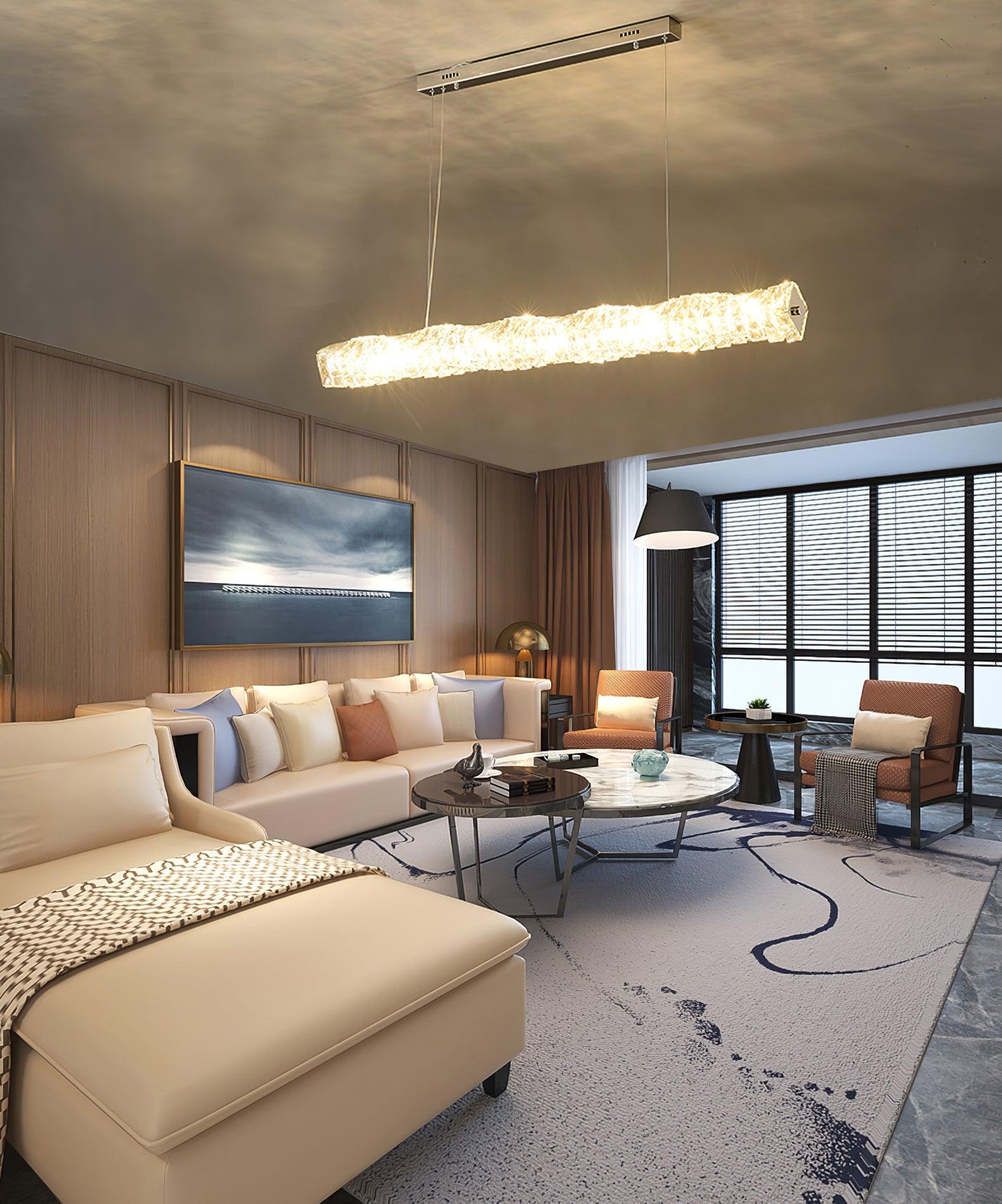 Long Crystal -riippuvalaisin sopii täydellisesti pitkien tai suorakaiteen muotoisten pöytien yläpuolelle, mutta se ei kuitenkaan olisi sopimaton keittiösaarekkeen yläpuolelle. Lineaarinen muoto soveltuu kauniisti toimintoon. Jalokiviä K9-kristallilla, joka tunnetaan prismojen erinomaisesta kirkkaudesta ja timantteja muistuttavista matalista inkluusioista tässä suhteessa ja yhtä kimaltelevasta! Taittava ja heijastava valo.