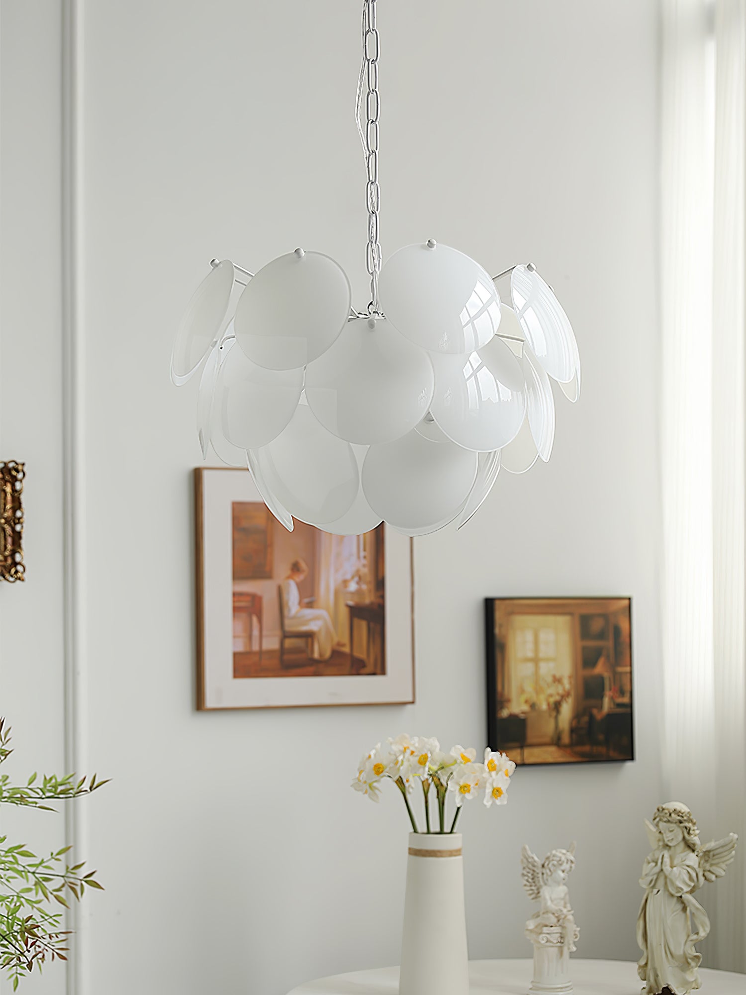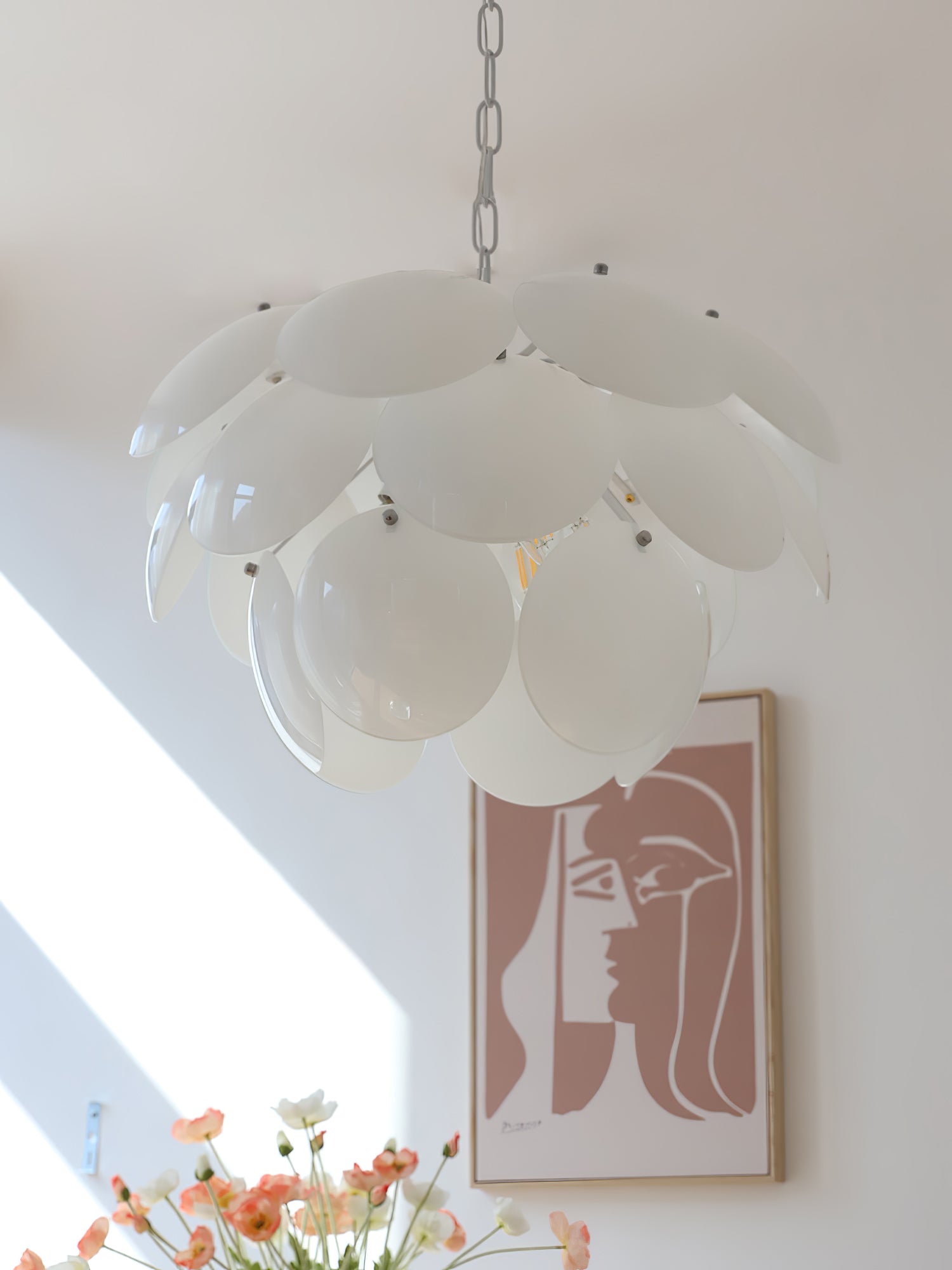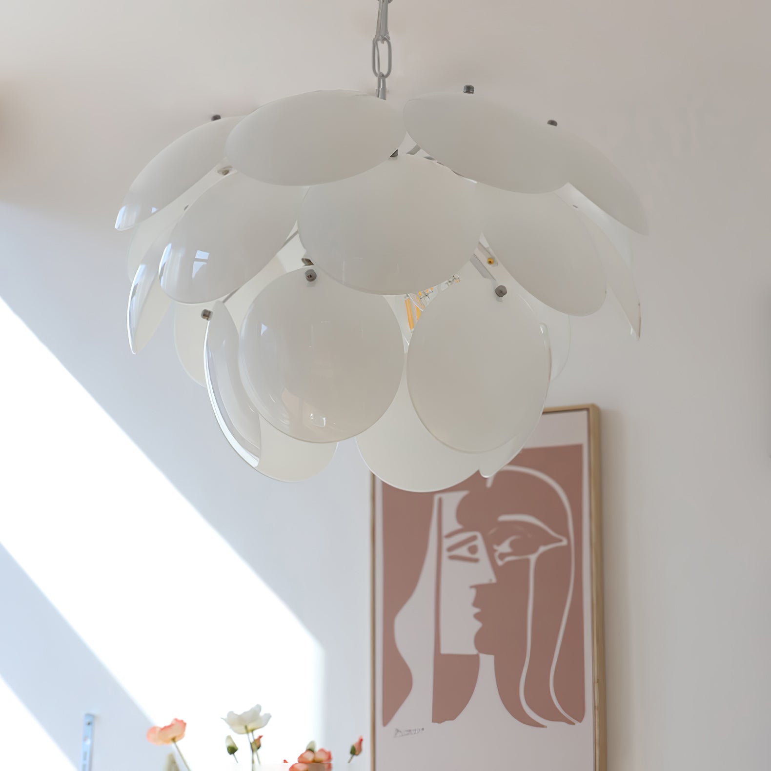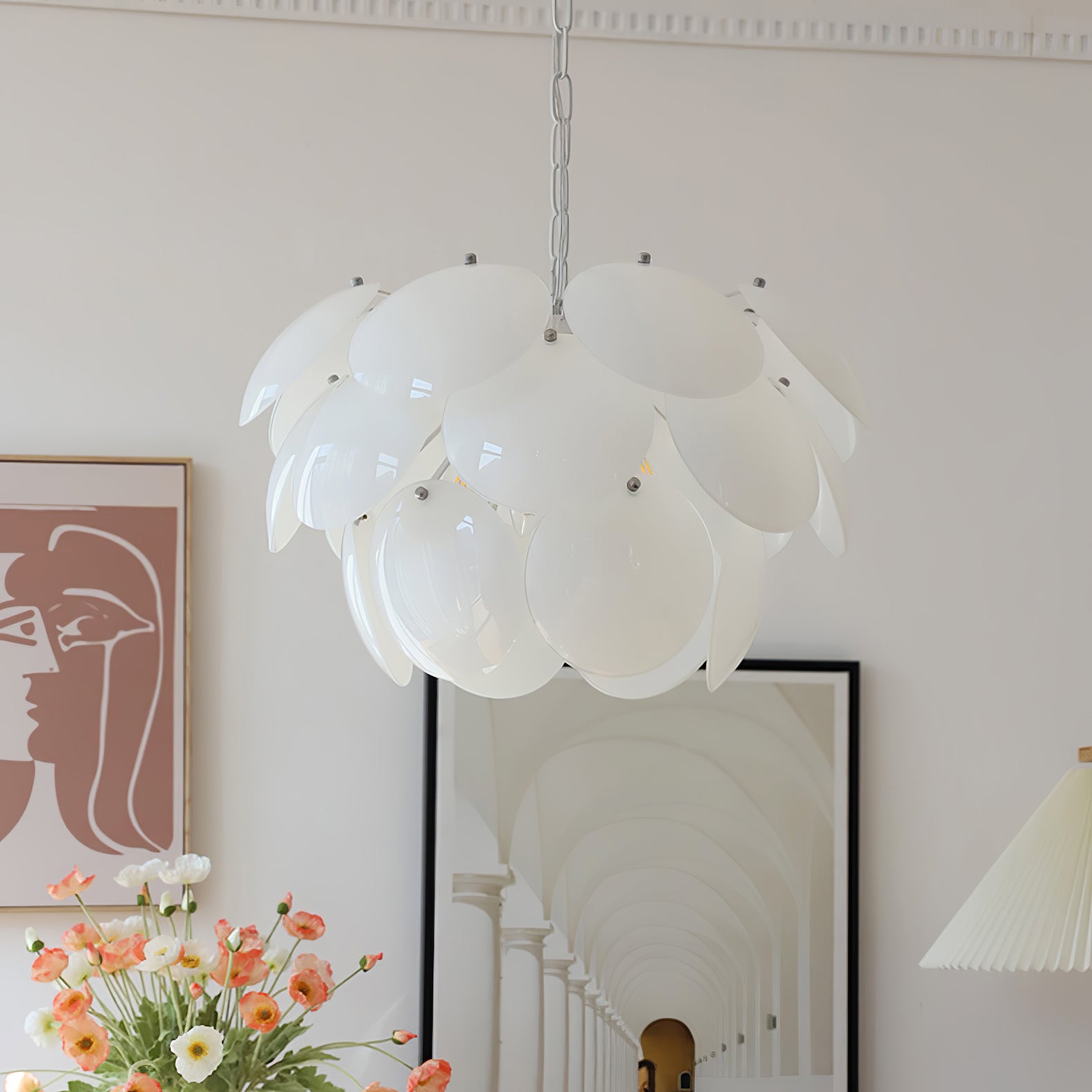Enemmän kuin pelkkä valaisin, "Luminous Petal Glass Chandelier" toimii myös taideteoksena, joka korostaa mitä tahansa sisustusta. Se sopii täydellisesti olohuoneeseen, ruokailutilaan tai mihin tahansa tilaan, joka kaipaa eleganssia. Tämä kattokruunu ei ole vain valonlähde, vaan keskipiste, joka herättää keskustelua ja ihailua.