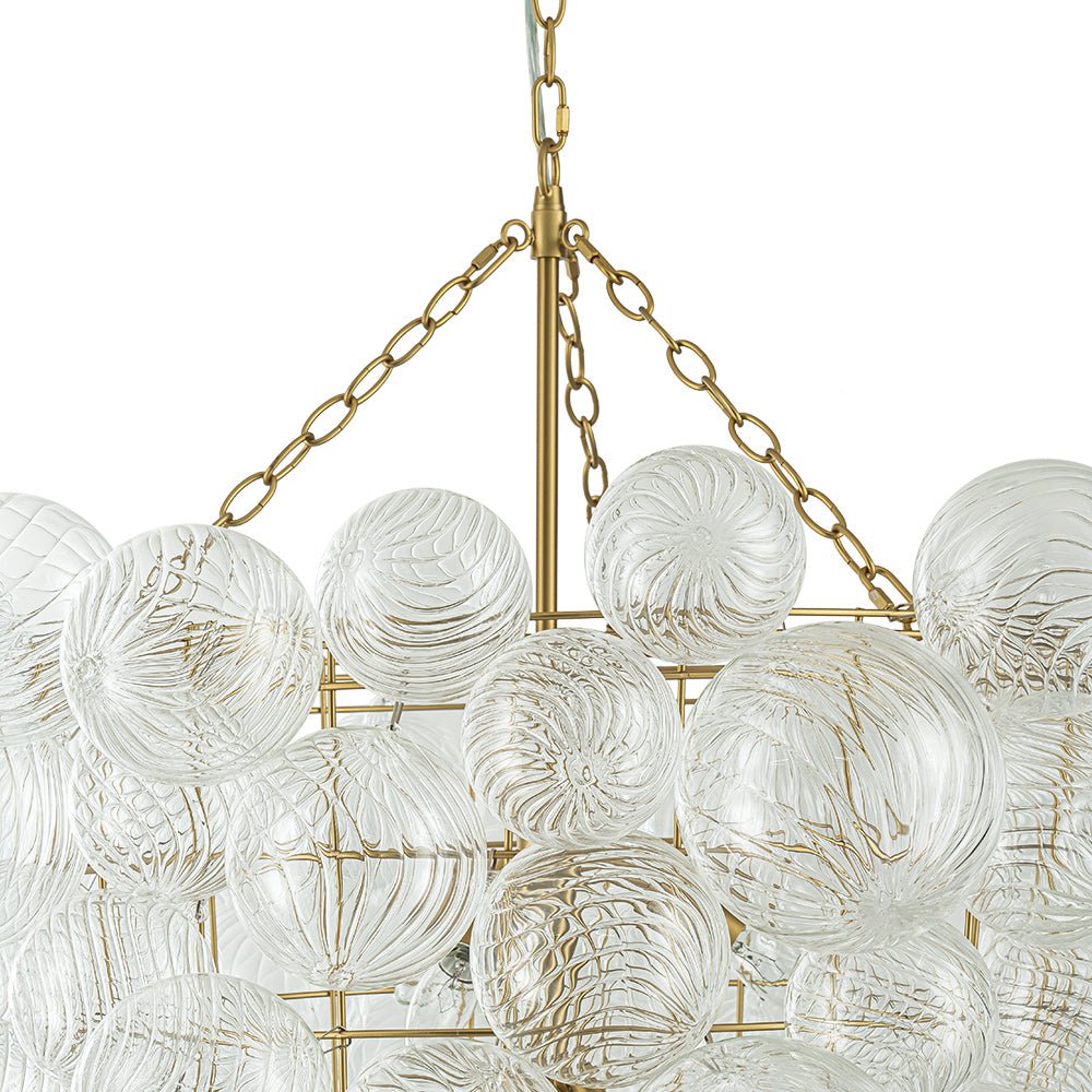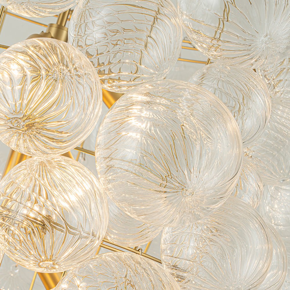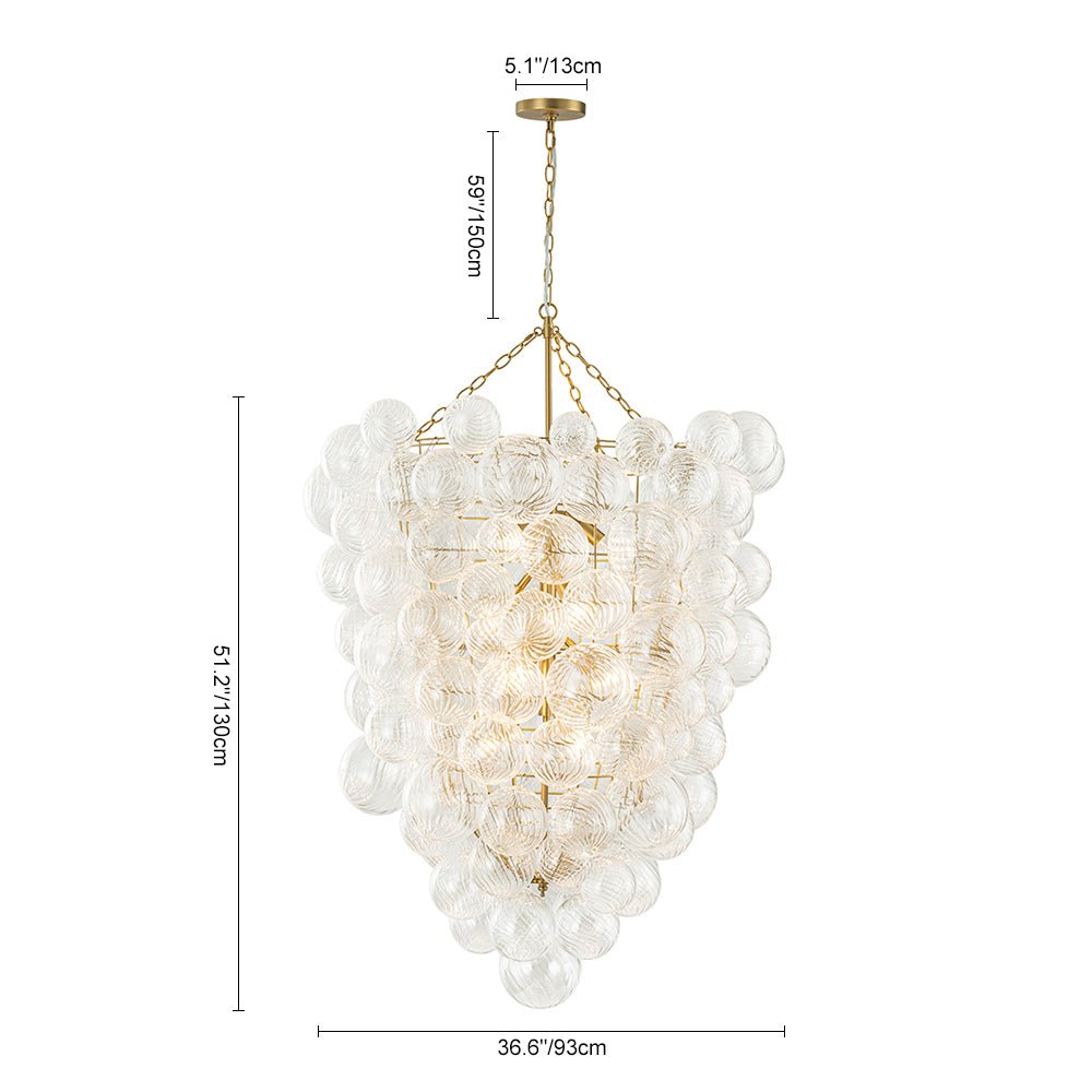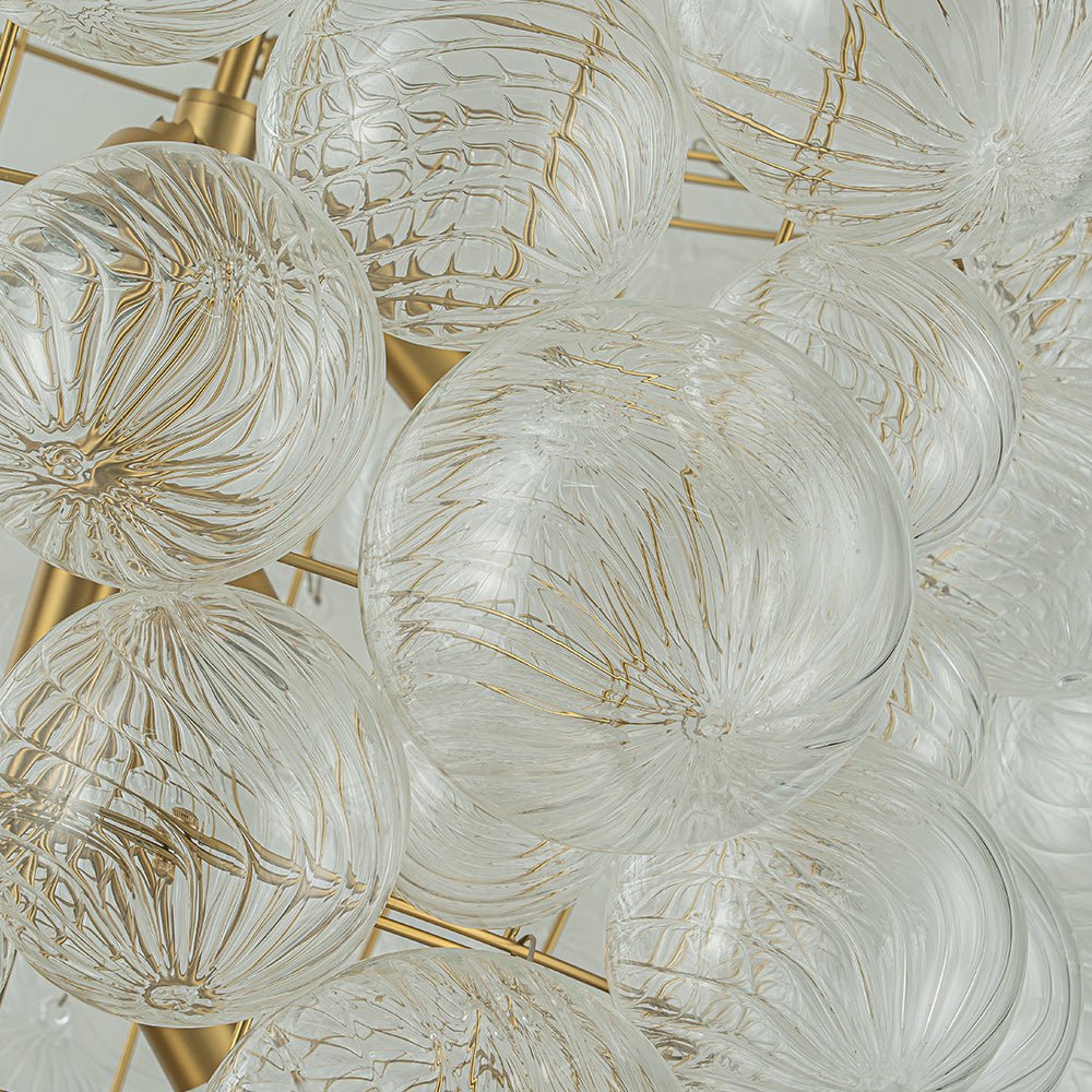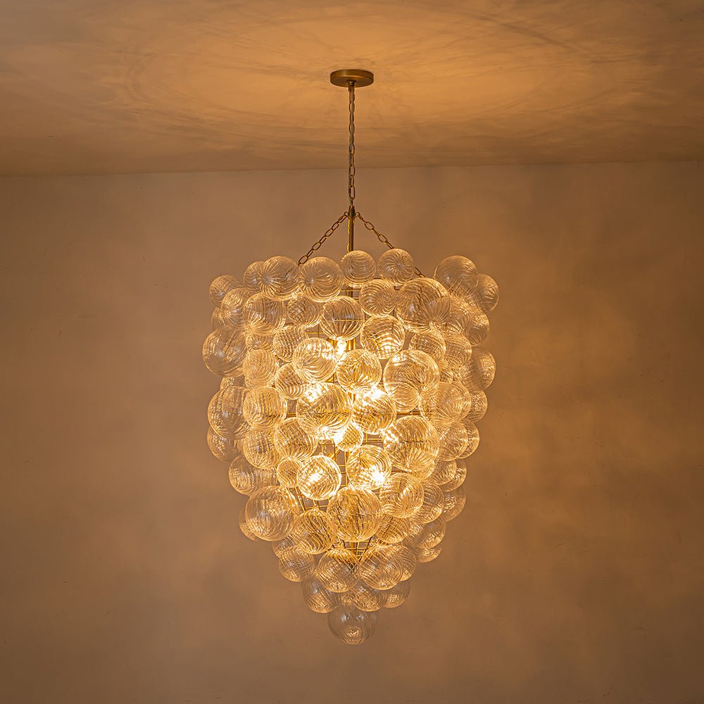 Tämä ylevä kuplakruunu on rakennettu erikokoisten pyörivien uurteiden lasipallojen rypäleestä, joista jokainen on kiinnitetty tyylikkäästi syvälle kapenevaan metallikehykseen, mikä antaa henkeäsalpaavan roikkuvan näytön, kuten herkkä, peräkkäinen kimppu kiteisiä kukkia kellumassa tilassasi. Tämä täyteläisellä harjatulla messingillä viimeistelty kattokruunu säteilee lämmintä säteilyä, joka virtaa jokaisen kirkkaan lasipallon jokaisen pyörteen läpi, luoden kimaltelevan kuplavaikutelman, joka tuo mieleen kulta-ajan viimeisen romanssin ruumiillistuksen. Sen korkeatasoinen muotoilu tekee valloittavan vaikutelman missä tahansa ympäristössä, olipa kyseessä sisäänkäynti, olohuone, ruokasali tai upea/parvi. Lisää ripaus ainutlaatuisuutta ja glamouria ja inspiroi sisustukseesi ihmeitä tällä ylellisellä rypälekuplakruunulla.