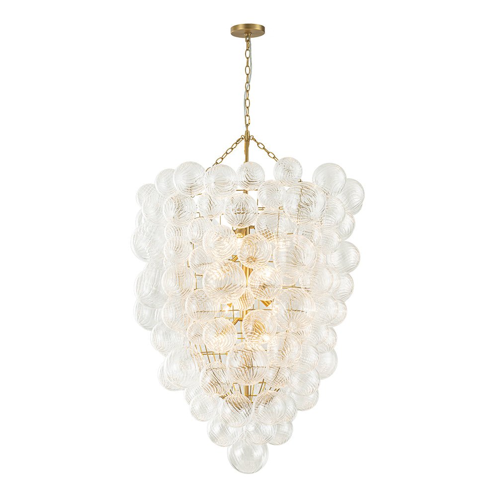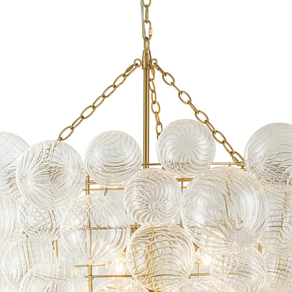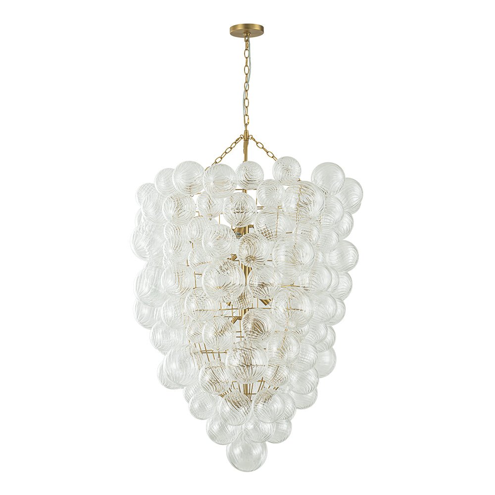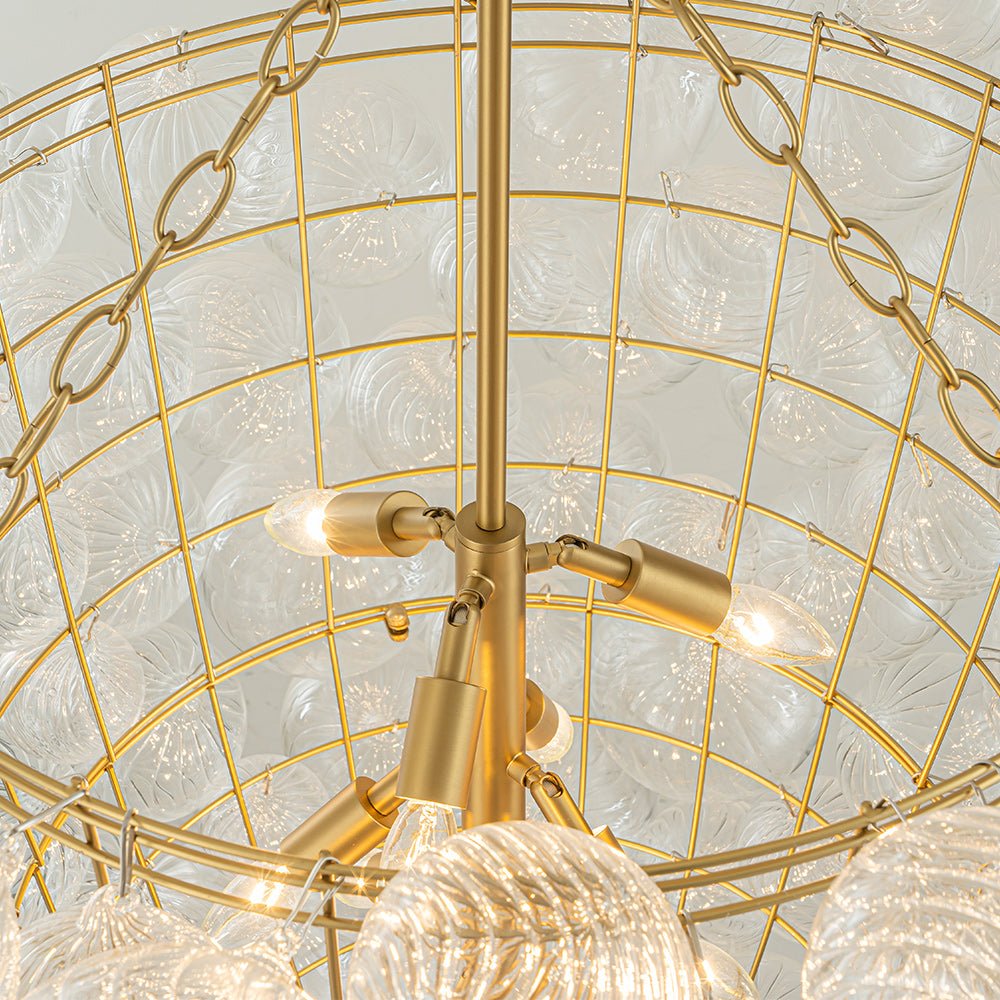 Tämä ylevä kuplakruunu on rakennettu erikokoisten pyörivien uurteiden lasipallojen rypäleestä, joista jokainen on kiinnitetty tyylikkäästi syvälle kapenevaan metallikehykseen, mikä antaa henkeäsalpaavan roikkuvan näytön, kuten herkkä, peräkkäinen kimppu kiteisiä kukkia kellumassa tilassasi. Tämä täyteläisellä harjatulla messingillä viimeistelty kattokruunu säteilee lämmintä säteilyä, joka virtaa jokaisen kirkkaan lasipallon jokaisen pyörteen läpi, luoden kimaltelevan kuplavaikutelman, joka tuo mieleen kulta-ajan viimeisen romanssin ruumiillistuksen. Sen korkeatasoinen muotoilu tekee valloittavan vaikutelman missä tahansa ympäristössä, olipa kyseessä sisäänkäynti, olohuone, ruokasali tai upea/parvi. Lisää ripaus ainutlaatuisuutta ja glamouria ja inspiroi sisustukseesi ihmeitä tällä ylellisellä rypälekuplakruunulla.