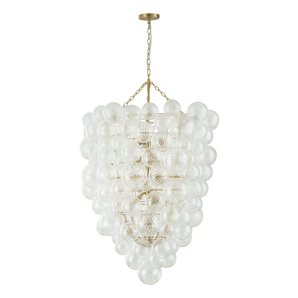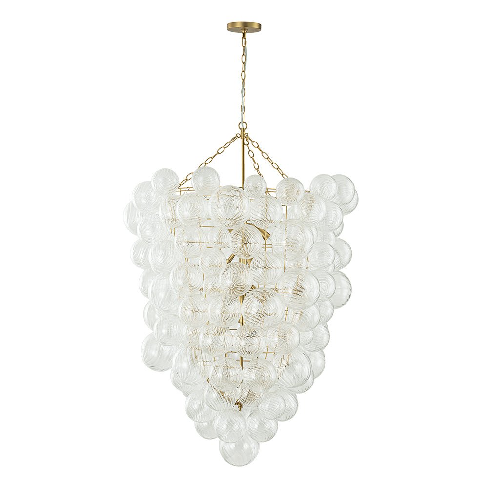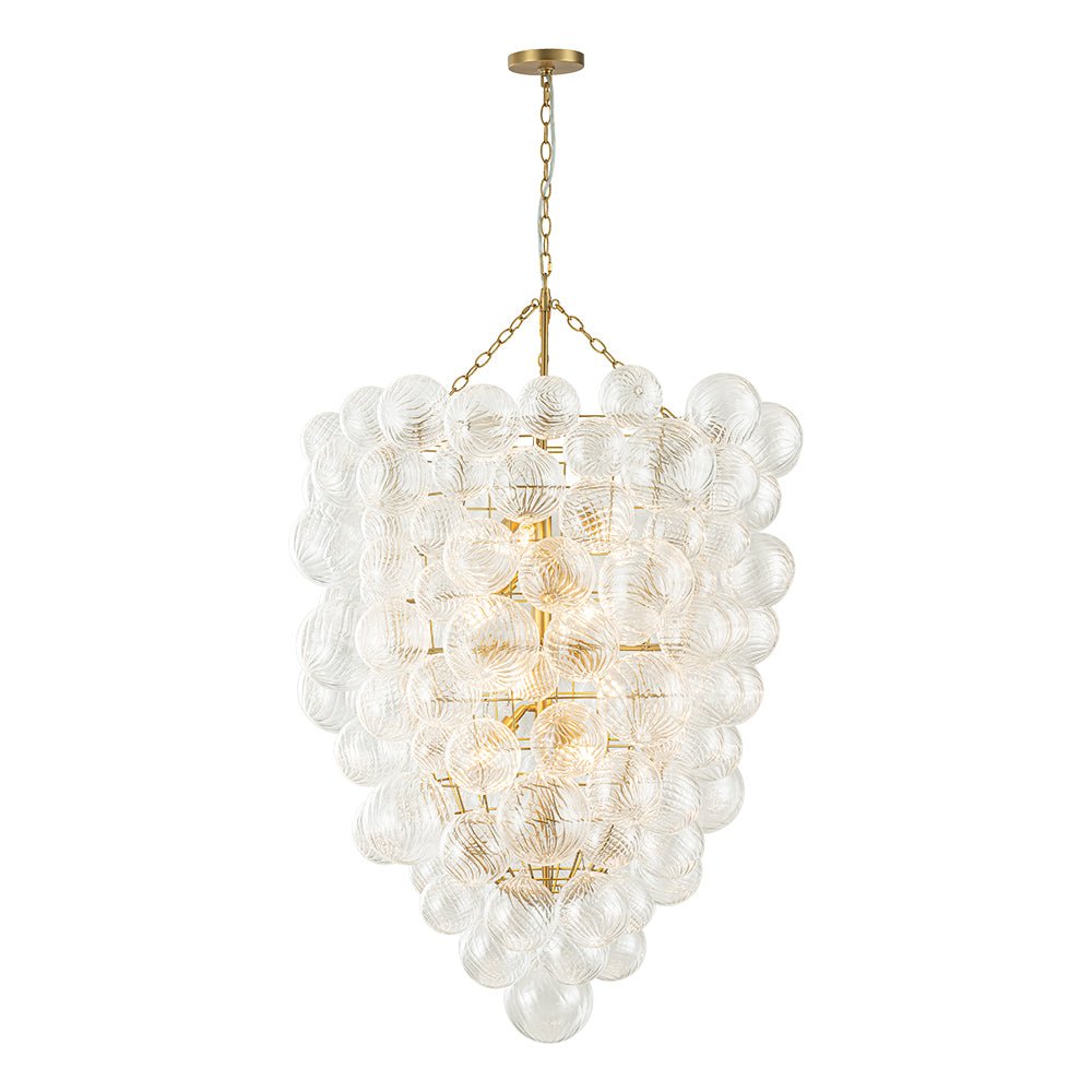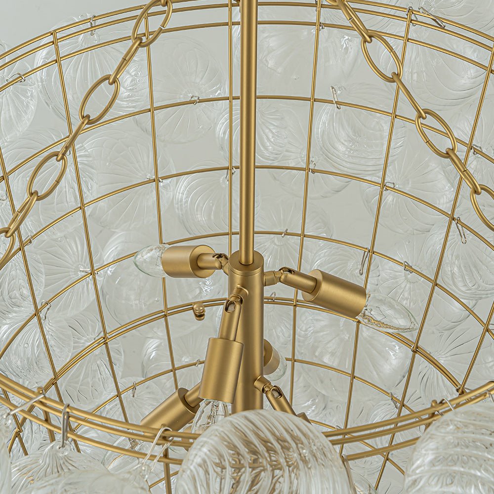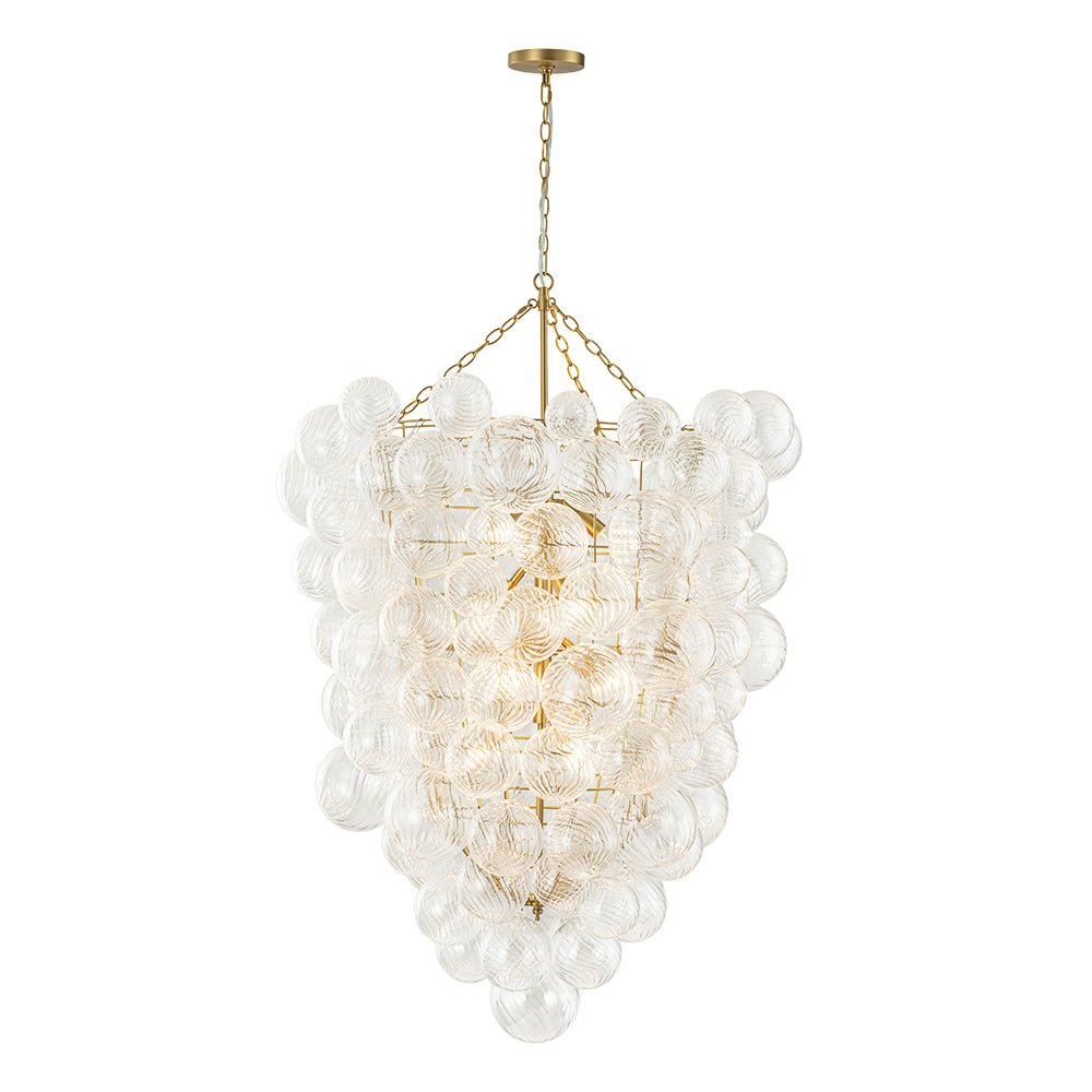 Tämä ylevä kuplakruunu on rakennettu erikokoisten pyörivien uurteiden lasipallojen rypäleestä, joista jokainen on kiinnitetty tyylikkäästi syvälle kapenevaan metallikehykseen, mikä antaa henkeäsalpaavan roikkuvan näytön, kuten herkkä, peräkkäinen kimppu kiteisiä kukkia kellumassa tilassasi. Tämä täyteläisellä harjatulla messingillä viimeistelty kattokruunu säteilee lämmintä säteilyä, joka virtaa jokaisen kirkkaan lasipallon jokaisen pyörteen läpi, luoden kimaltelevan kuplavaikutelman, joka tuo mieleen kulta-ajan viimeisen romanssin ruumiillistuksen. Sen korkeatasoinen muotoilu tekee valloittavan vaikutelman missä tahansa ympäristössä, olipa kyseessä sisäänkäynti, olohuone, ruokasali tai upea/parvi. Lisää ripaus ainutlaatuisuutta ja glamouria ja inspiroi sisustukseesi ihmeitä tällä ylellisellä rypälekuplakruunulla.