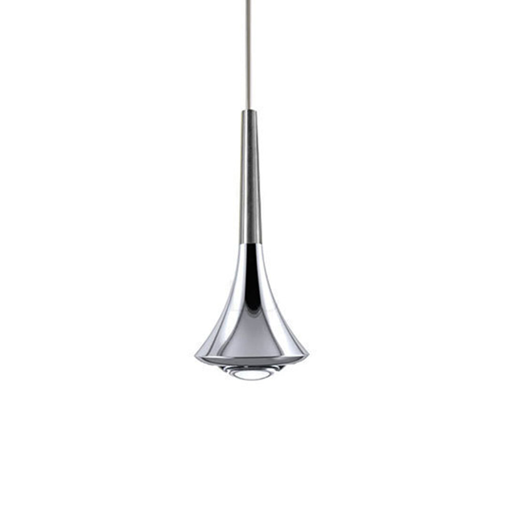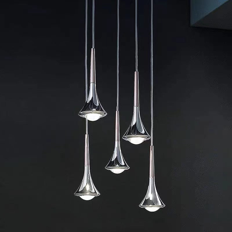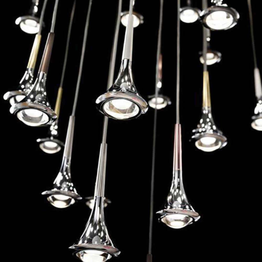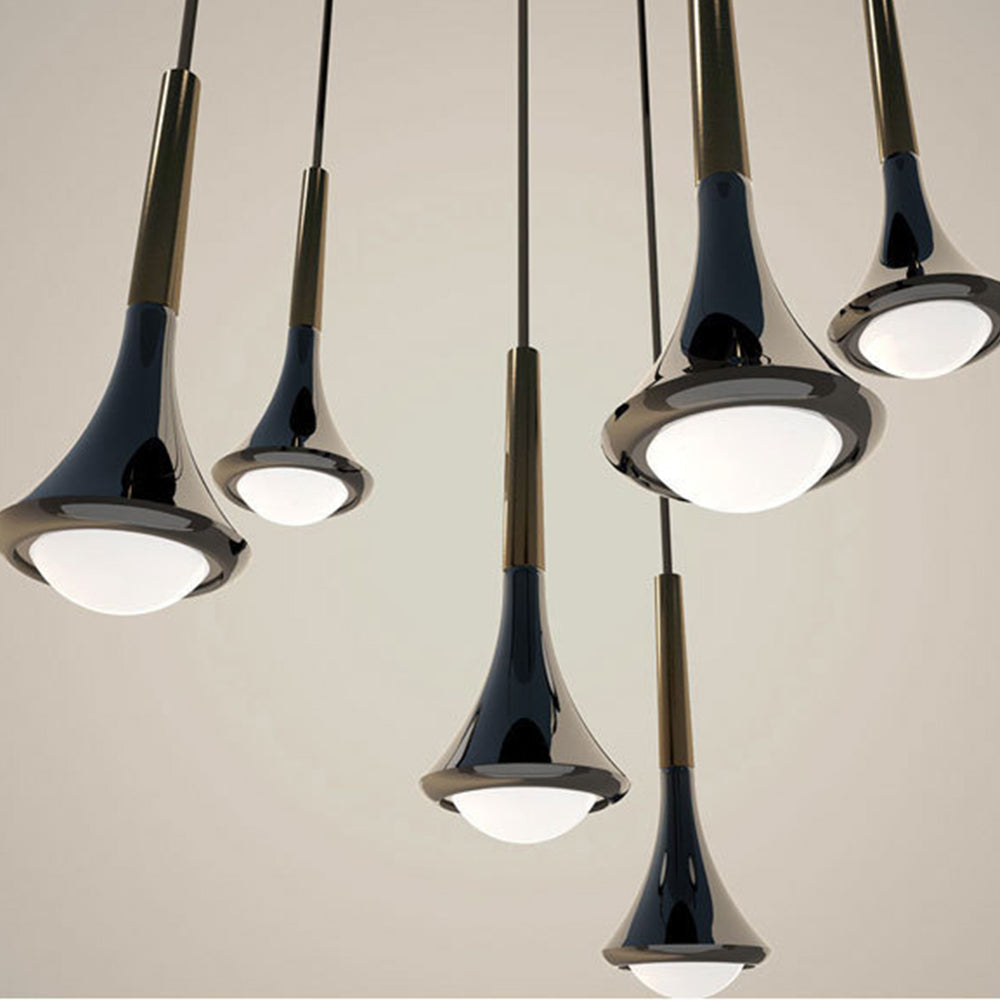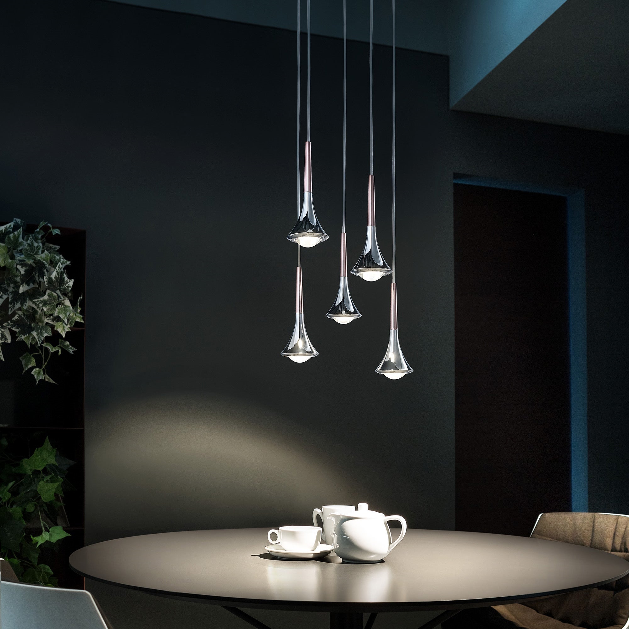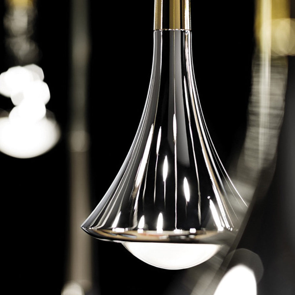 Sateen riippuvalaisin virtaa huoneeseen kuin pisara lämmintä kesäsadetta. Sen kapea diffuusori kapenee ylöspäin ja varsi voi olla eri metallinvärinen kuin kromista tai mustasta valmistettu lampun pään alaosa, joka päättyy alas pallomaiseen lasiin.