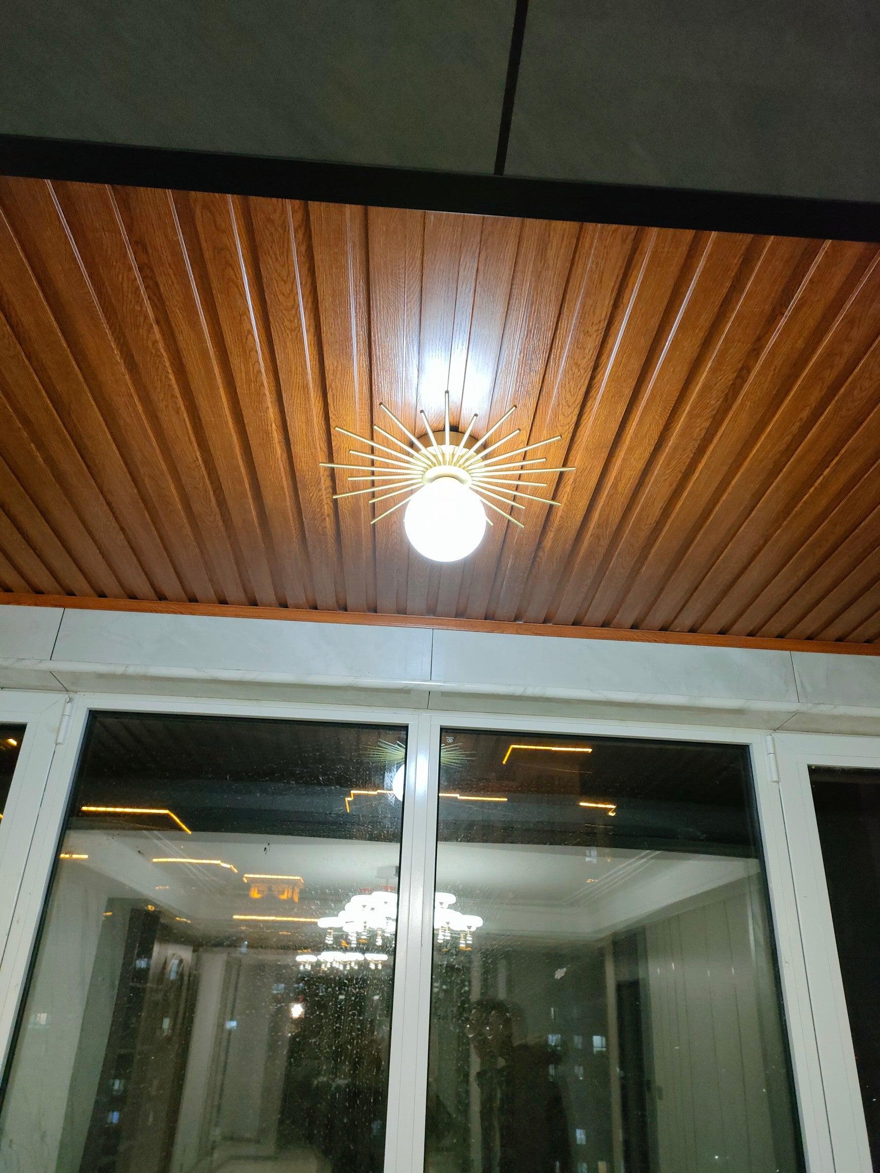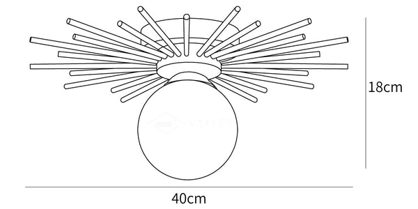 Messingistä hohtavan kullanvärisenä viimeistelyn valaisimen jalka on asennettu tasolle kattoon ja säteilee upeita kultaisia sauvoja ulospäin. Pyöreä lasipallo on himmeä, mikä tuo muotoiluun puhdasta eleganssia ja luovuutta. Tämä on täydellinen valaisin tekemään vaikutuksen vierailijoihin vierashuoneessa, ja se näyttää aivan henkeäsalpaavalta, kun käytät käytävää kahdella tai useammalla näistä silmiinpistävästä valonlähteestä