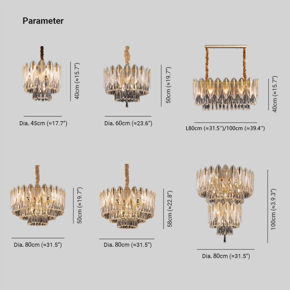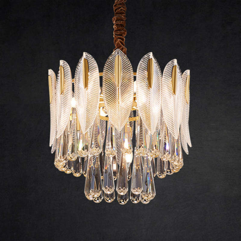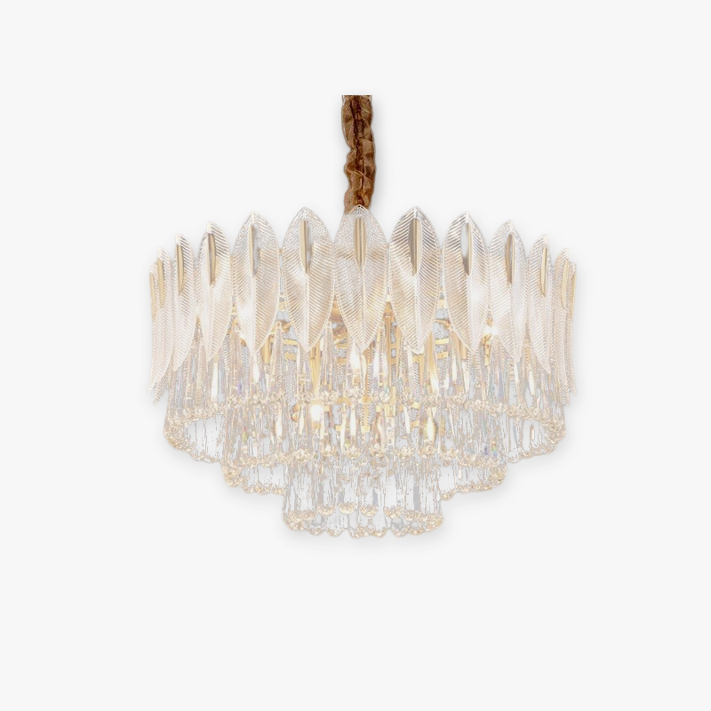 - Useista höyhenenmuotoisista kristallikappaleista koostuva kattokruunu esittelee eleganssia ja keveyttä.