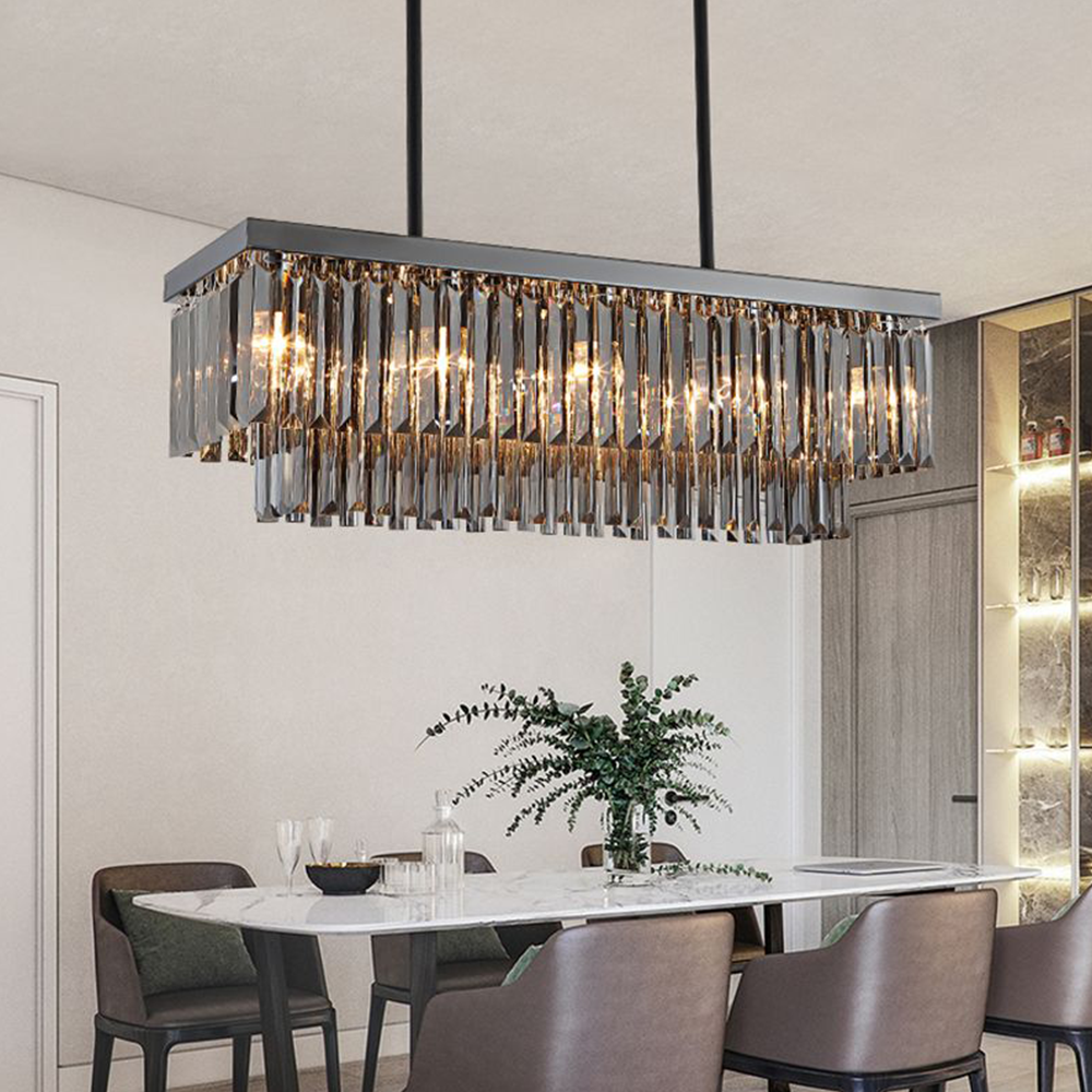 - Suunniteltu suorakaiteen muotoisella kehyksellä, riippuvalaisin esittelee minimalistisen mutta tyylikkään ulkonäön, jota täydentää yhdistelmä mustalla läpikuultavalla lasilla.