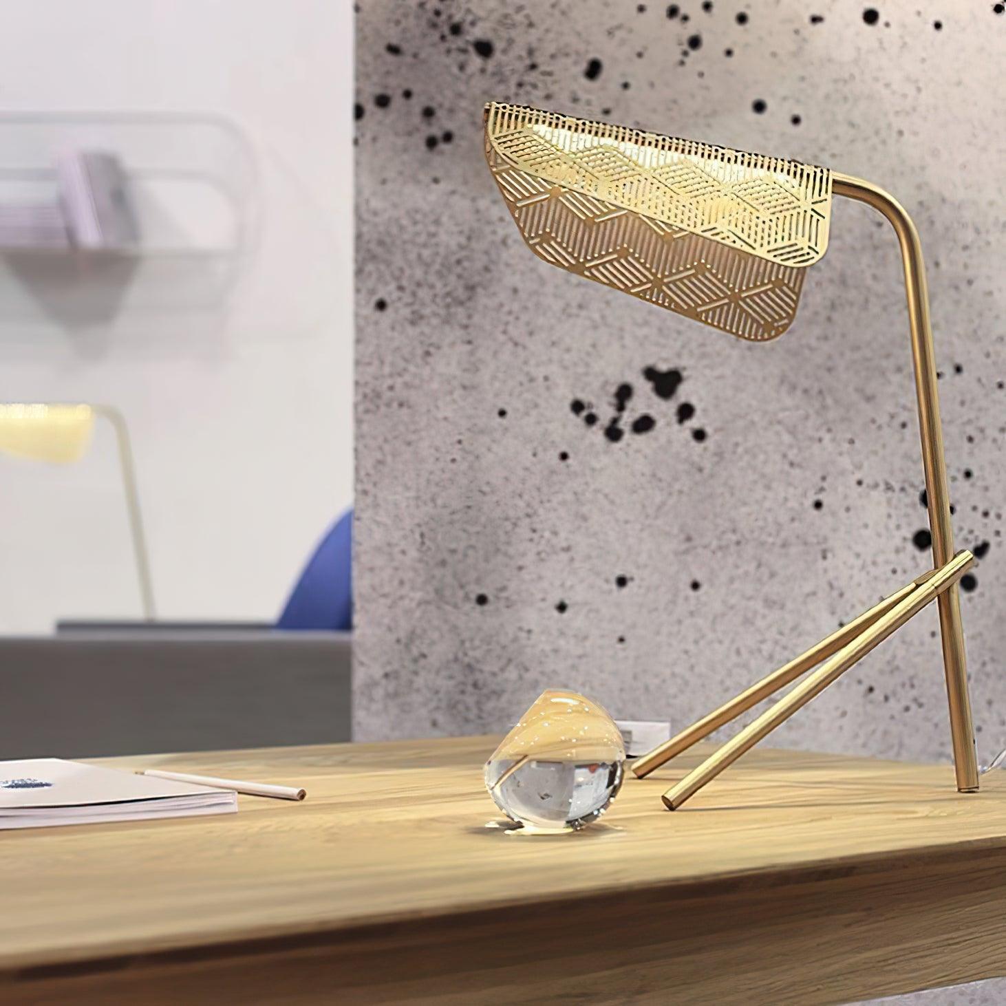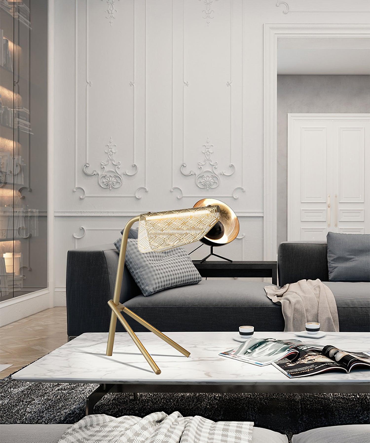 Välimeren parvekkeilla kelluvan pyykin painottomuuden innoittama valaisin suunnittelee Mediterranea-valosarjan galvanoitua kultaa ja LEDiä. Kevyellä rakenteella lepäävä metallikangas muotoilee ja hajottaa valoa eloisan ja geometrisen kuvion läpi.