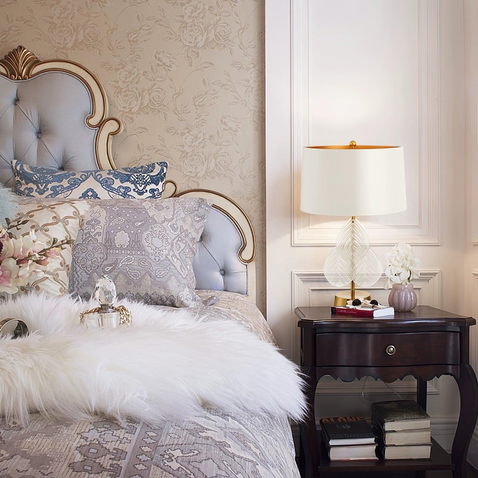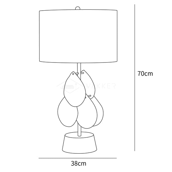 Melania-pöytävalaisin on kaunis ja ylellinen lisä tilaan. Kangasrumpuvarjostin on tuettu yksinkertaisella antiikkikultaisella metallivarrella ja pohjalla. Vartta koristavat painuneet kirkkaat lasilehdet, jotka hohtavat ylhäältä valaistussa. Tämän pöytävalaisimen asiantunteva käsityö on täydellinen lisä kaikkiin moderniin kodin sisustukseen.