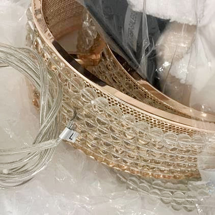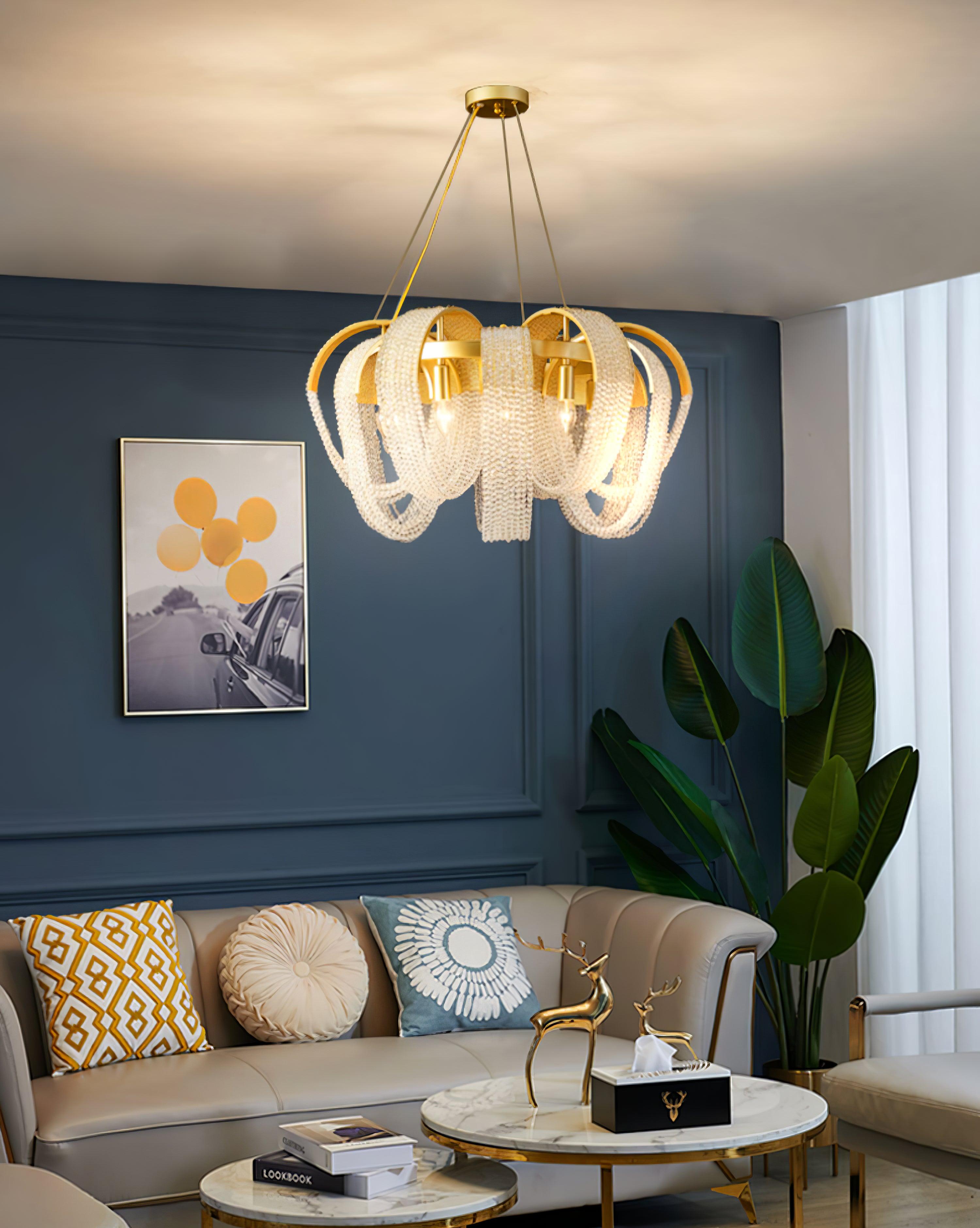 Kiteiden vesiputous laskeutuu kultaisesta verkkokehyksestä. Päällystyskiteet yhdistyvät alempaan verkkotasoon luoden suihkulähteen kaltaisen järjestelyn. Yksinkertaisesti hurmaavaa! Tämä upea pyöreä kattokruunu kimaltelee loputtomasti. Valo kimaltelee kuin timantit kirkkaiden kristallien ja kierrekehyksen läpi.