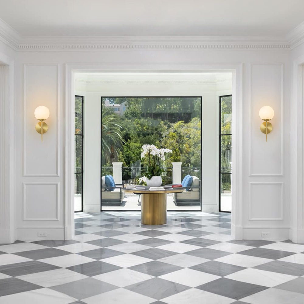 One Light • Opaalilasipallo • Yksi varsi • Moderni vuosisadan puoliväli • Messinkiviimeistely • E26 Medium Polttimo (ei sisälly) • Kiinteä • UL-listattu