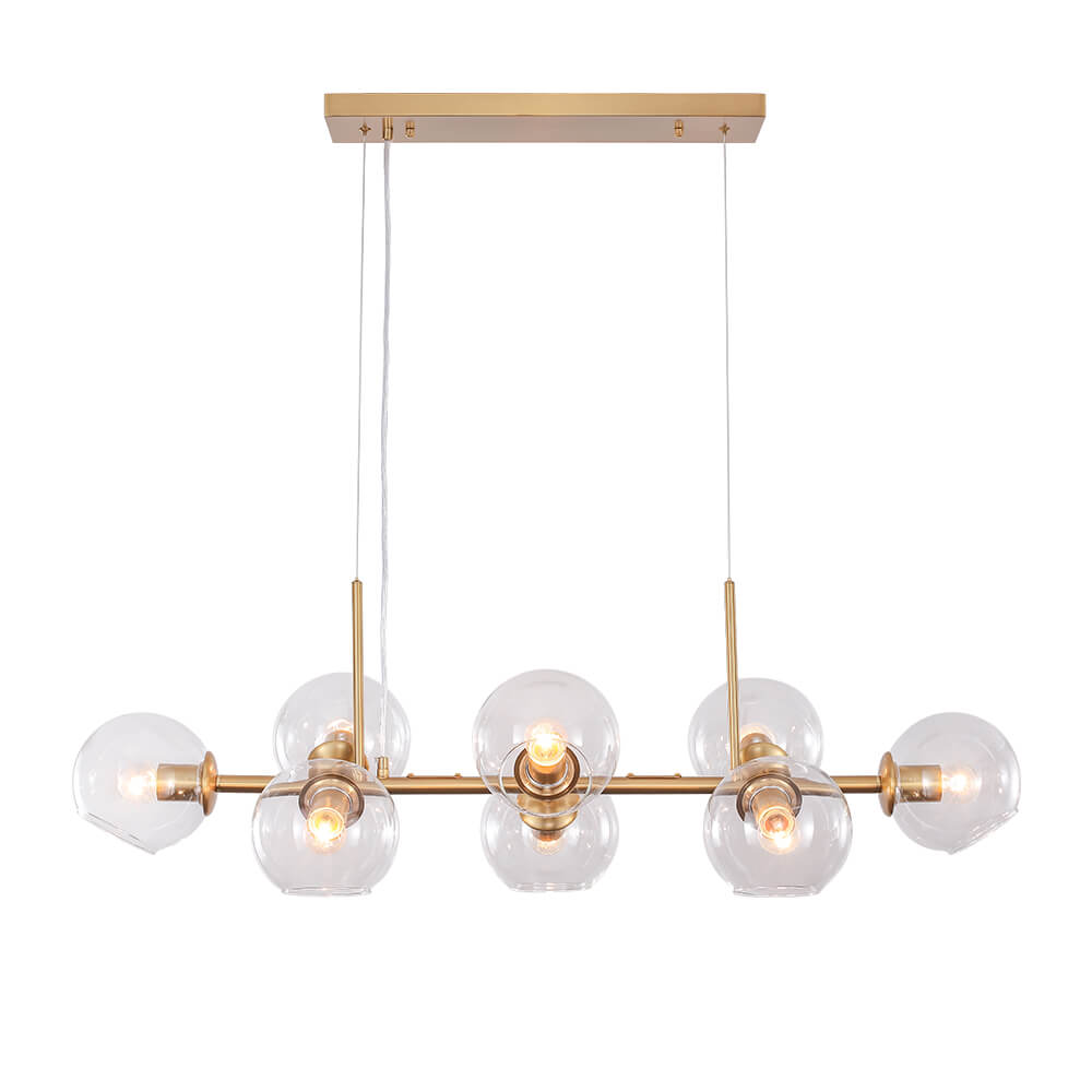 Täydellinen sekoitus klassista muotoilua ja modernia rakennetta, tämä keittiösaarekevalaisin on tervetullut ja houkutteleva lisä sisustukseen. Tämä keittiösaarekeriippuva valaistus ei sovellu vain keittiön työtasolle, vaan se on myös taidokas keskipiste olohuoneeseesi, ruokasaliin, eteiseen ja kotibaariin. Vaakasuora pylväs, jossa on kahdeksan avoimen suulla olevaa pallomaista lasivarjostinta, tulee suorakaiteen muotoisesta katoksesta ja kahdesta säädettävästä kaapelista. Tämä vuosisadan puolivälin keittiön valaistus, jossa on E26/E27-keskikantaiset polttimot (ei sisälly toimitukseen), valaisee runsaasti koko huonetta kirkkaan lasin läpi. Kaksi vaihtoehtoa messinkiä ja mustaa viimeistelyä esittelevät vuosisadan puolivälin tyylikästä kosketusta ja täydentävät herkkää muotoilua. Koska tämä keittiön maapallo on yhteensopiva himmentimen ja himmennettävien lamppujen kanssa (molemmat eivät sisälly toimitukseen), voit muuttaa tunnelmaa vaivattomasti olosuhteidesi mukaan. Ota tämä 38,58" L x 9,84" K 9-kevyt moderni, vuosisadan puolivälin maapallon keittiövalaisin antaaksesi ilmeen!