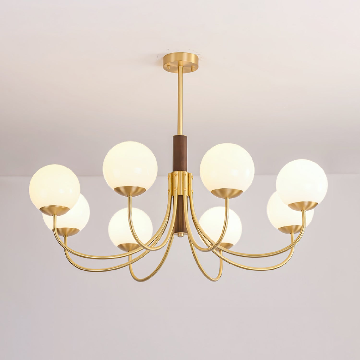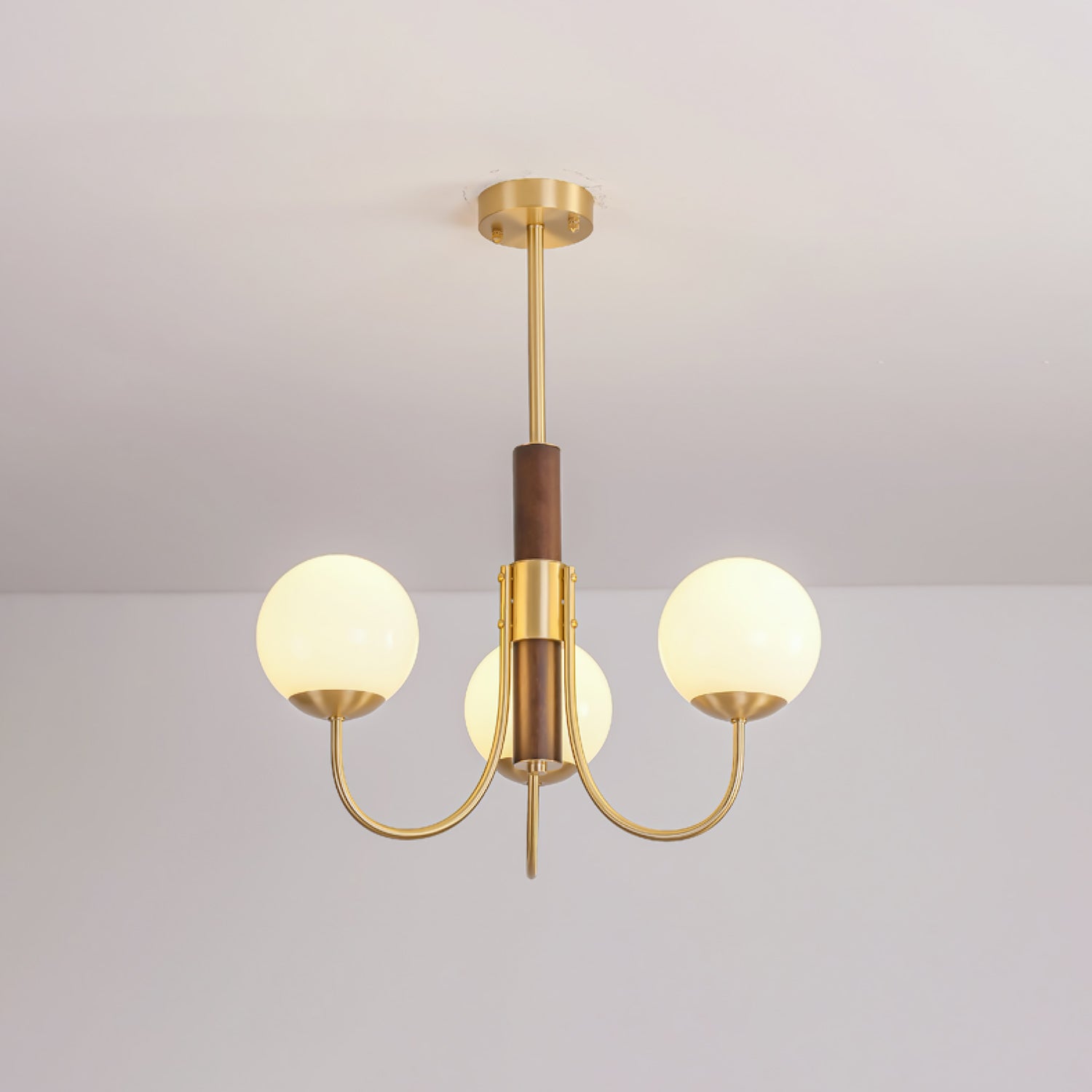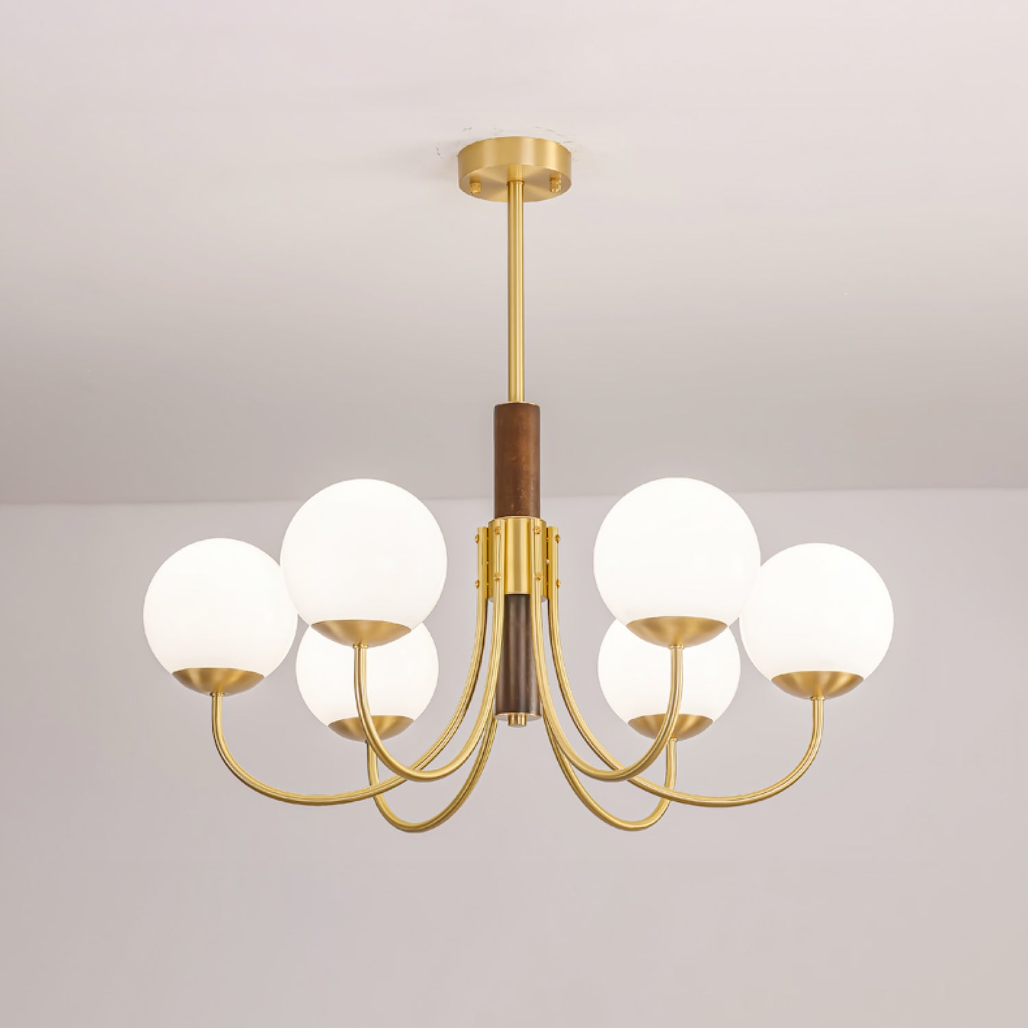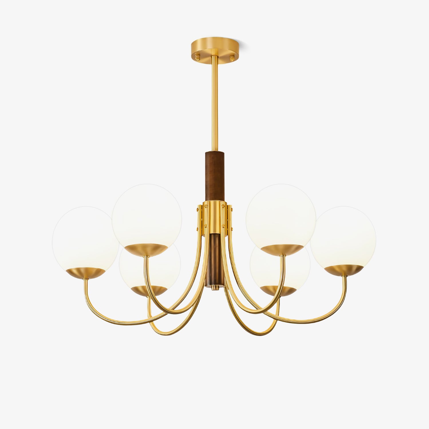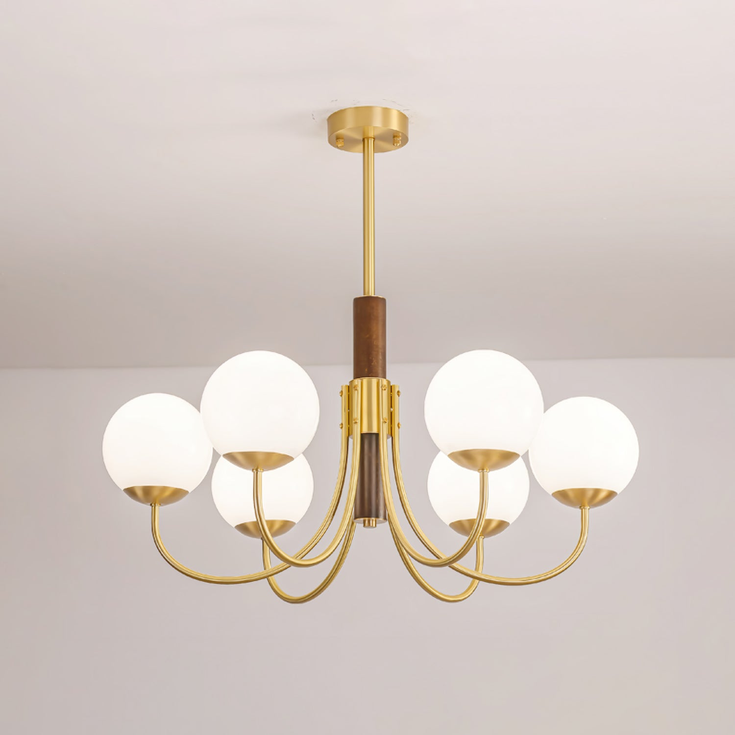 Pähkinäpuun lämpimät sävyt tarjoavat orgaanisen kontrastin kiillotetulle messingille luoden kutsuvan tunnelman, joka sopii täydellisesti ylelliseen ruokasaliin, suureen eteiseen tai tyylikkääseen olohuoneeseen. Pallomaiset lasivarjostimet on suunniteltu huolellisesti säteilemään pehmeää, tasaista valoa, mikä varmistaa, että huoneesi kylpee kodikkaassa mutta ylevässä valaistuksessa.