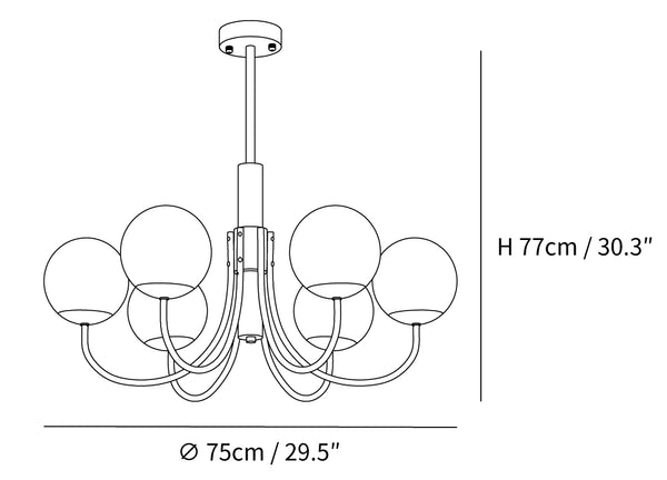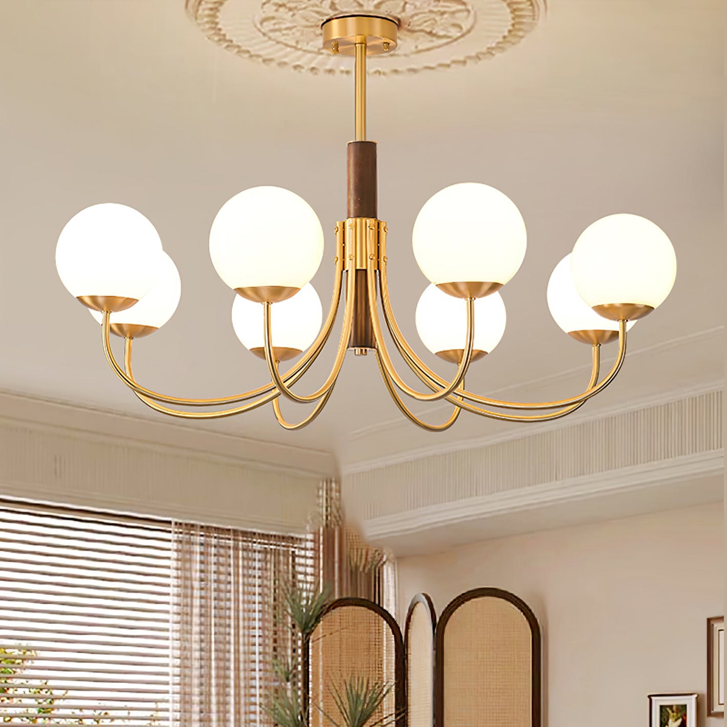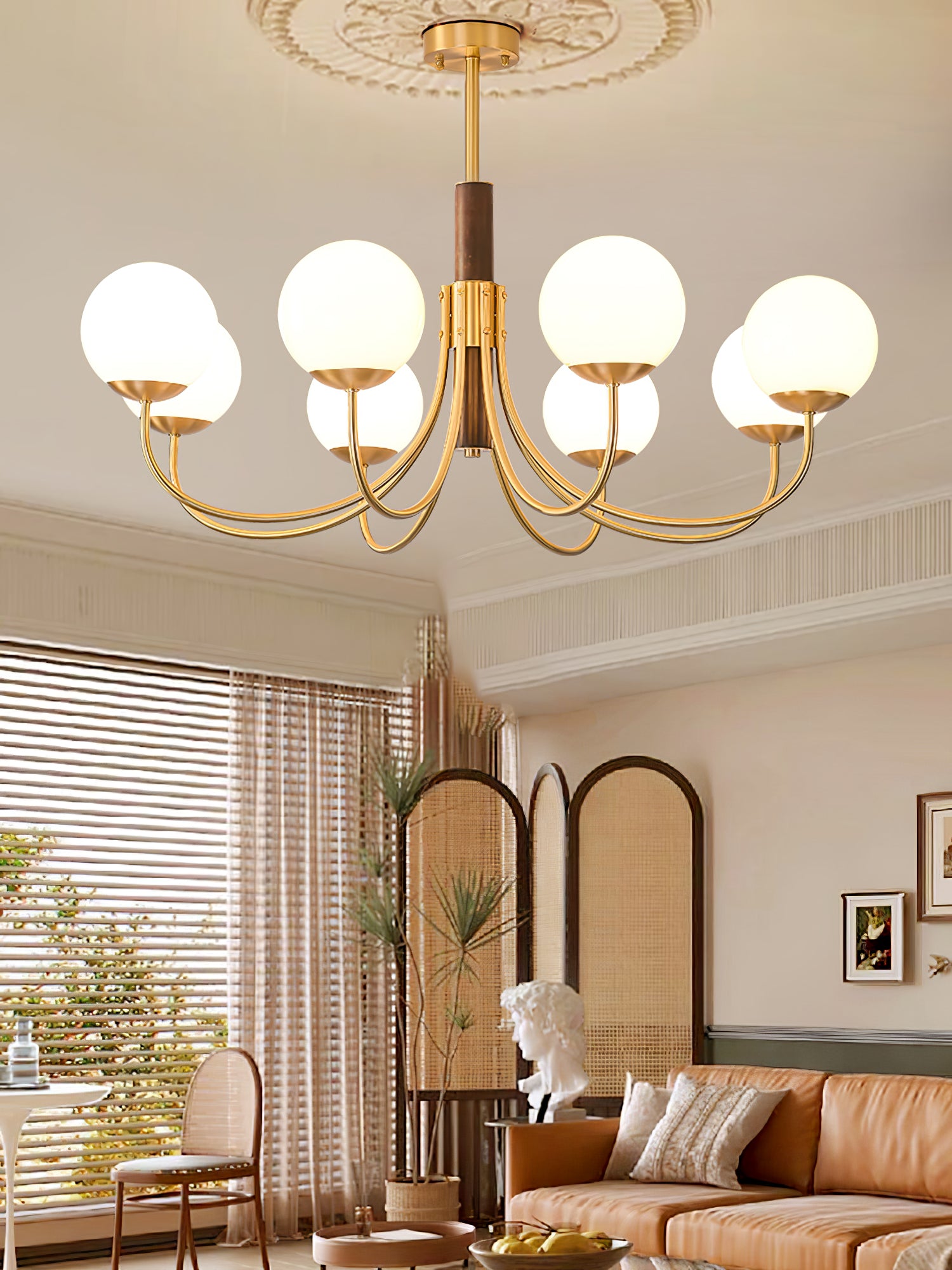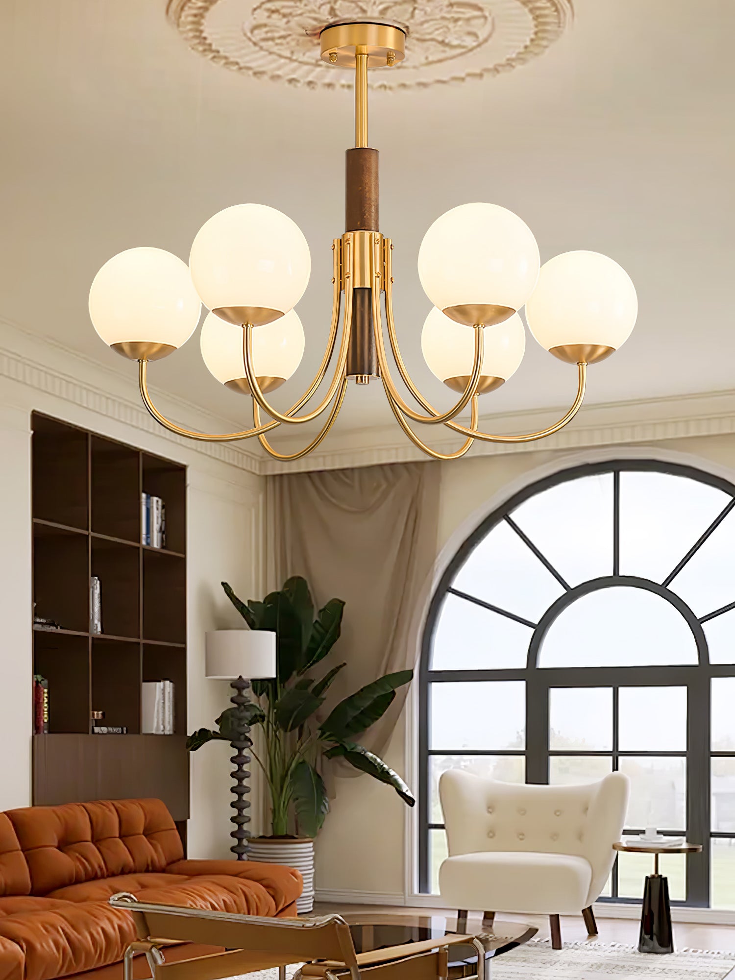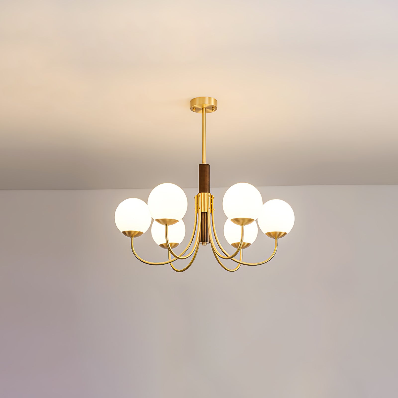 Pähkinäpuun lämpimät sävyt tarjoavat orgaanisen kontrastin kiillotetulle messingille luoden kutsuvan tunnelman, joka sopii täydellisesti ylelliseen ruokasaliin, suureen eteiseen tai tyylikkääseen olohuoneeseen. Pallomaiset lasivarjostimet on suunniteltu huolellisesti säteilemään pehmeää, tasaista valoa, mikä varmistaa, että huoneesi kylpee kodikkaassa mutta ylevässä valaistuksessa.