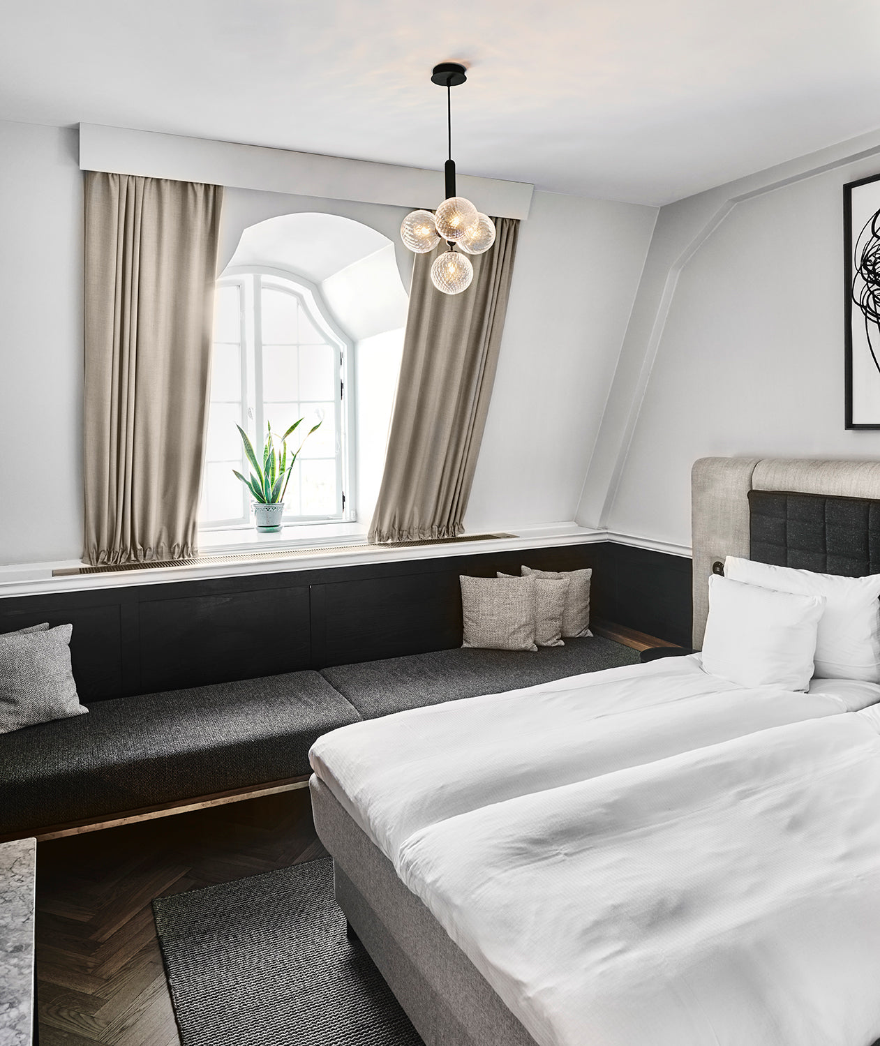Suupuhalletuista lasipalloista ja tyylikkäästä käsitellystä metallirakenteesta koostuva Miira Pendant Light -design huokuu tasapainoa ja syvyyttä. Optinen kirkas lasiversio ainutlaatuisella kohokuvioillaan tuo huoneeseen leikkisää valoa ja tunnelmaa, kun taas opaalilasiversiossa on luontainen lämmön tunne.