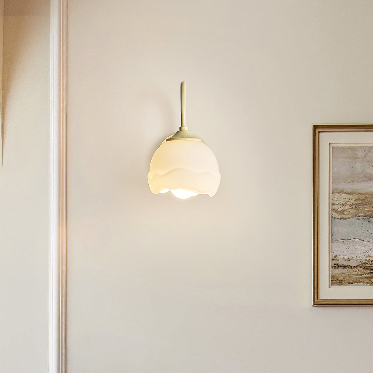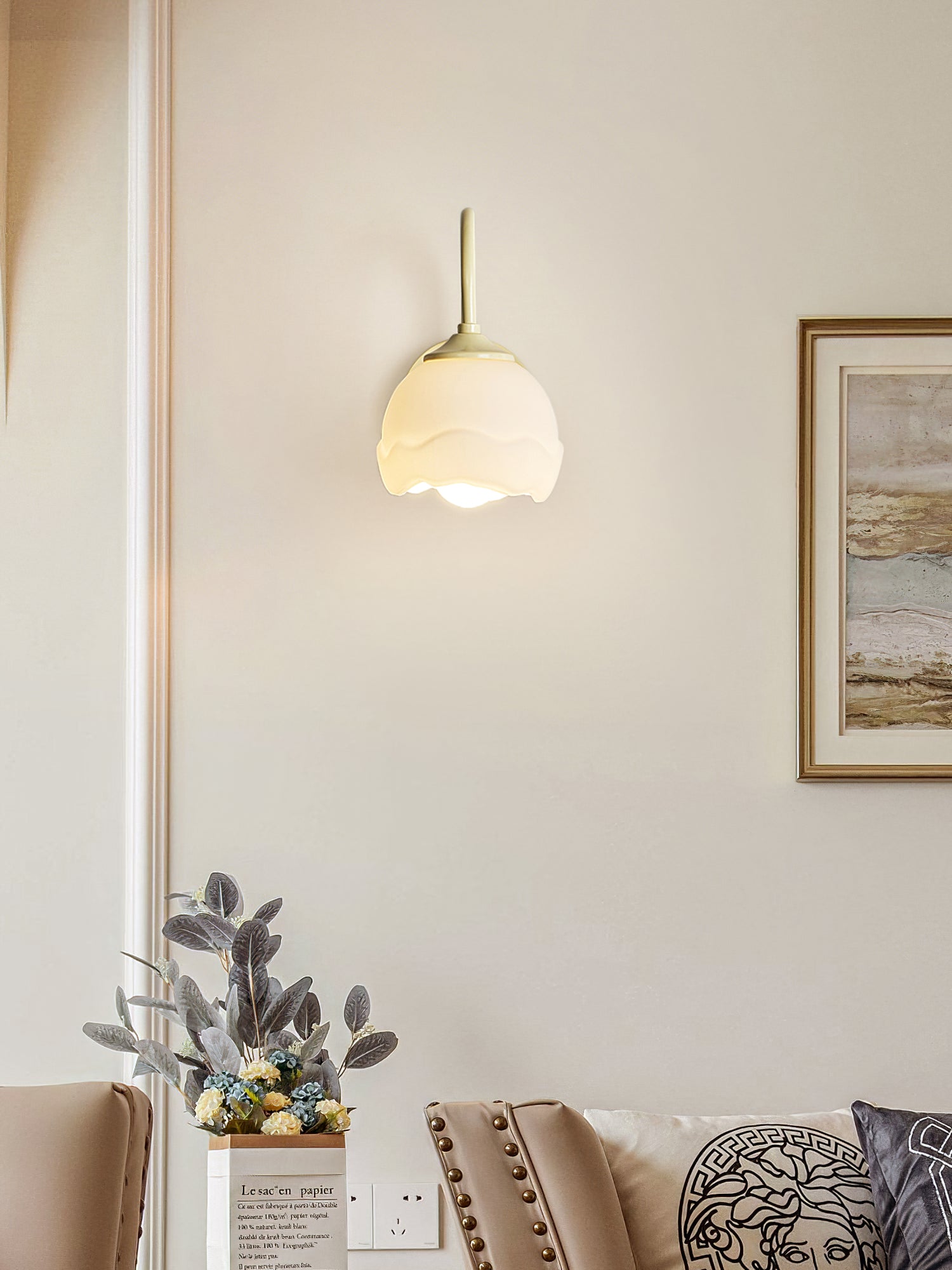The Milk White Floral Wall Lamp on upea valaisin, joka on saanut inspiraationsa kukkien kauneudesta ja eleganssista. Se on arvostettu sen monimutkaisen suunnittelun ja korkealaatuisen käsityön ansiosta, joka tarjoaa pehmeän ja lämpimän valaistuksen tilaan.