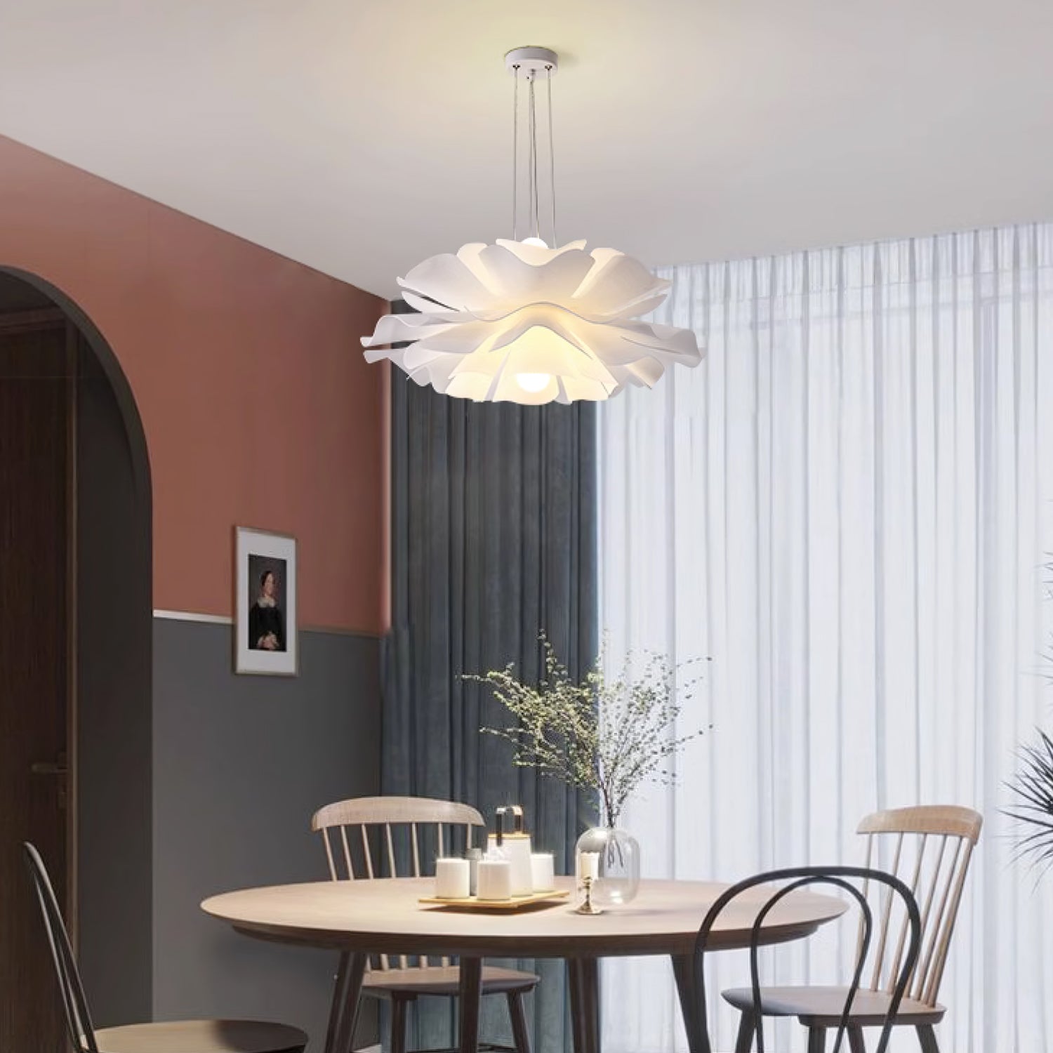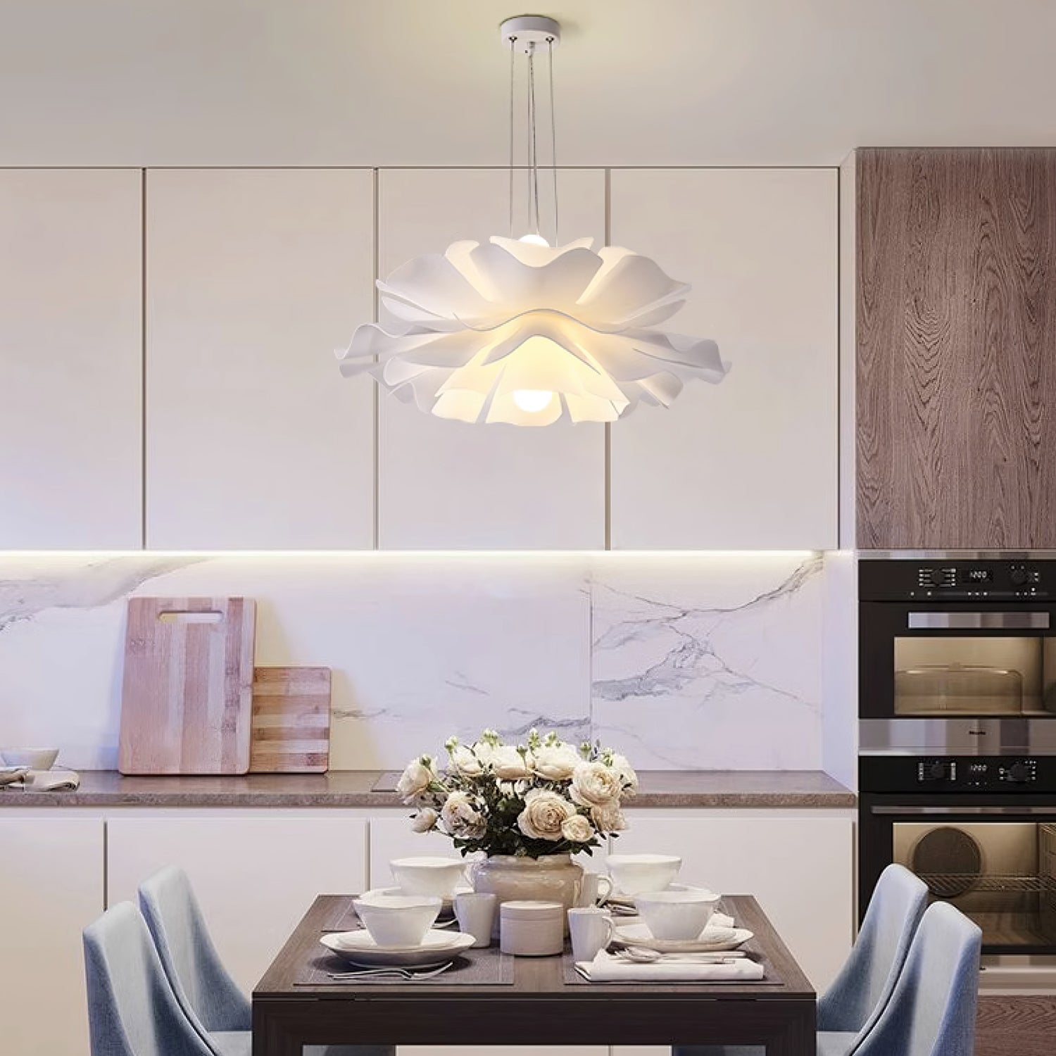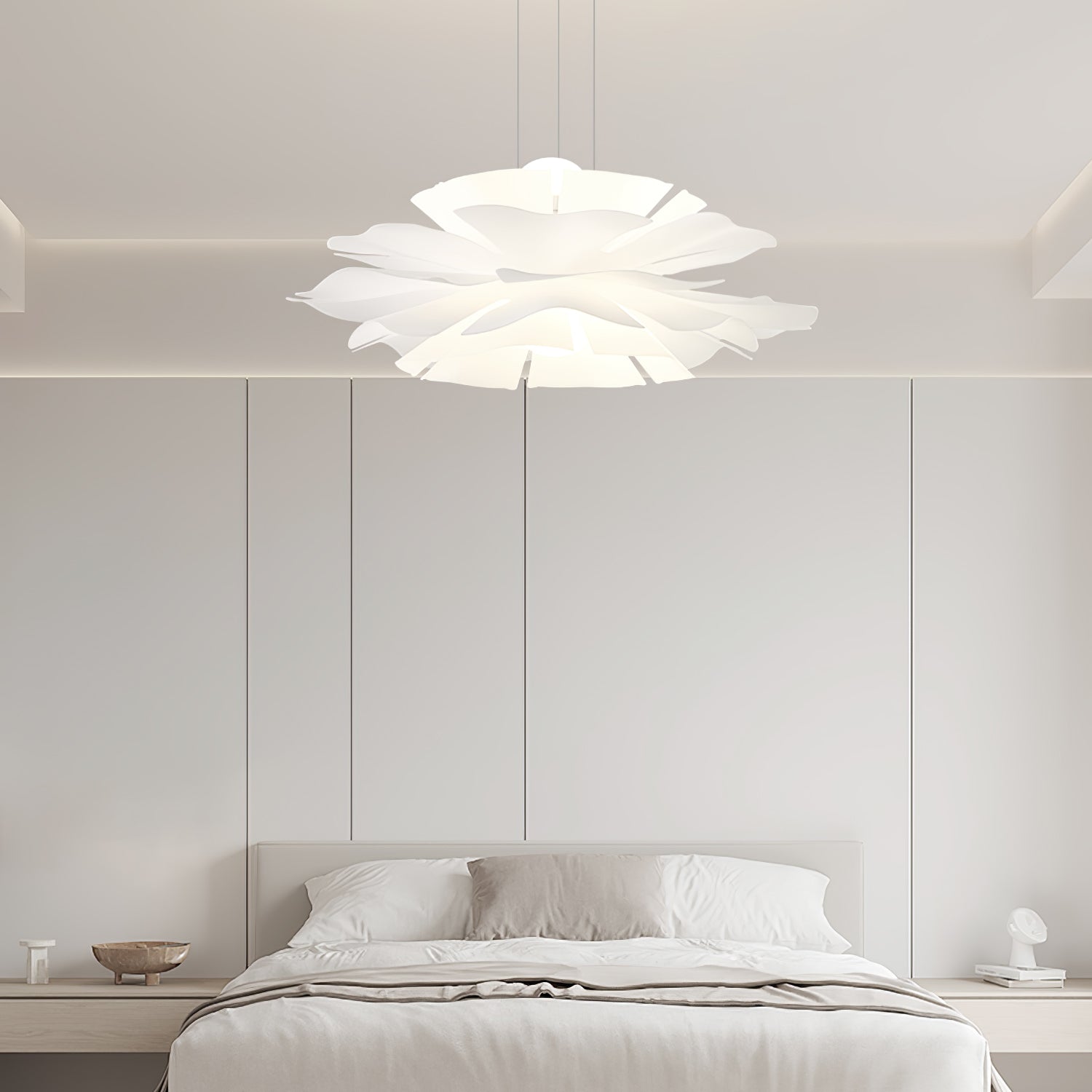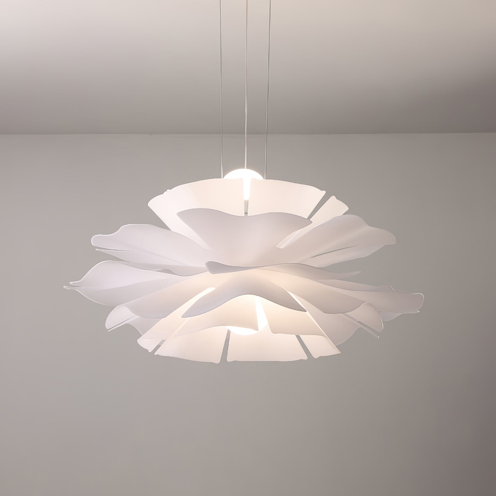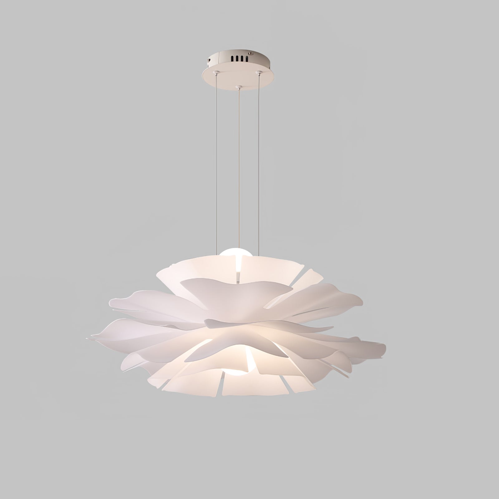 Lotus Flower -riippuvalaisin kiinnittää huomiosi välittömästi lootusmaisella muodollaan ja kiehtovalla muotoilullaan. Sen lämmin valkoinen viimeistely luo rauhoittavan tunnelman, kuin taivaalla kelluva pilvi. Täydellinen mihin tahansa moderniin asuintilaan.