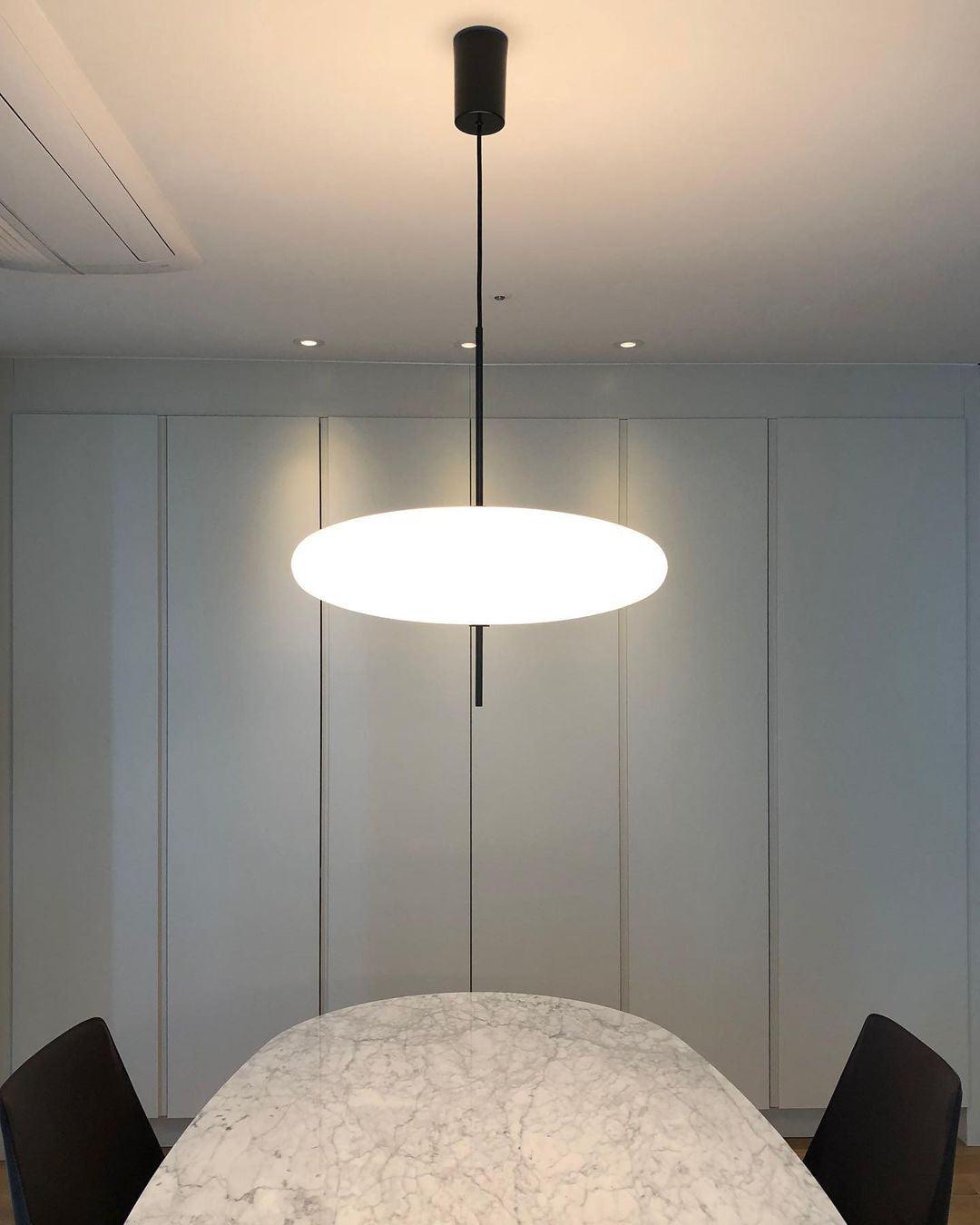 Malli 2065 koostuu kahdesta yhteen liitetystä opalisoivasta lautasesta tehdystä diffuusorista, joka on ripustettu kattoon mustaksi maalatulla alumiinikatoksella. Suunnittelijan elliptisen muotoilun yksinkertaisuus ja materiaalien keveys tekevät valaisimesta näennäisen painottoman.