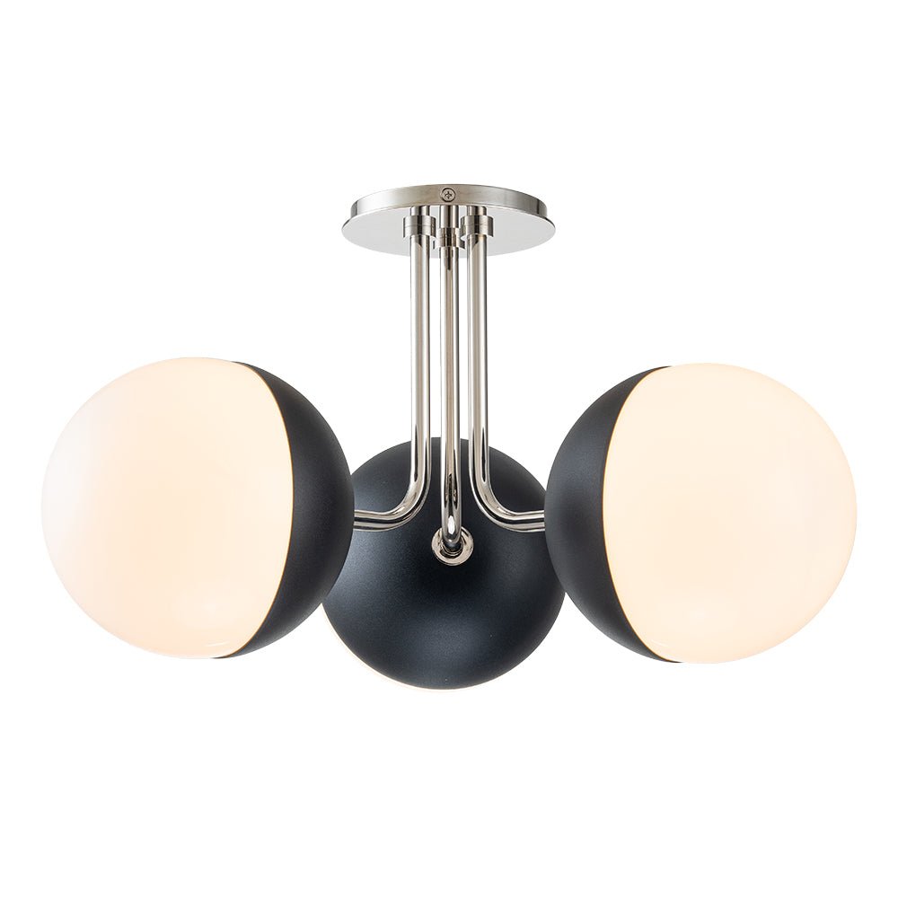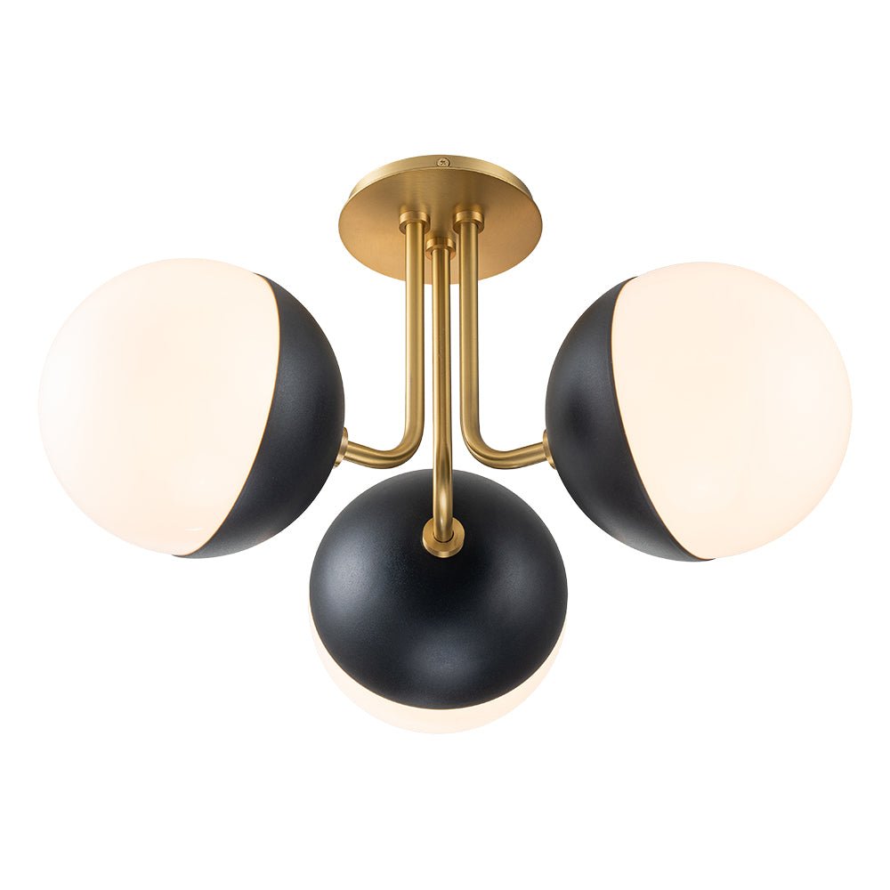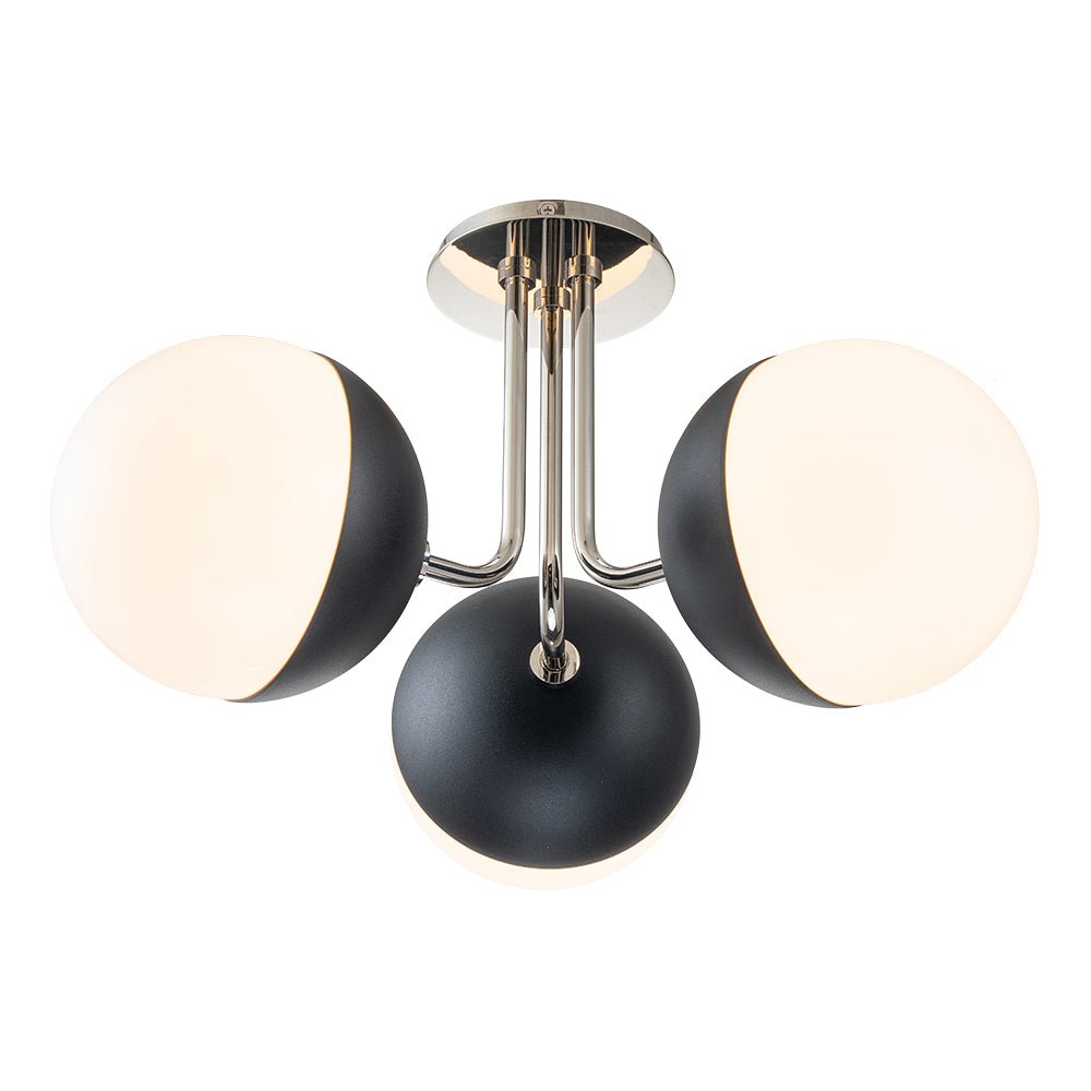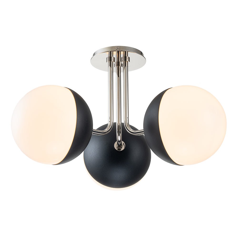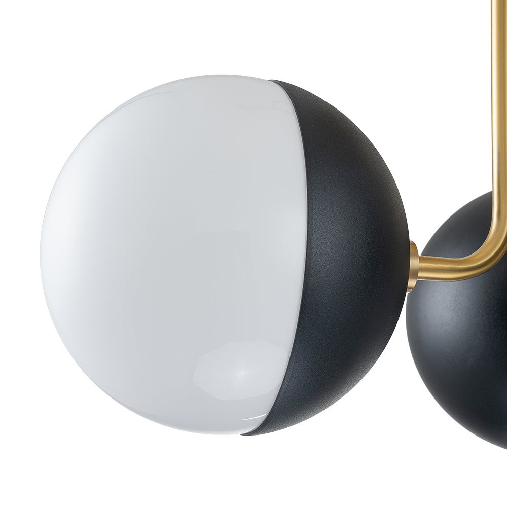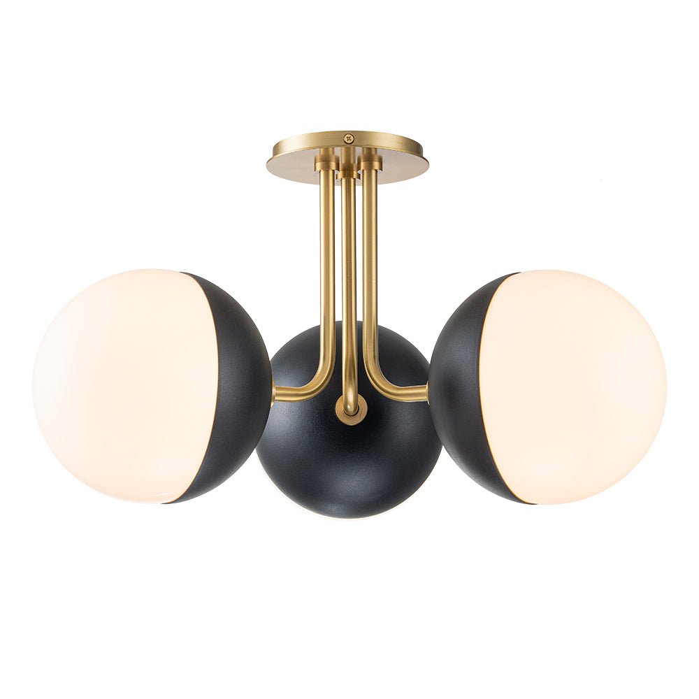Kolme valoa • Maidonvalkoinen lasi • Maapallon varjostimet • Kaarevat varret • Musta+messinki/nikkeliviimeistely • E26 Keskikantaiset polttimot (ei sisälly) • Kiinteä • UL-listattu