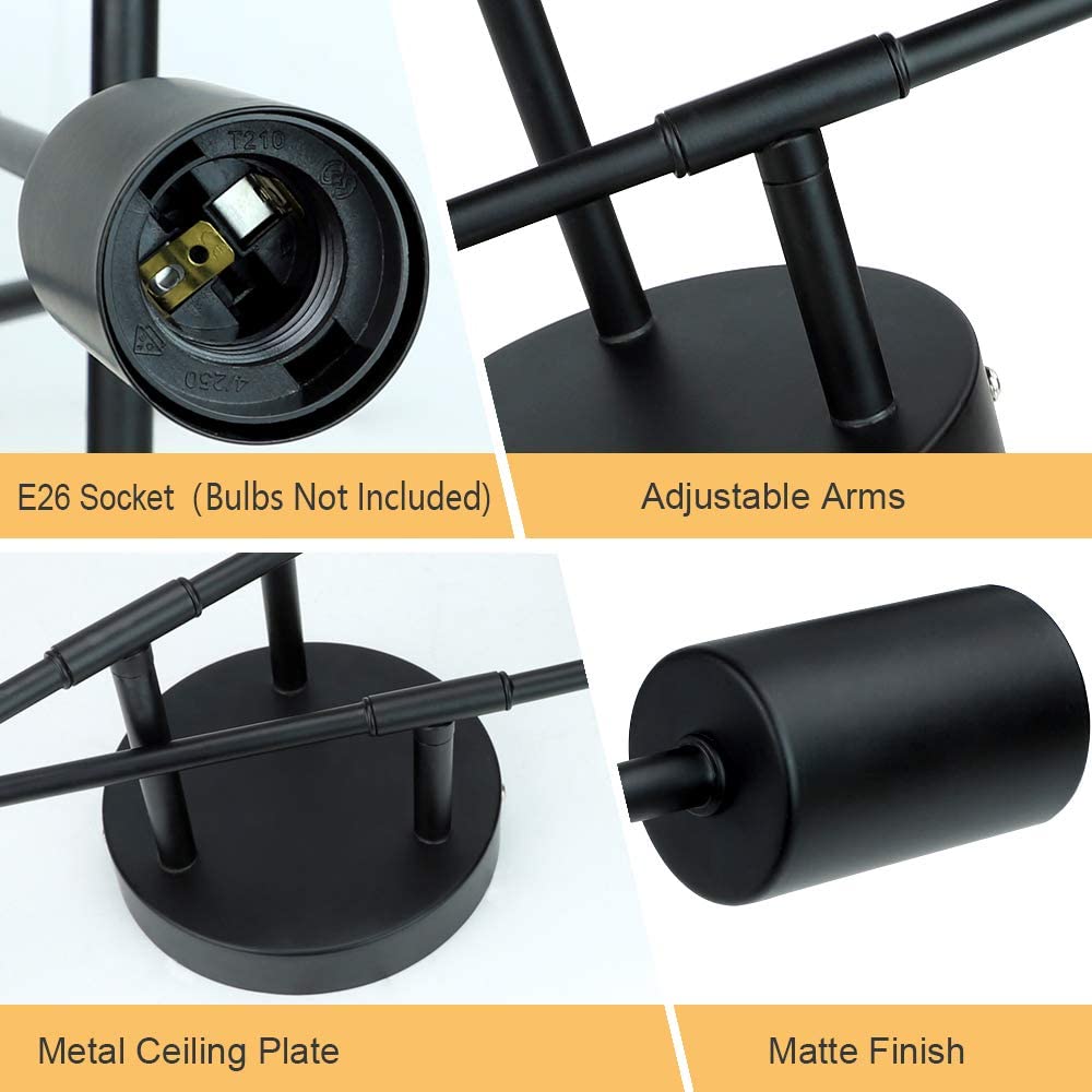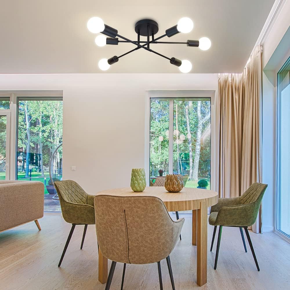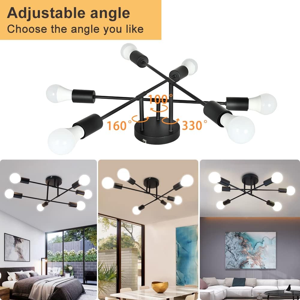DINGLILIGHTING Depuley 6-Light Vintage Industrial Sputnik -kattokruunulamppu, moderni säädettävä varsi, osittain uppoasennettava kattovalaisin ruokasaliin, olohuoneeseen, eteiseen, musta