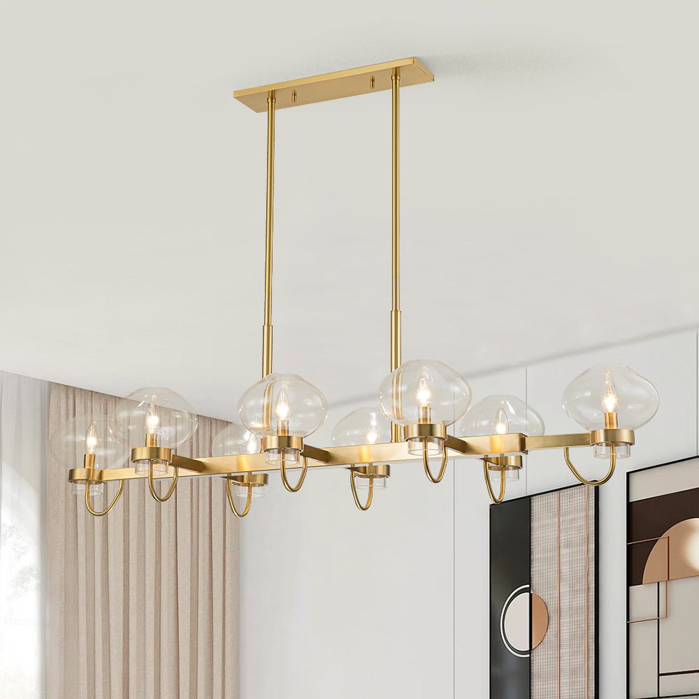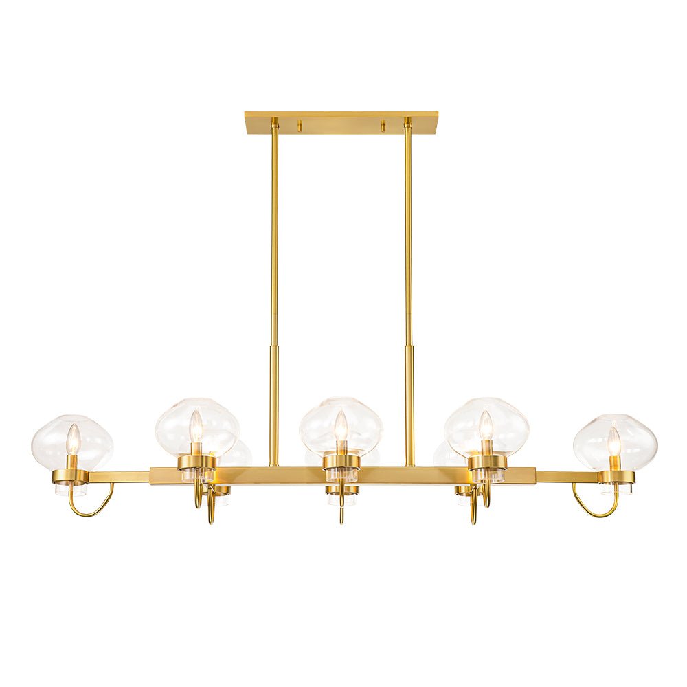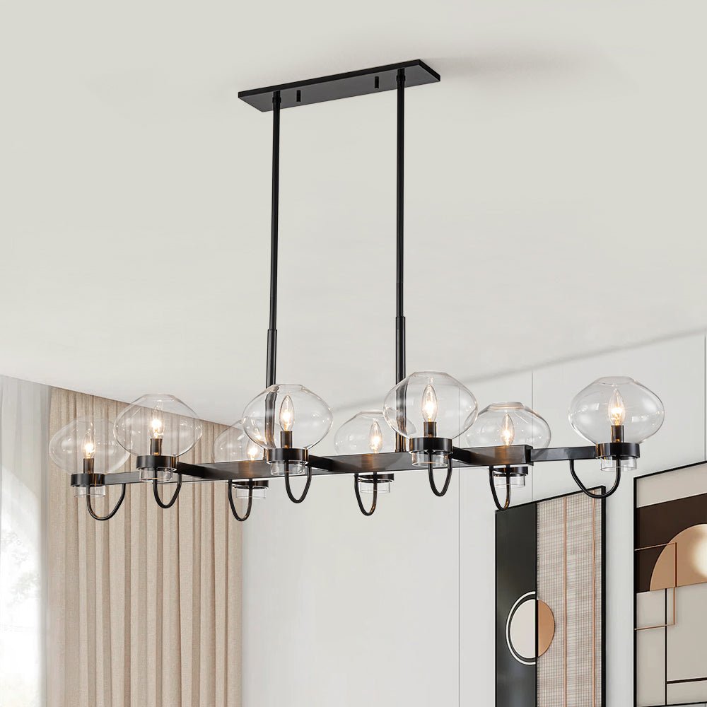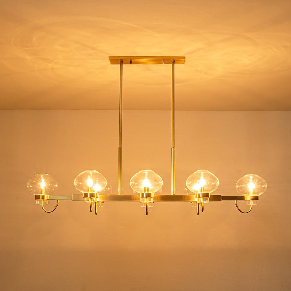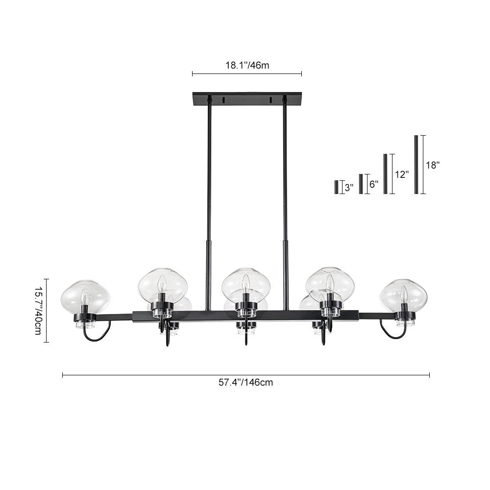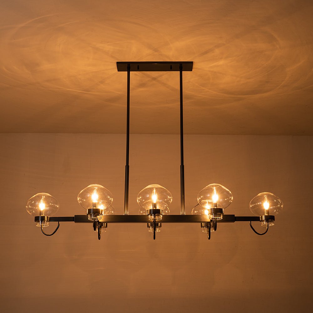 Antiikkilinnojen kynttilänvalaistuksesta inspiraation saaneessa keittiösaarekeriipusessamme on valloittava muotoilu, jossa on 8 kynttilätyylistä valopidikettä, joita tukevat tyylikkäästi kaarevat varret ja jotka on järjestetty vaakasuoraa lineaarista palkkia pitkin. Jokainen valonpidin on koristeltu kellomainen kirkas lasivarjostin, joka tarjoaa sekä viehätysvoimaa että suojaa E12 kynttelikköpolttimoille (ei sisälly), jotka lähettävät kirkasta ja kutsuvaa valaistusta. Galvanoitu messinkiviimeistely tuo nykyaikaisen vuosisadan puolivälin kosketuksen tähän saarikruunuun, kun taas öljyhierottu musta sävy lisää huippuluokan teollista estetiikkaa. Riippumatta siitä, ripustetaanpa keittiön työpöydän päälle, ruokasaliin tai olohuoneeseen, tämä 8-valon kynttilätyylinen lineaarinen kattokruunu tuo tilaan taitavan sekoituksen vintage-tyylikkyyttä ja nykyaikaista viehätystä.Tiedot