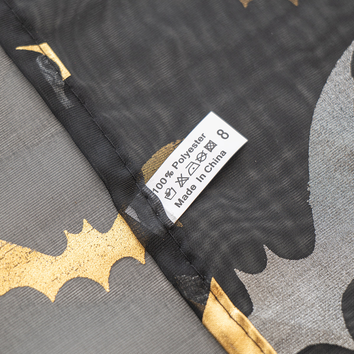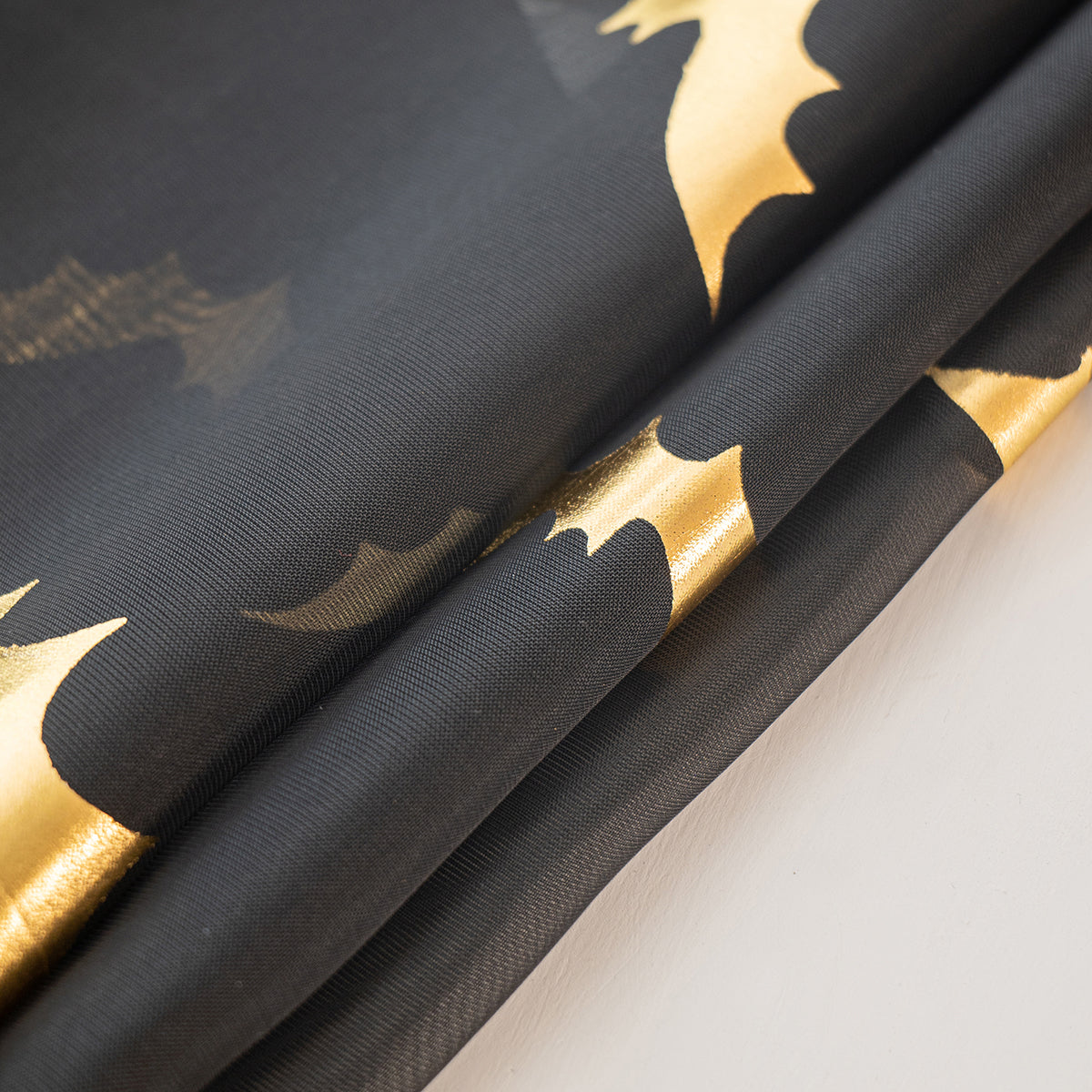 - Modernit mustat lepakkoprinttiverhot valmistetaan yleensä polyesterimateriaalista, joka on kevyt, hengittävä tekstiili, jota käytetään usein verhojen kankaana.
