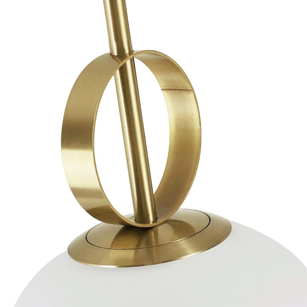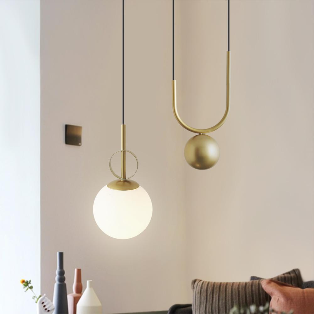 Maapallon riippuvalaisimemme hämmästyttää vieraasi. Metallisesta messingistä valmistettu riippuvalaisin koostuu pyöreästä kuomuksesta ja kolmesta puolisoikeasta kehyksestä, jotka luovat hienostuneen nostotasapainon. Yksi koristeellinen messinkipallo ja alla roikkuva opaalilasipallon varjostin täydentävät mallia. Tämä messinkiriippuvalaisin, johon mahtuu yksi 25 W G9-polttimo, antaa lämmintä hehkua opaalilasin läpi ja tarjoaa kodikkaan tunnelman. Tarvittaessa tämä nostopallo-riippuvalaisin tarjoaa myös himmeän valaistuksen himmenninkytkimellä ja himmennettävällä polttimolla (molemmat eivät sisälly toimitukseen). Säädettävän kaapelin ansiosta voit ripustaa tämän riippuvalaisimen sekä korkeaan että matalaan kattoon. Suosittelemme tämän messinkisen nostopallovalaisimen sijoittamista sängyn ja sohvan viereen tai olohuoneen sivupöydän päälle.Detail