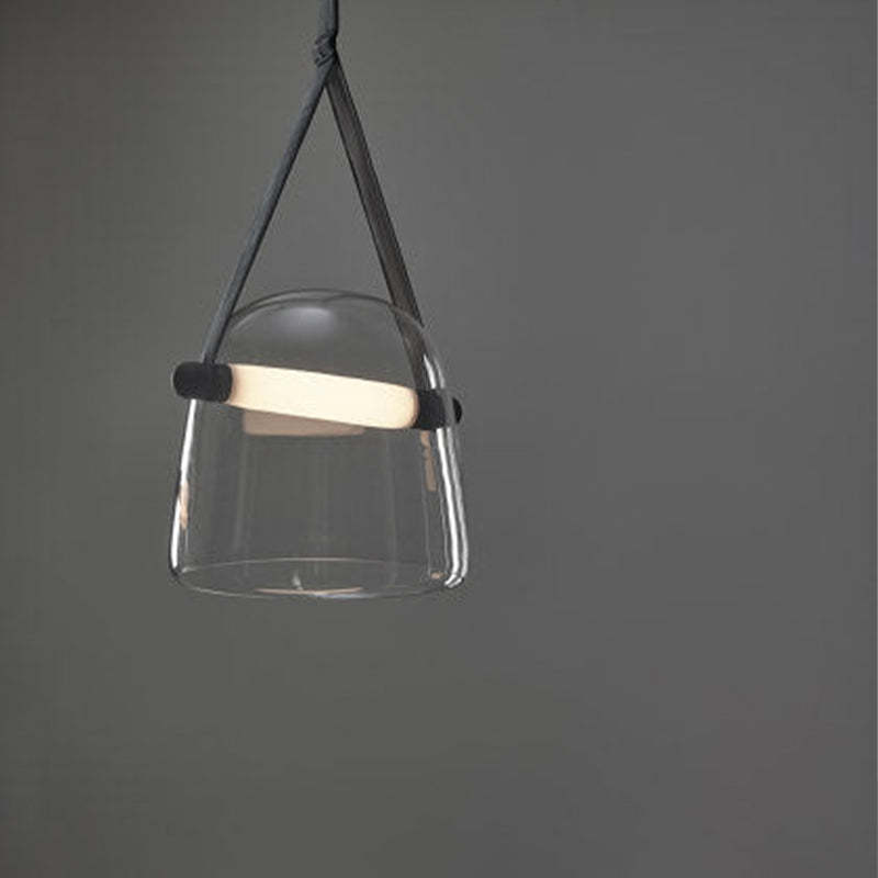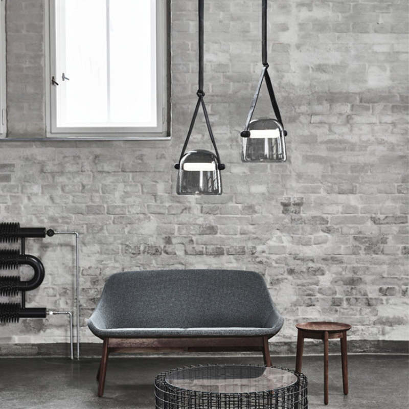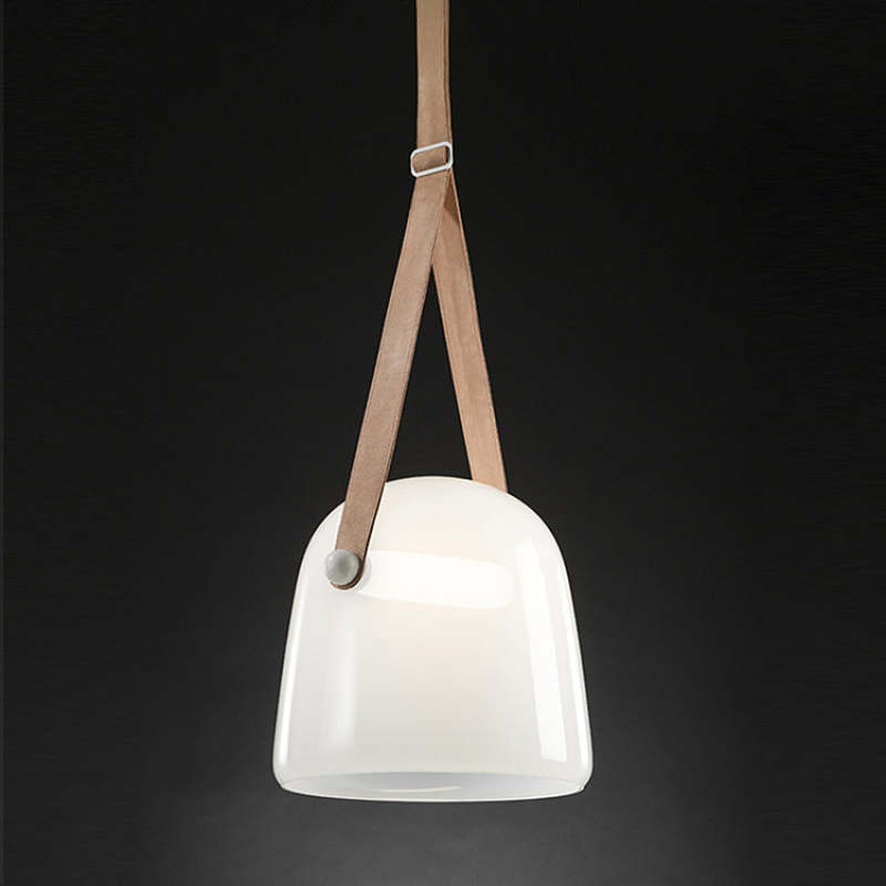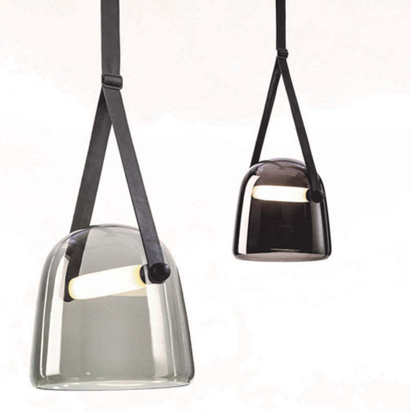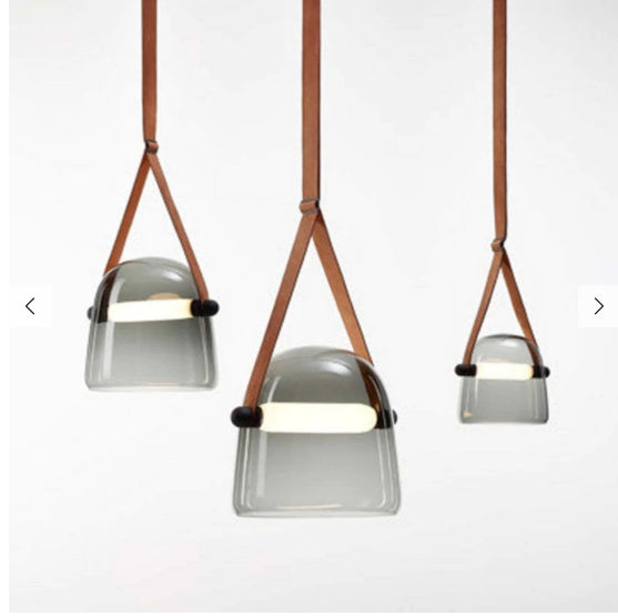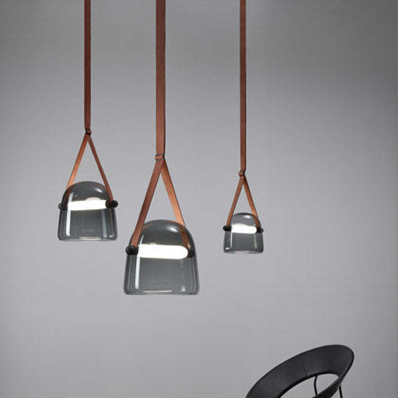 Modernisessa riippuvalaisimessa käytetään lasivarjostimia ja nahkaliuskoja yksinkertaisen ja kestävän ilmeen saamiseksi.