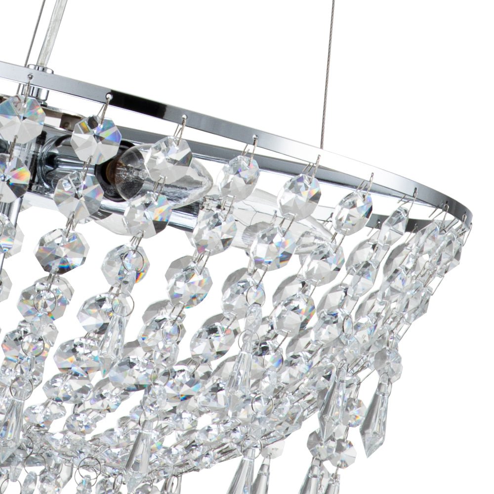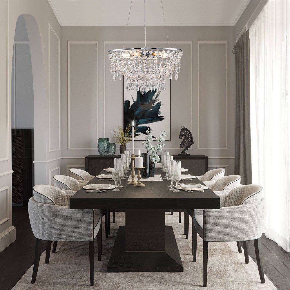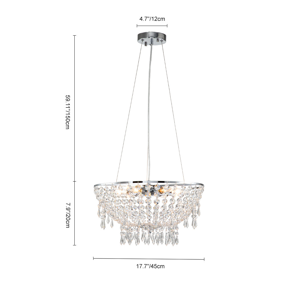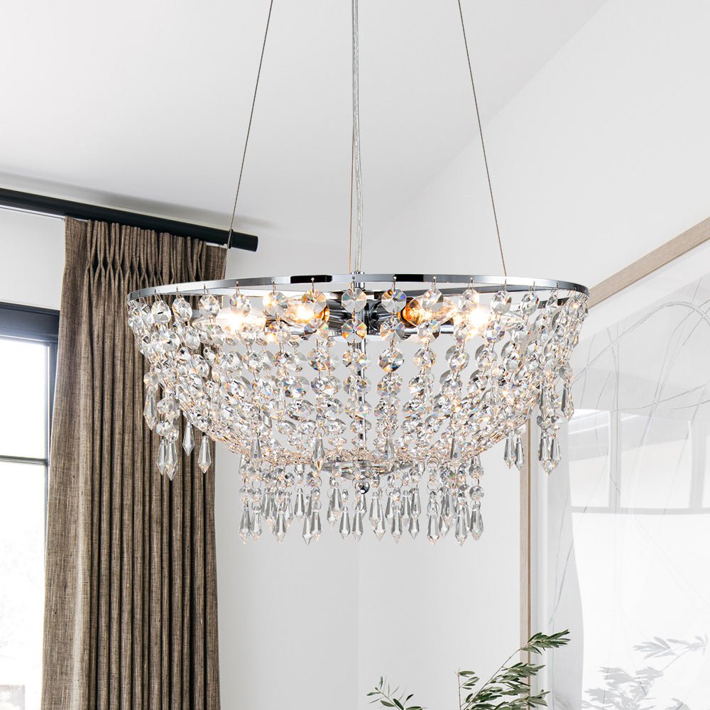 Täynnä ajatonta, kristallikoristeilla koristeltu kattokruunu antaa kodin sisustukselle aina tyylikkään ja ylellisen ilmeen. Tässä kiillotetulla kromilla viimeistellyssä kristallirengaskruunussa on kulhon muoto, joka koostuu viistetyistä kristallihelmistä, jotka leikkivät ihanina sadepisaroina. Sisällä on kuusi E12-polttimoa (ei sisällä), kun se on kytketty päälle, kromikristallikruunu kukoistaa kimaltelevaa valoa, joka vangitsee jokaisen sydämen. Tämä moderni kulhokristallikruunu sopii täydellisesti ruokailutilaan, olohuoneeseen ja eteiseen.Tiedot