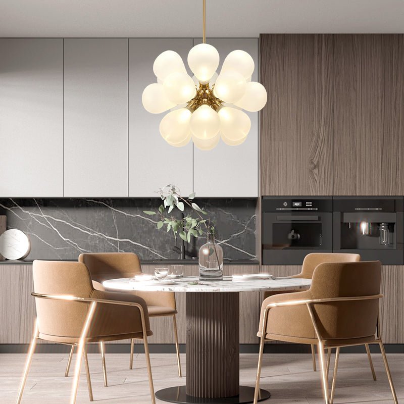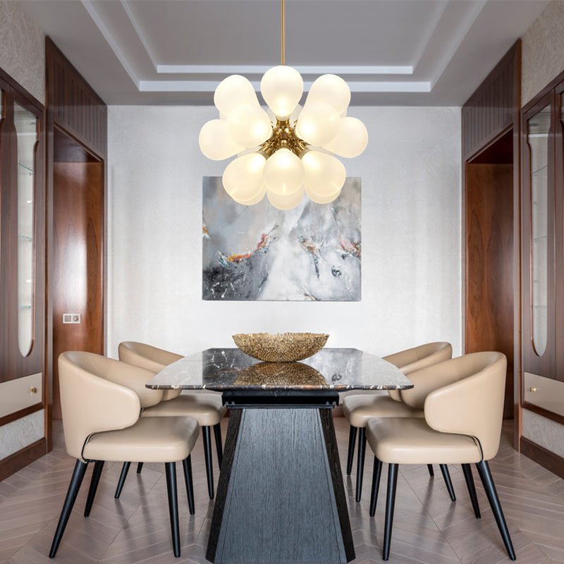 Ulkoasultaan hupaisa ja fantastinen, himmeä kuplakruunumme on ilmeikäs kotisi sisustukseen. Kultainen sputnik-tyyppinen keskus toimii kuplakoneena ja puhaltaa ulos 18 läpinäkyvää maitomaista kuplaa valokannoista. Tämä G9-polttimoiden (ei sisälly toimitukseen) mahtuva maapallokruunu valaisee upeaa tunnelmaa, kun se kytketään päälle. Voit myös käyttää himmennettäviä lamppuja ja himmentimen kytkintä valaistuksen säätämiseen. Suosittelemme, että ripustat tämän rypäleen himmeä lasikuplakattokruunu, joka tekee olohuoneesta, ruokailutilasta, eteisestä, sisäänkäynnistä tai aulasta tyylikkään.Detail
