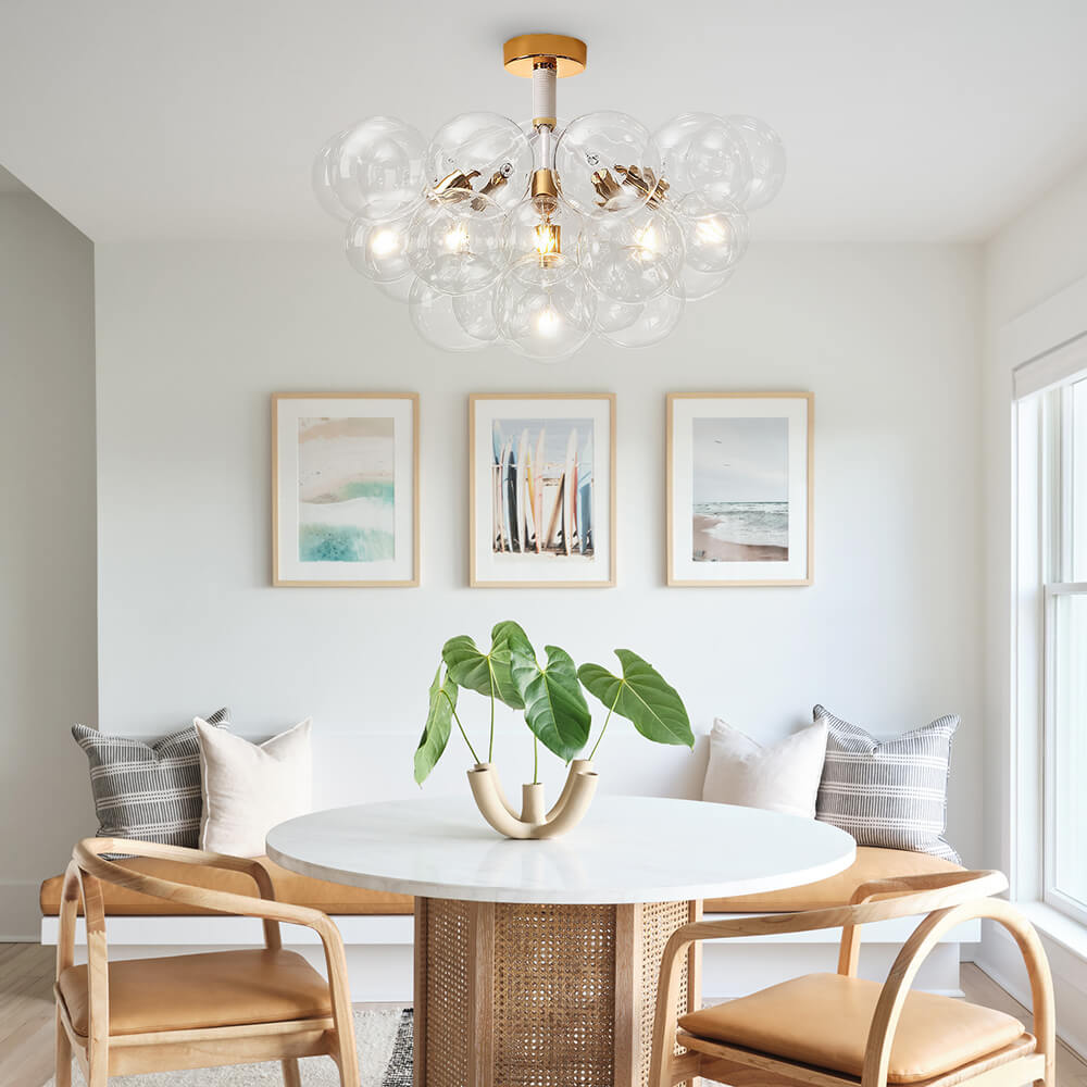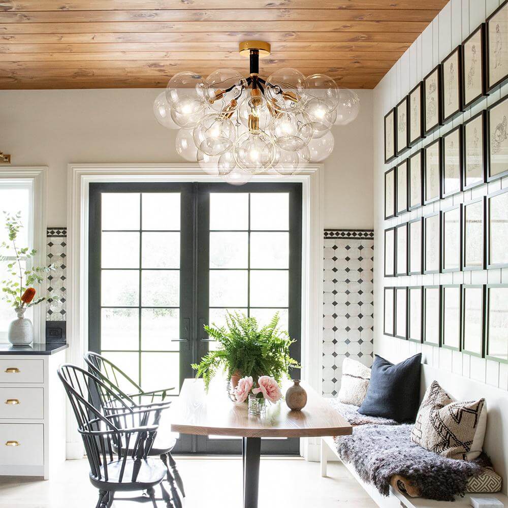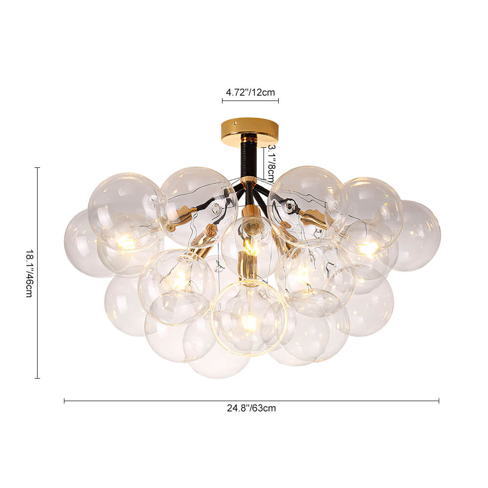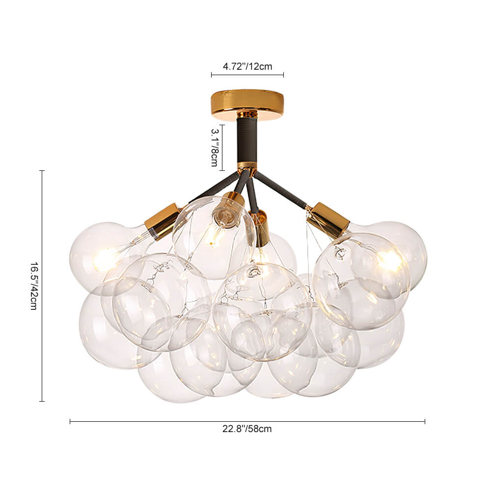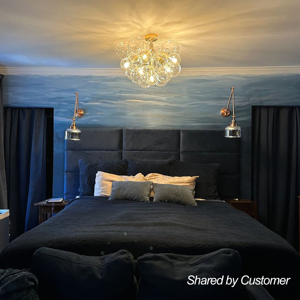 Tämä lasikuplakattokruunu on täydellinen valinta visuaalisen keskipisteen luomiseen ja tilan valaisemiseen. Se näyttää ylösalaisin käännetyltä lasiilmapallolta, joka leijuu ilmassa omituisesti. Tukeva metallitanko, jossa on useita varsia, jotka tukevat pallomaisia lasivarjostimia alaspäin, esittelee klusterin kattokruunua. Neljä tai kuusi 6 W LED G125 -lamppua lisää kirkkautta ja lisää fantasiatunnelmaa. Valon ja inspiraation lähteenä jokapäiväiseen elämääsi tämä lasikuplakruunu on upea lisä olohuoneeseen, ruokasaliin, eteiseen ja eteiseen.