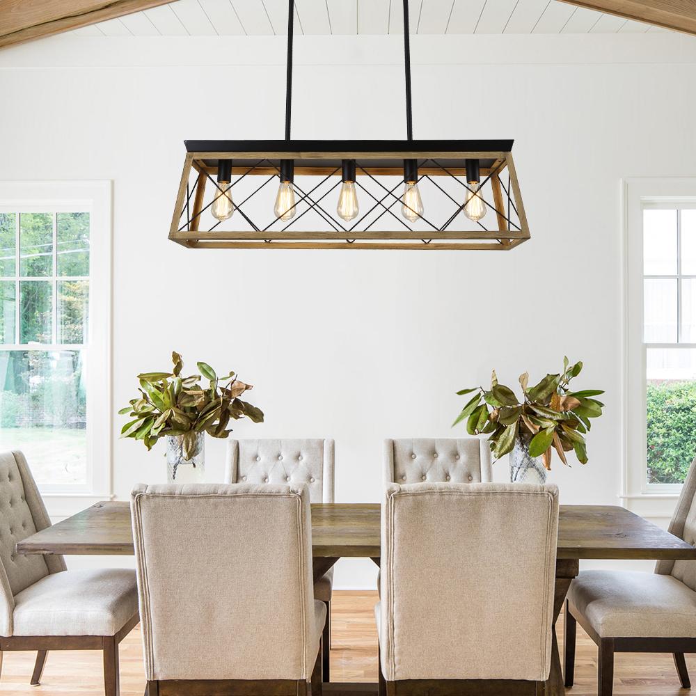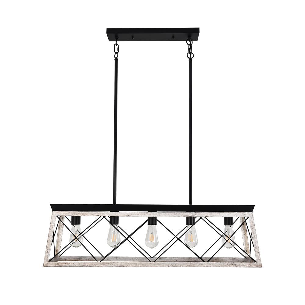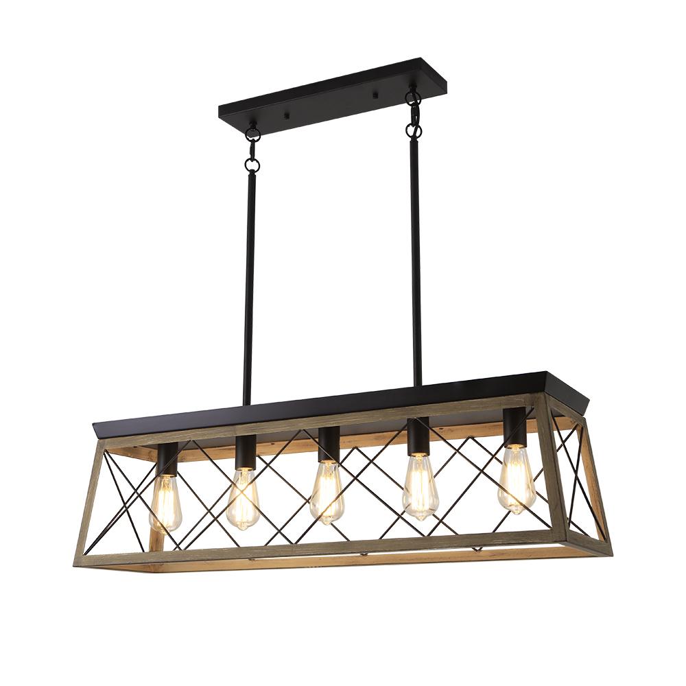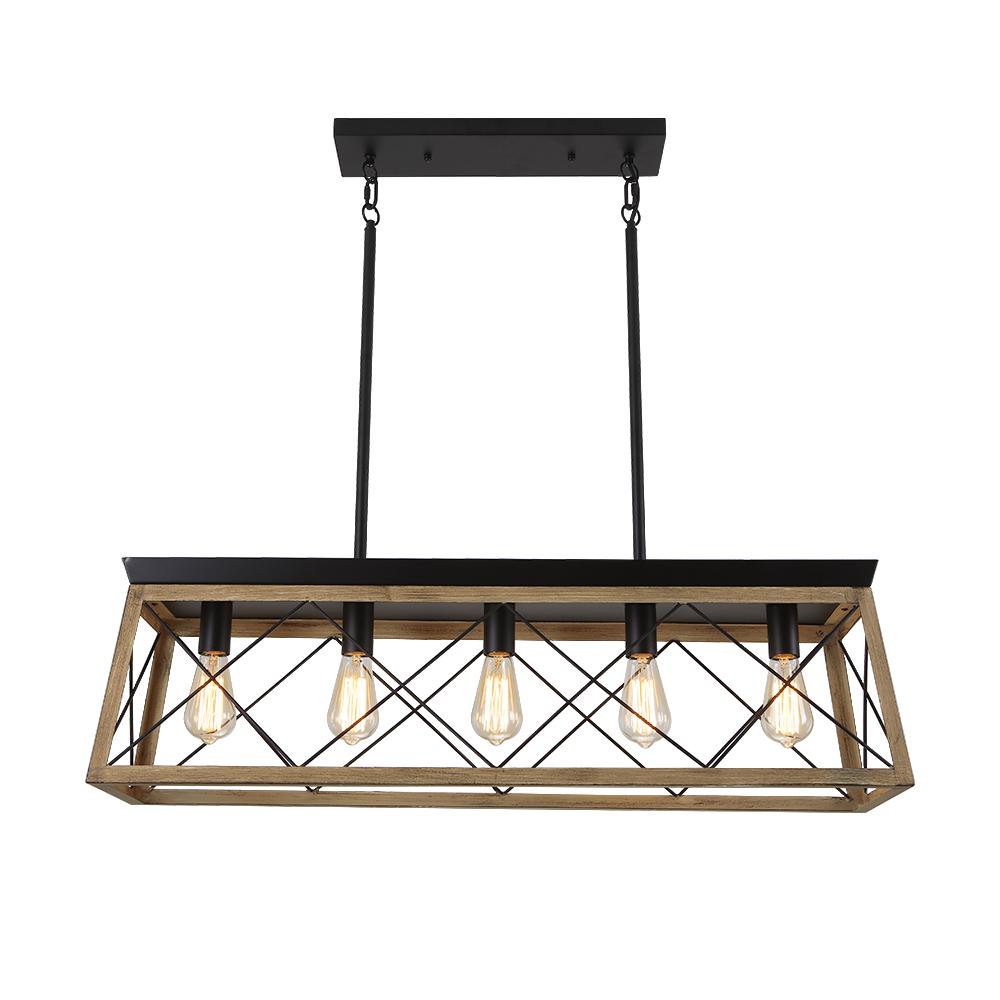 Brighten up your kitchen island, dining table, living room, or foyer with a cozy home mood by our 5-light kitchen island linear pendant. Crafted of metal that artfully creates a weathered faux wood accent, this modern farmhouse linear chandelier features an open-caged trapezium frame with X-brace patterns stretching across each side. Inside the peak sets five black metal light-bases to accommodate E26/E27 medium-base bulbs (not included). With each exposed bulb (not included) up to 40W, this 5-light kitchen island pendant directs plenty of warm glow to the surroundings. Two adjustable straight rods ensure this farmhouse linear chandelier could work well for both high and low ceilings. Round out your house with this 5-light kitchen island faux wooden linear pendant.