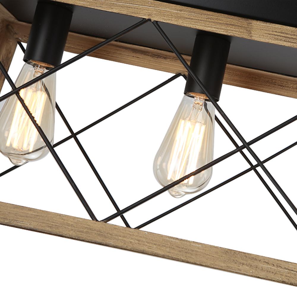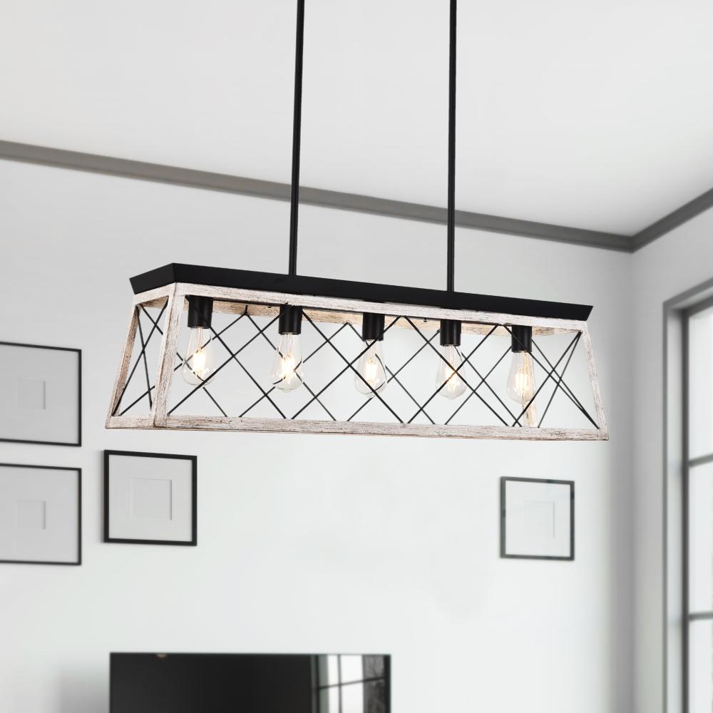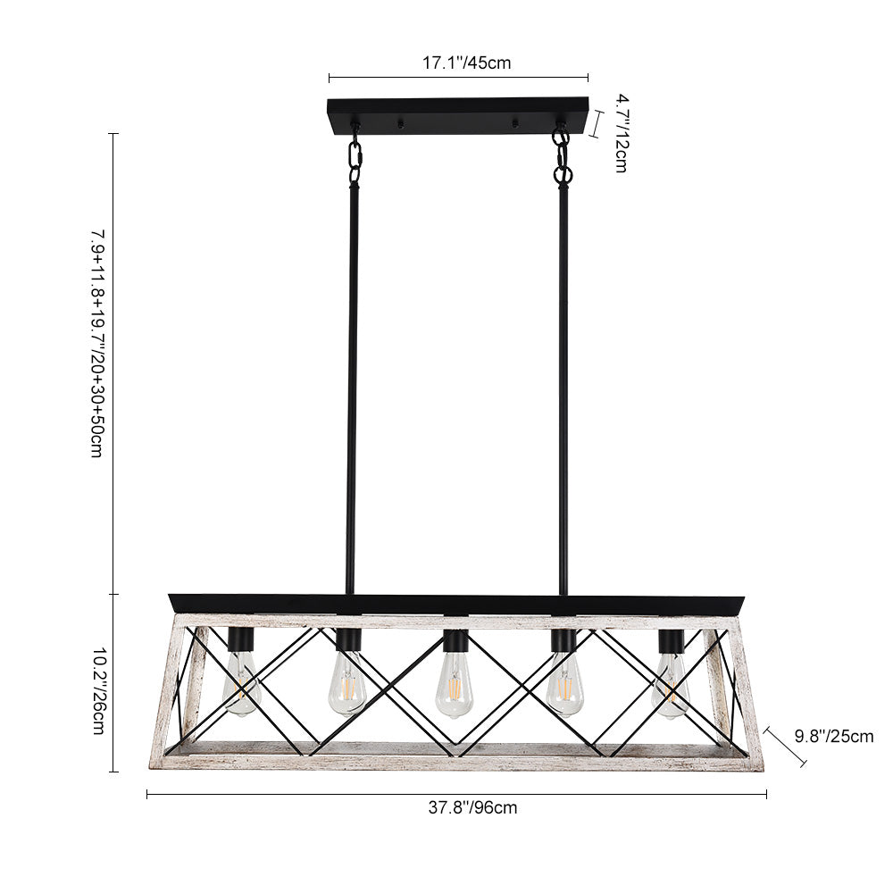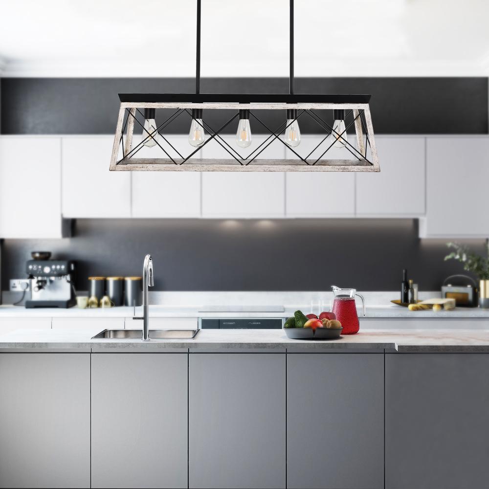Brighten up your kitchen island, dining table, living room, or foyer with a cozy home mood by our 5-light kitchen island linear pendant. Crafted of metal that artfully creates a weathered faux wood accent, this modern farmhouse linear chandelier features an open-caged trapezium frame with X-brace patterns stretching across each side. Inside the peak sets five black metal light-bases to accommodate E26/E27 medium-base bulbs (not included). With each exposed bulb (not included) up to 40W, this 5-light kitchen island pendant directs plenty of warm glow to the surroundings. Two adjustable straight rods ensure this farmhouse linear chandelier could work well for both high and low ceilings. Round out your house with this 5-light kitchen island faux wooden linear pendant.