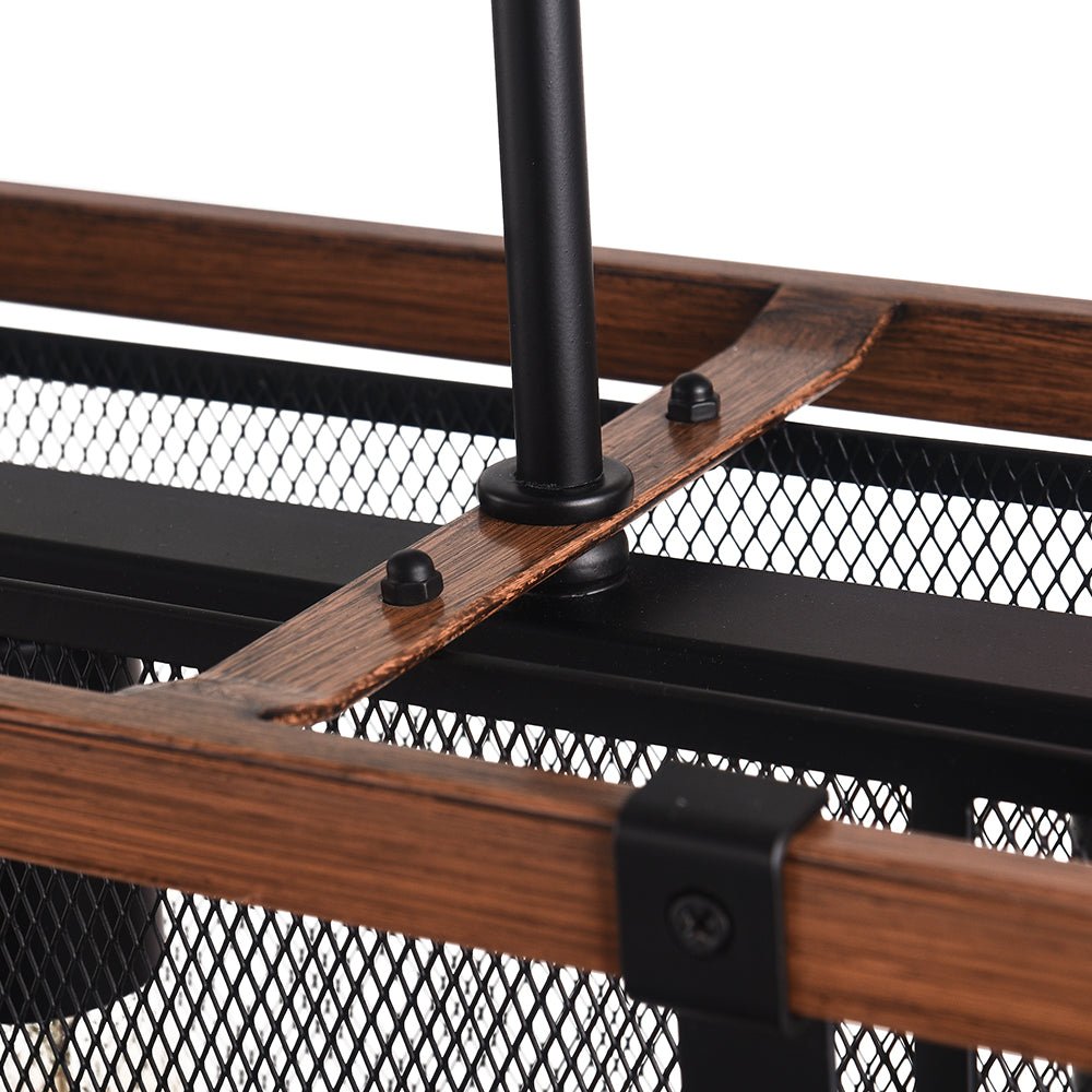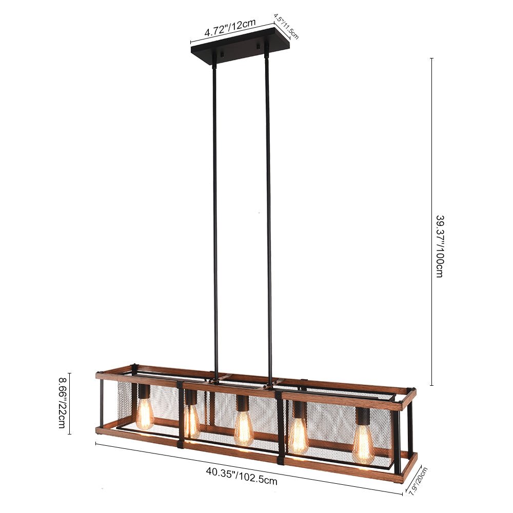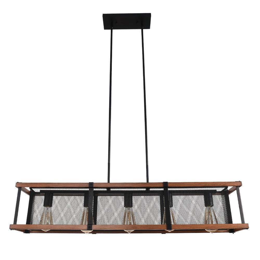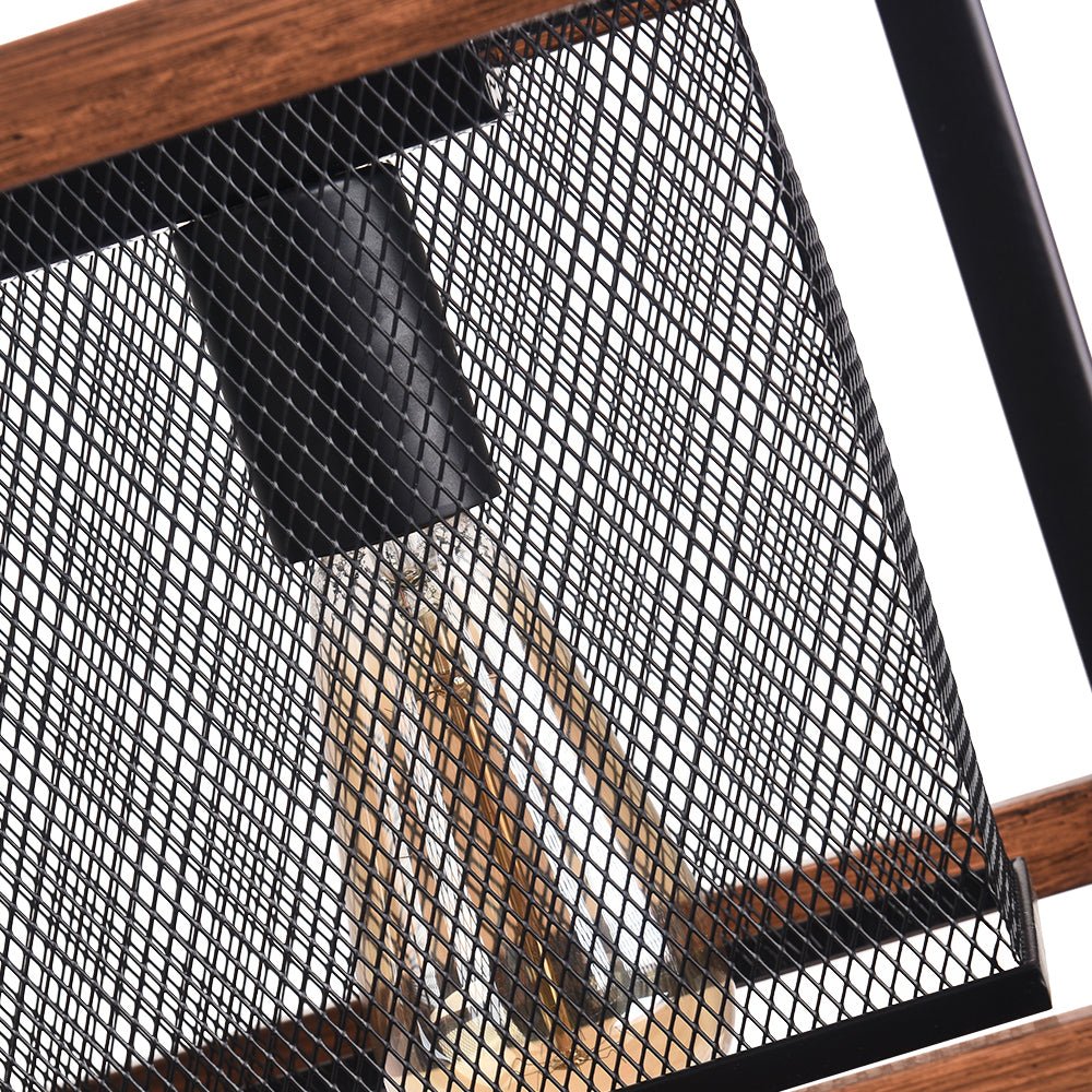 Viisi valoa • Suorakaiteen muotoinen runko • Verkkorakenne • Musta + puumainen viimeistely • E26 keskipitkät polttimot (ei sisälly) • Kiinteä • UL-listattu
