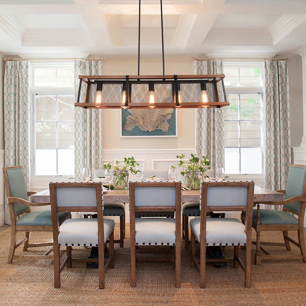 Metallista valmistettu tekopuinen suorakaidekehys luo korkean tason maalaismaisen luonteen tähän keittiösaarekeriipukseen. Kehystä ympäröi musta verkko, joka suodattaa valaistuksen ja jakaa häikäisemättömän valaistuksen silmiesi lohduttamiseksi. Mattamusta ja ruskea viimeistely antavat teollisen ja vintage-vaikutelman tähän lineaariseen kattokruunuun. Suosittelemme tämän modernin maalaistalon metallisen suorakaiteen muotoisen kattokruunun ripustamista keittiötason, pitkän pöydän tai olohuoneen yläpuolelle.Tiedot