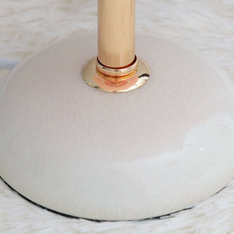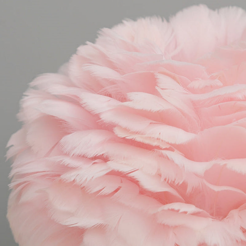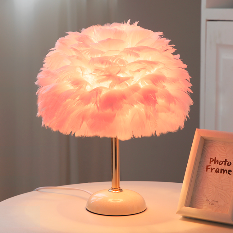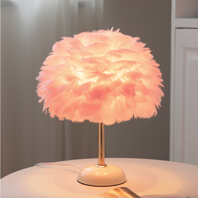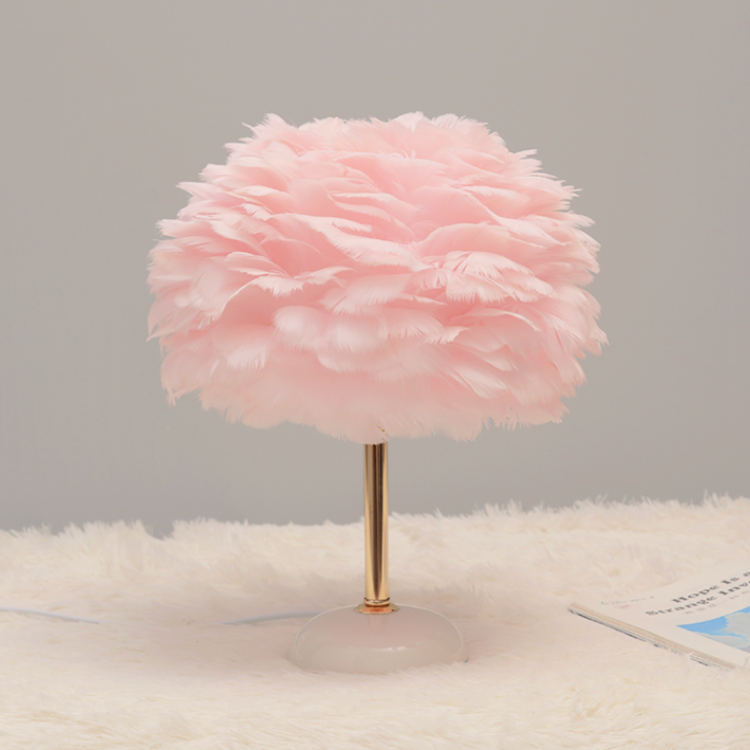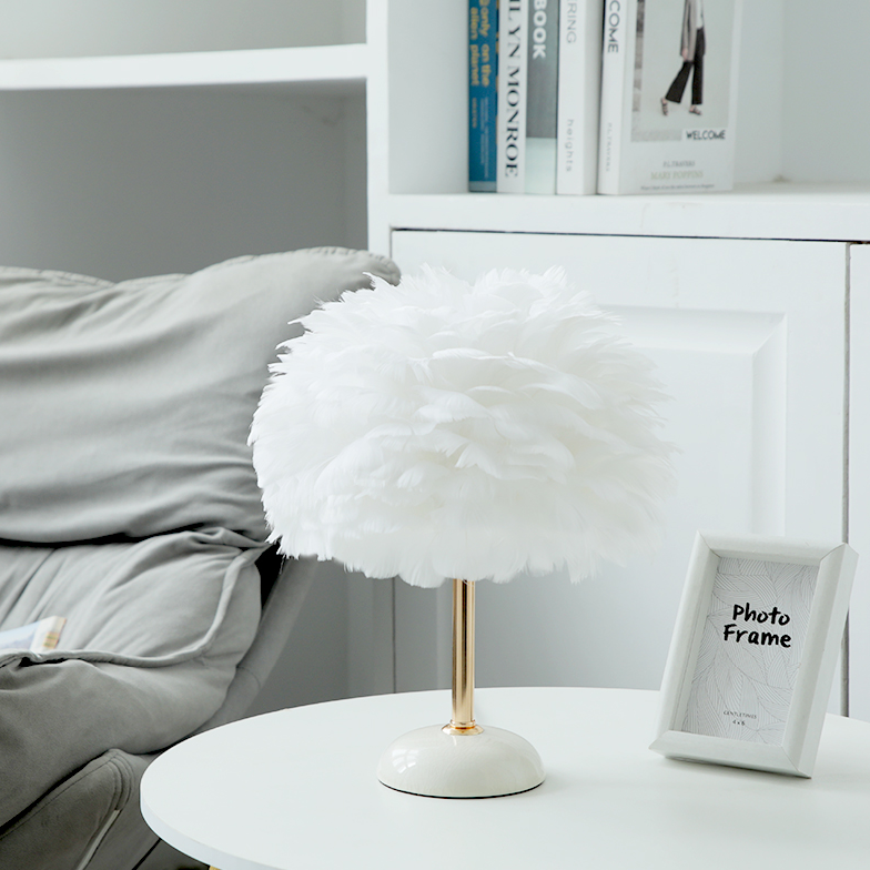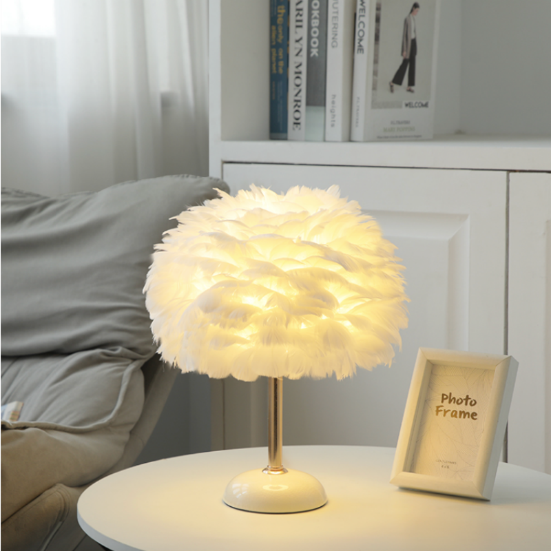 Tämä lamppu on valmistettu korkealaatuisista materiaaleista, ja siinä on pyöreä (murskattu) lasijalusta ja upea höyhenvarjostin, joka tarjoaa pehmeän ja lämpimän hehkun luoden kodikkaan ja kutsuvan tunnelman.