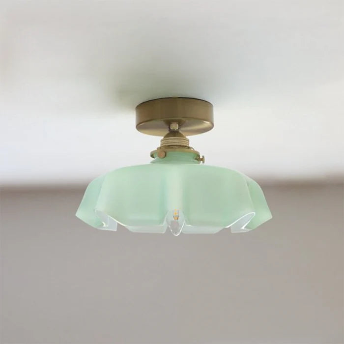 Kukkapuoli upotettava kattovalaisin on valmistettu lasin ja metallin materiaalien yhdistelmästä. Kukkien muotoinen lampunvarjostin on valmistettu lasista ja sen muoto on herkkä luoden viehättävän visuaalisen vaikutelman. Metalliosat, kuten pohja ja runko, tarjoavat rakenteellista tukea ja edistävät valaisimen yleistä estetiikkaa. Lasin ja metallin elementtien harmoninen yhdistelmä lisää muotoiluun ripauksen eleganssia ja hienostuneisuutta.