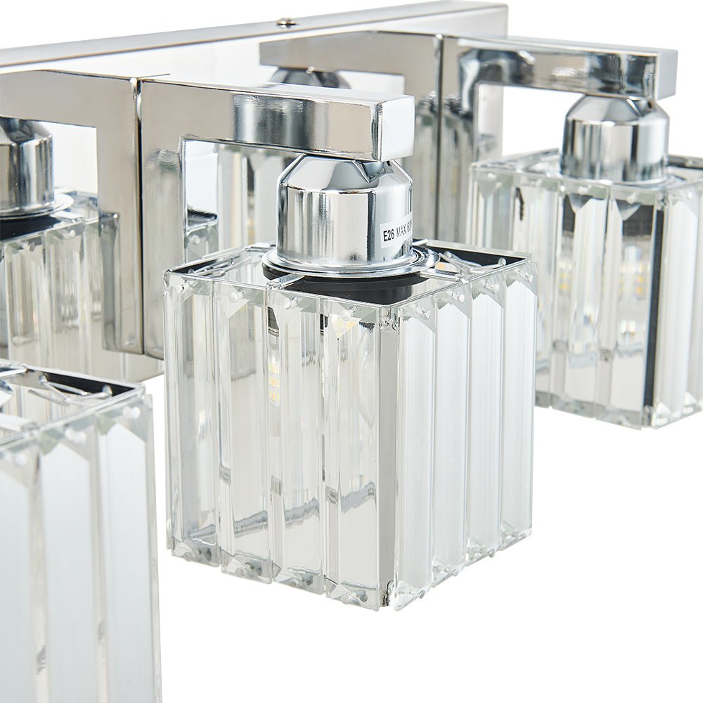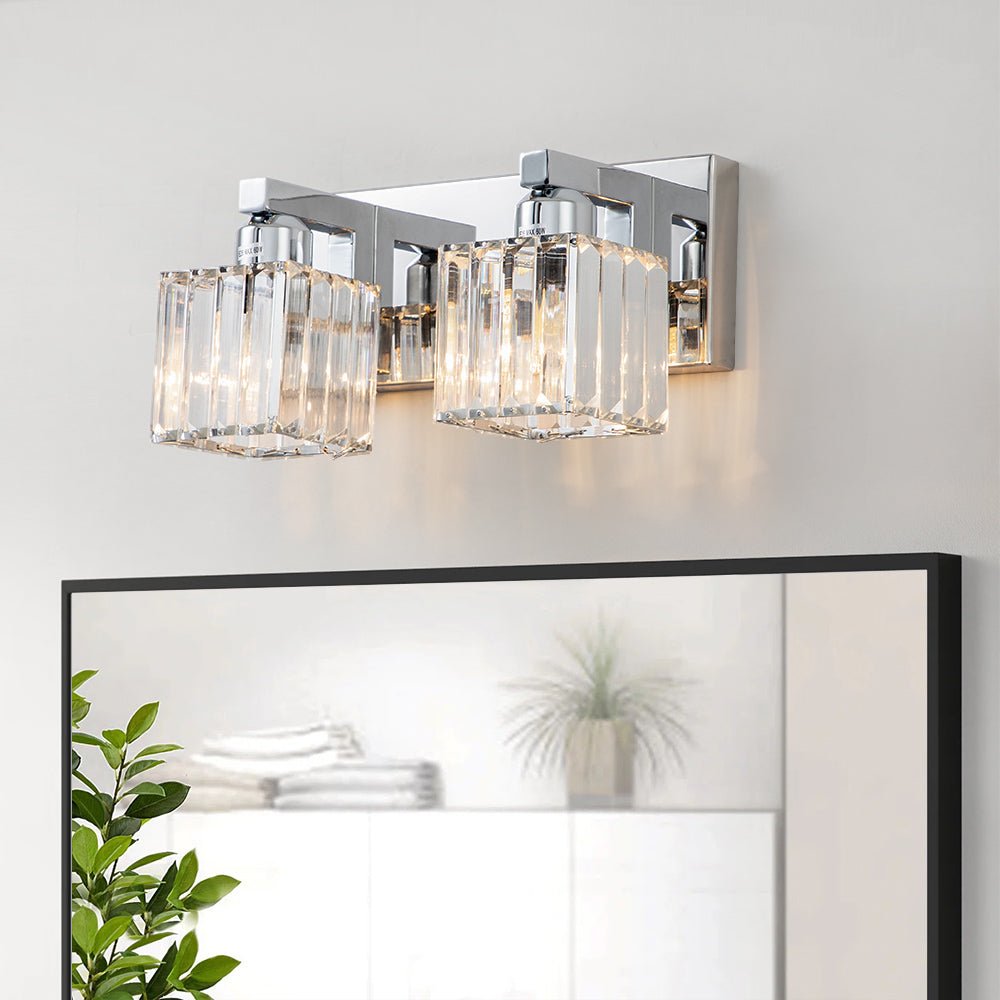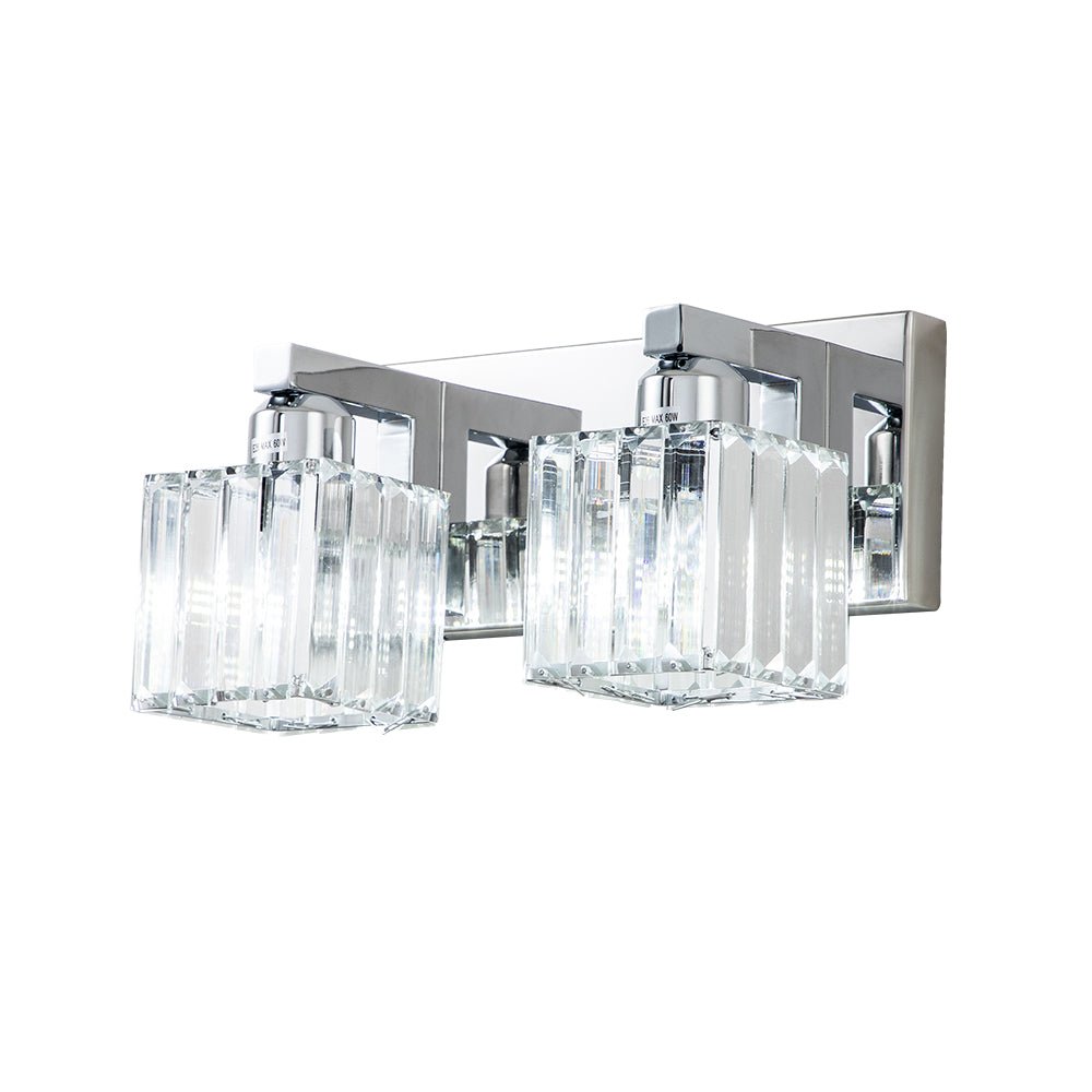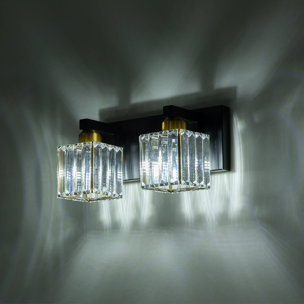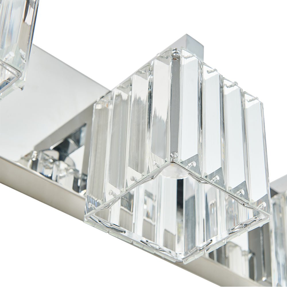 Timanttien tavoin kimalteleva kristalli-seinävalaisin on upea lisä kylpyhuoneeseen, pesualtaan, turhamaisuuteen, pukeutumistilaan tai olohuoneeseen. Suorakaiteen muotoisen taustalevyn ja kulmavarsien tukemana pyöritettävät neliömäiset varjostimet on valmistettu K9-kristallista. Kiillotettu kromiviimeistely lisää loistoa ja viehätysvoimaa tähän meikkivalaistukseen, kun taas musta ja kultainen viimeistely tuo ilmeeseen loistoa. Mukana E26-pohjaiset polttimot (ei sisällä), tämä kristallikylpyhuoneen meikkivalaisin näyttää tyylikkään ja loistavan tuloksen aina, kun käännät valokytkimen päälle.Detail